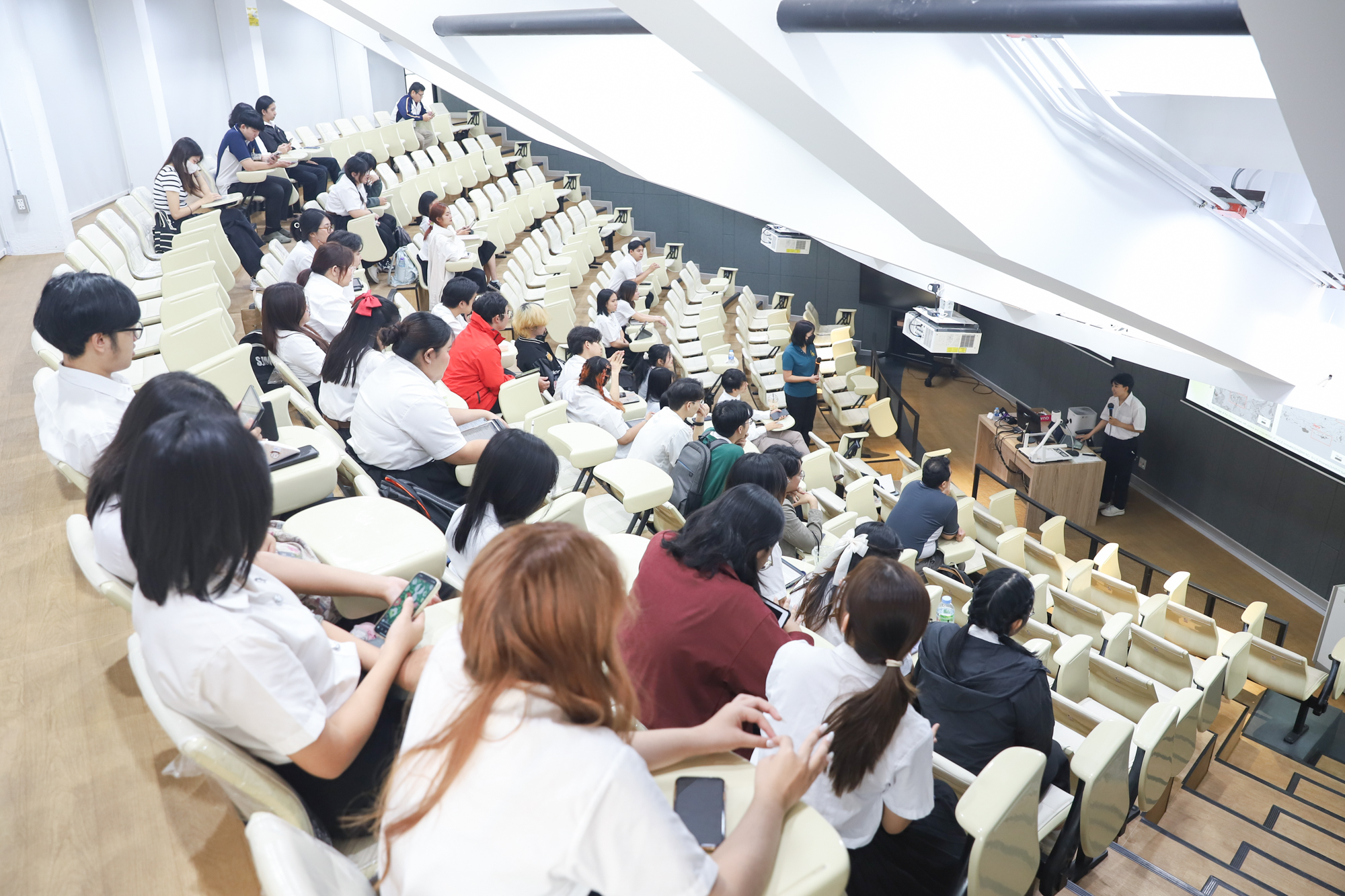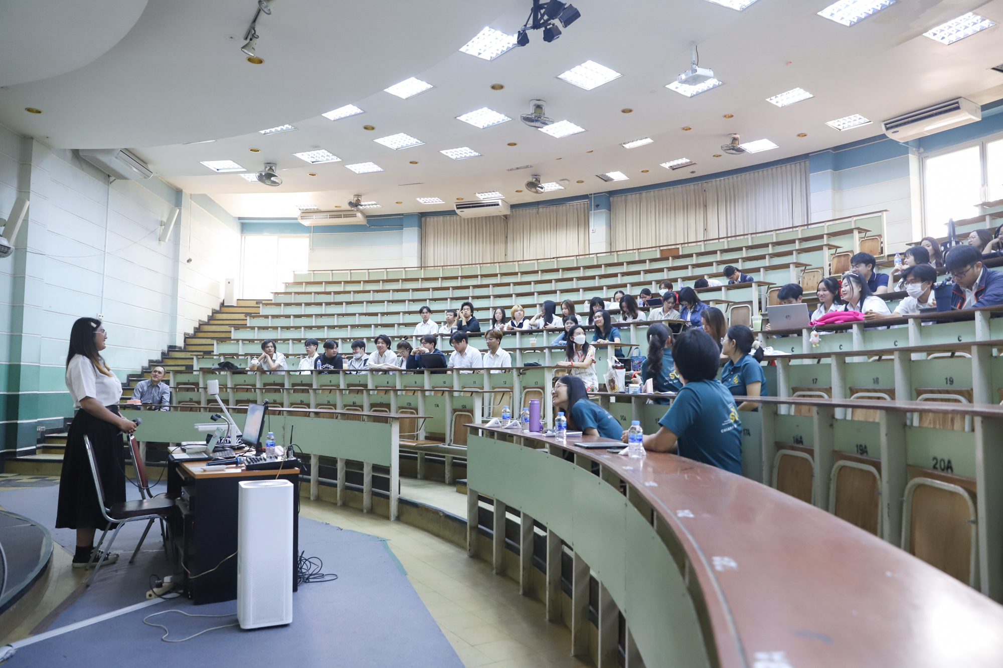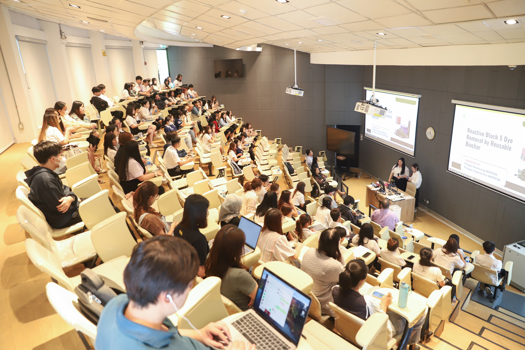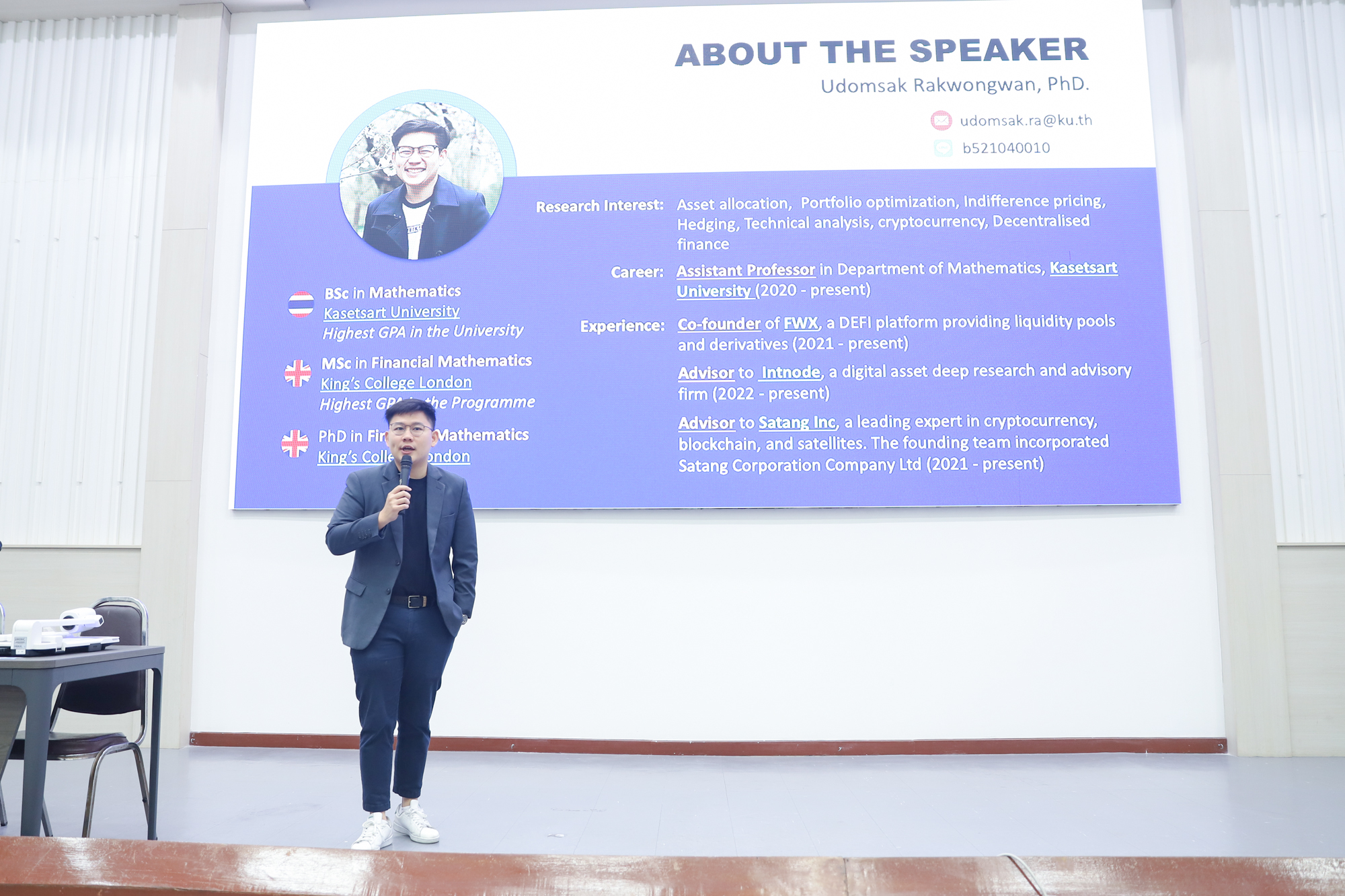 คณะวิทยาศาสตร์จัดกิจกรรมกิจกรรมนำเสนอผลงานวิชาการและสหกิจศึกษาของนักศึกษาระดับปริญญาตรี ชั้นปีที่ 4 ในวันที่ 5 มีนาคม 2568 โดยได้รับเกียรติจาก ศาสตราจารย์ (เชี่ยวชาญพิเศษ) ดร.ธรณินทร์ ไชยเรืองศรี คณบดีคณะวิทยาศาสตร์ เป็นประธานเปิดกิจกรรม และผู้ช่วยศาสตราจารย์ ดร.อุดมศักดิ์ รักษ์วงวาน อาจารย์ประจำคณะวิทยาศาสตร์ มหาวิทยาลัยเกษตรศาสตร์ Co founder บริษัท Forward และเจ้าของเพจ ติดเล่าเรื่องลงทุน ให้เกียรติเป็นวิทยากรการบรรยาย เรื่อง “AI for Every Career: ทักษะดิจิทัลที่คนทำงานยุคใหม่ต้องมี” ณ ห้องบรรยาย SCB2100 ชั้น 1 อาคาร 40 ปี คณะวิทยาศาสตร์ โดยภายหลังจากการบรรยายเสร็จสิ้น นักศึกษาได้นำเสนอผลงานแบบบรรยาย โดยแบ่งเป็น 4 กลุ่ม ดังนี้