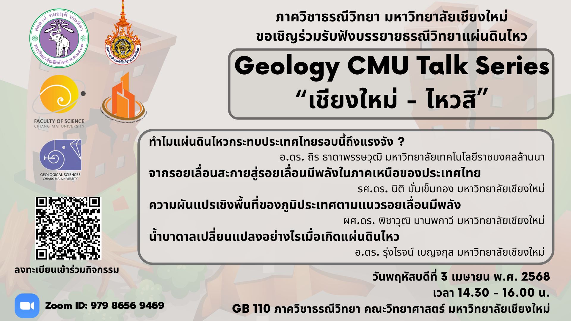 เชียงใหม่-ไหวสิ Geology CMU Talk Series ภาควิชาธรณีวิทยา ขอเชิญทุกท่านร่วมรับฟังบรรยายธรณีวิทยาแผ่นดินไหว 3 มี.ค. 68