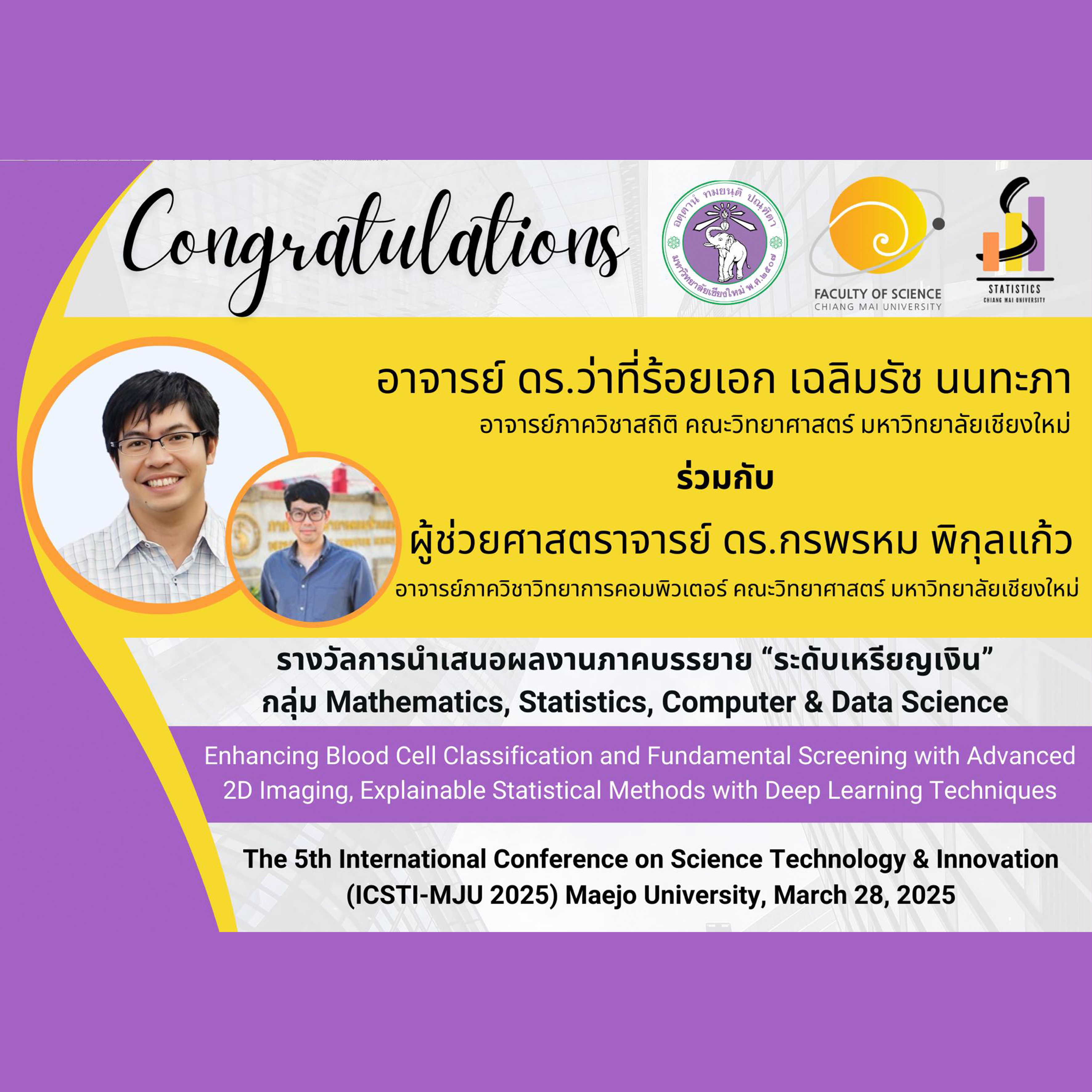 อาจารย์ ดร.ว่าที่ร้อยเอก เฉลิมรัช นนทะภา (ภาควิชาสถิติ) และผู้ร่วมวิจัย ผู้ช่วยศาสตราจารย์ ดร.กรพรหม พิกุลแก้ว (ภาควิชาวิทยาการคอมพิวเตอร์) ได้รับรางวัลการนำเสนอผลงานภาคบรรยาย “ระดับเหรียญเงิน” กลุ่ม Mathematics, Statistics, Computer & Data Science จากผลงาน หัวข้อ "Enhancing Blood Cell Classification and Fundamental Screening with Advanced 2D Imaging, Explainable Statistical Methods with Deep Learning Techniques" ในงานประชุมวิชาการระดับนานาชาติ The 5th International Conference on Science Technology & Innovation (5th ICSTI-2025) วันที่ 28 มีนาคม 2568