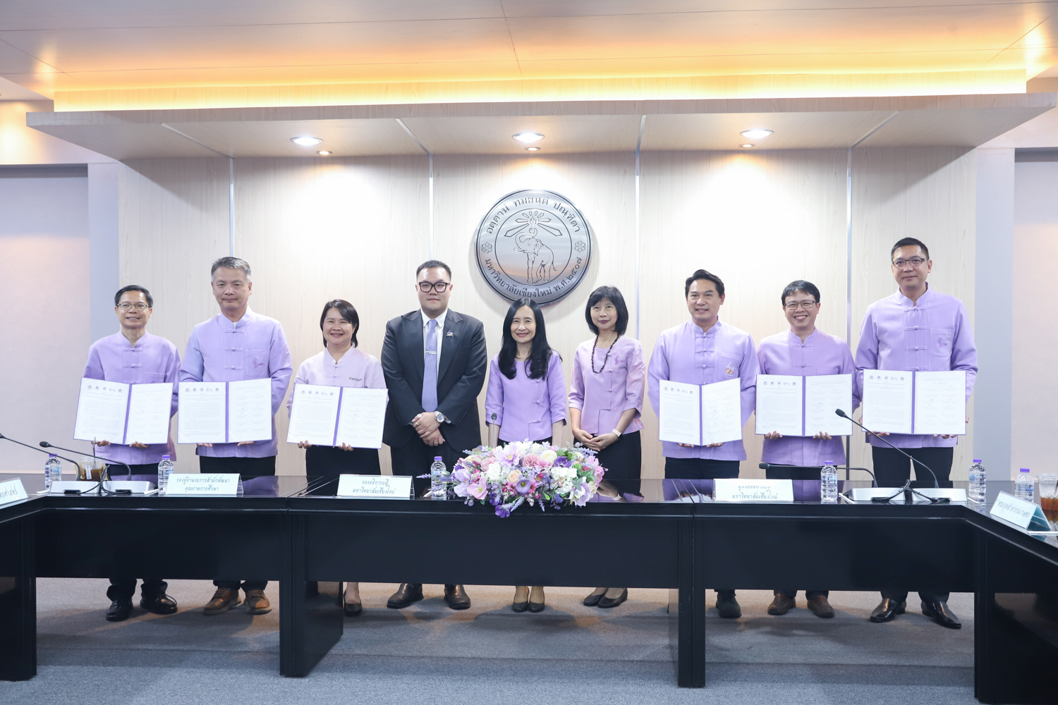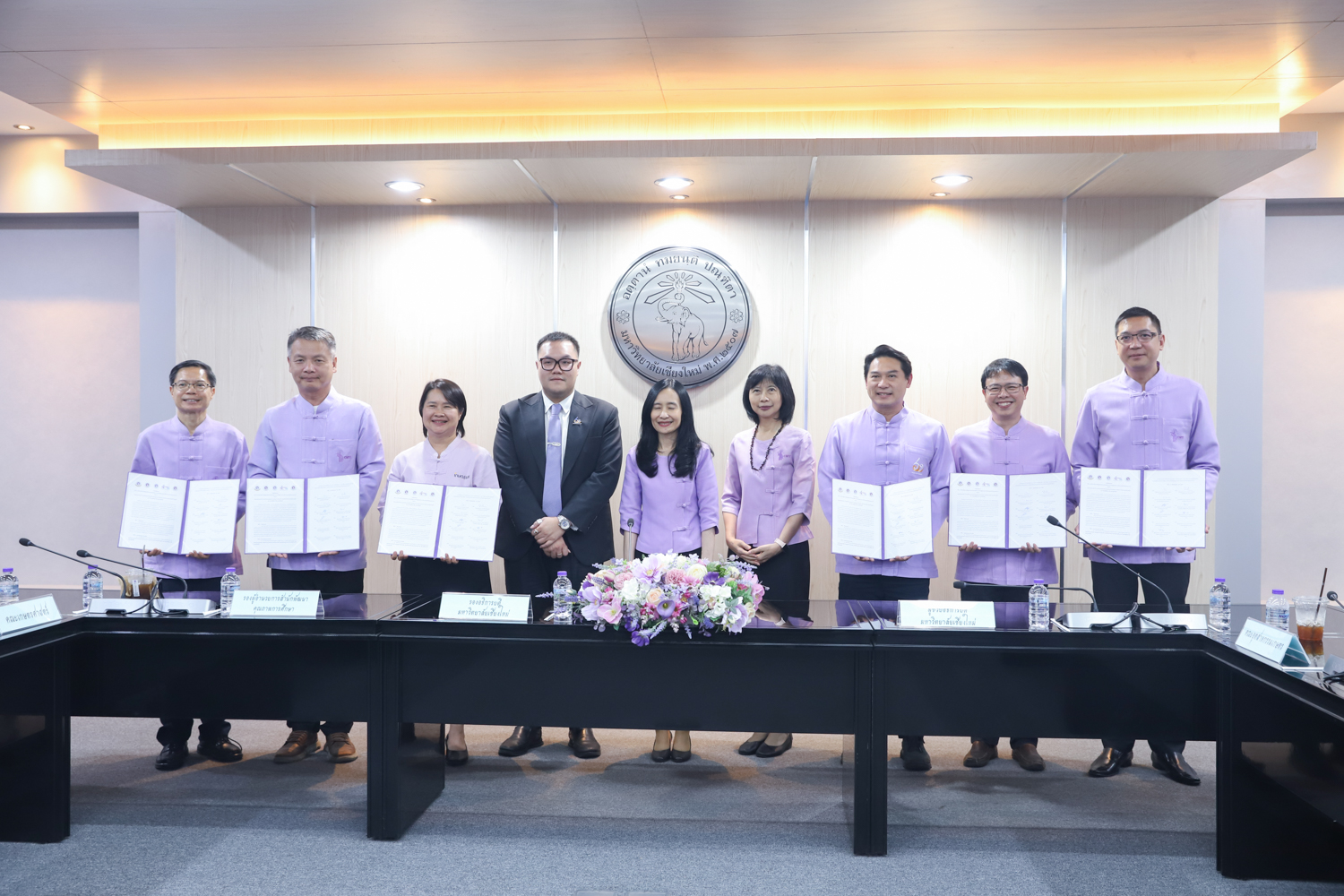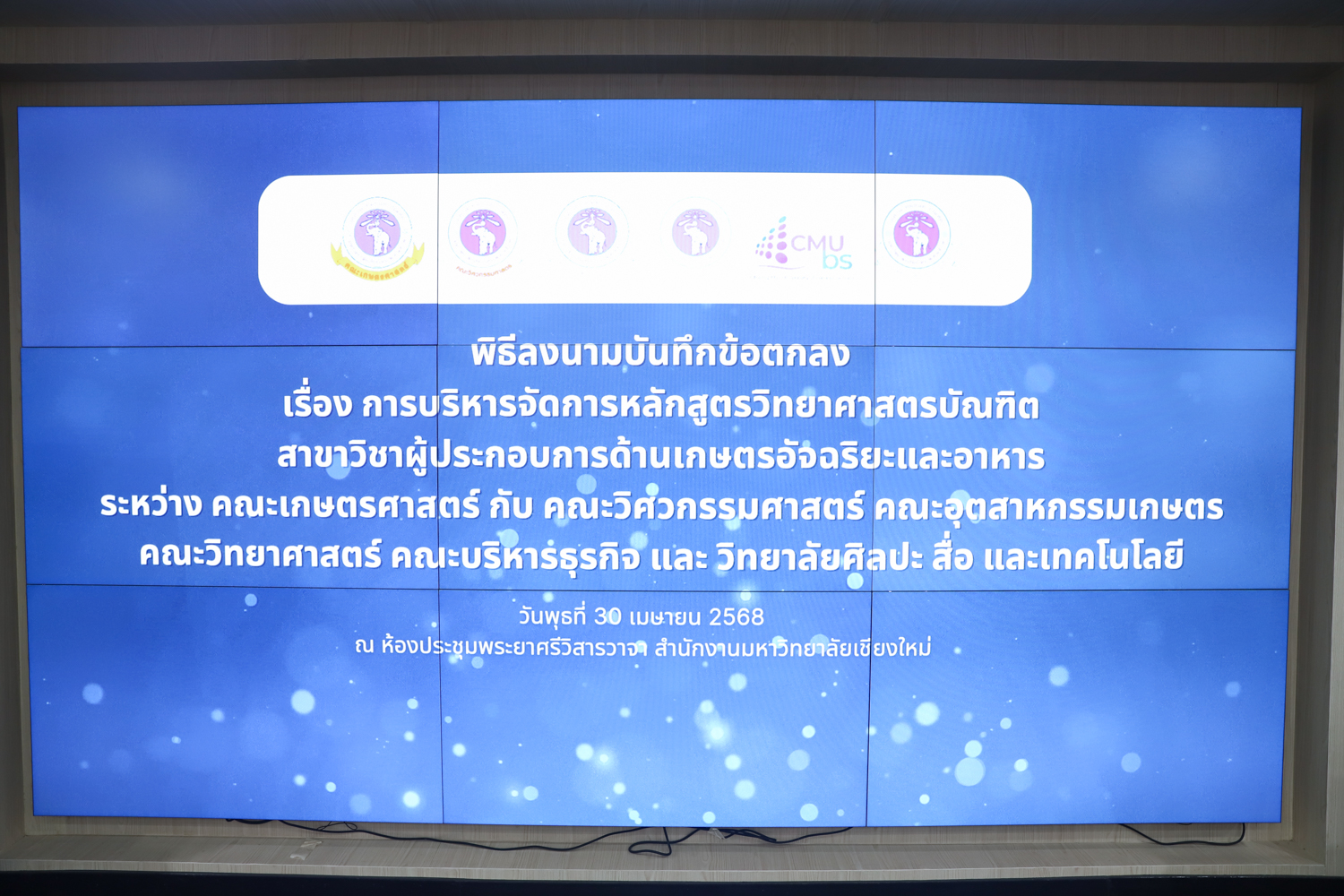 เมื่อวันที่ 30 เมษายน 2568 ณ ห้องประชุมพระยาศรีวิสารวาจา สำนักงานมหาวิทยาลัยเชียงใหม่ รองศาสตราจารย์ เภสัชกรหญิงอุษณีย์ คำประกอบ รองอธิการบดีมหาวิทยาลัยเชียงใหม่ เป็นประธานในพิธีลงนามความร่วมมือ เรื่อง การบริหารจัดการหลักสูตรวิทยาศาสตรบัณฑิตสาขาวิชาผู้ประกอบการด้านเกษตรอัจฉริยะ ระหว่าง คณะเกษตรศาสตร์ กับคณะวิศวกรรมศาสตร์ คณะอุตสาหกรรมเกษตร คณะวิทยาศาสตร์ คณะบริหารธุรกิจ และวิทยาลัย ศิลปะ สื่อ และเทคโนโลยี โดยมีผู้บริหาร ประธานหลักสูตร และผู้รับผิดชอบหลักสูตร ร่วมเป็นเกียรติในพิธีลงนาม MOU ดังกล่าว