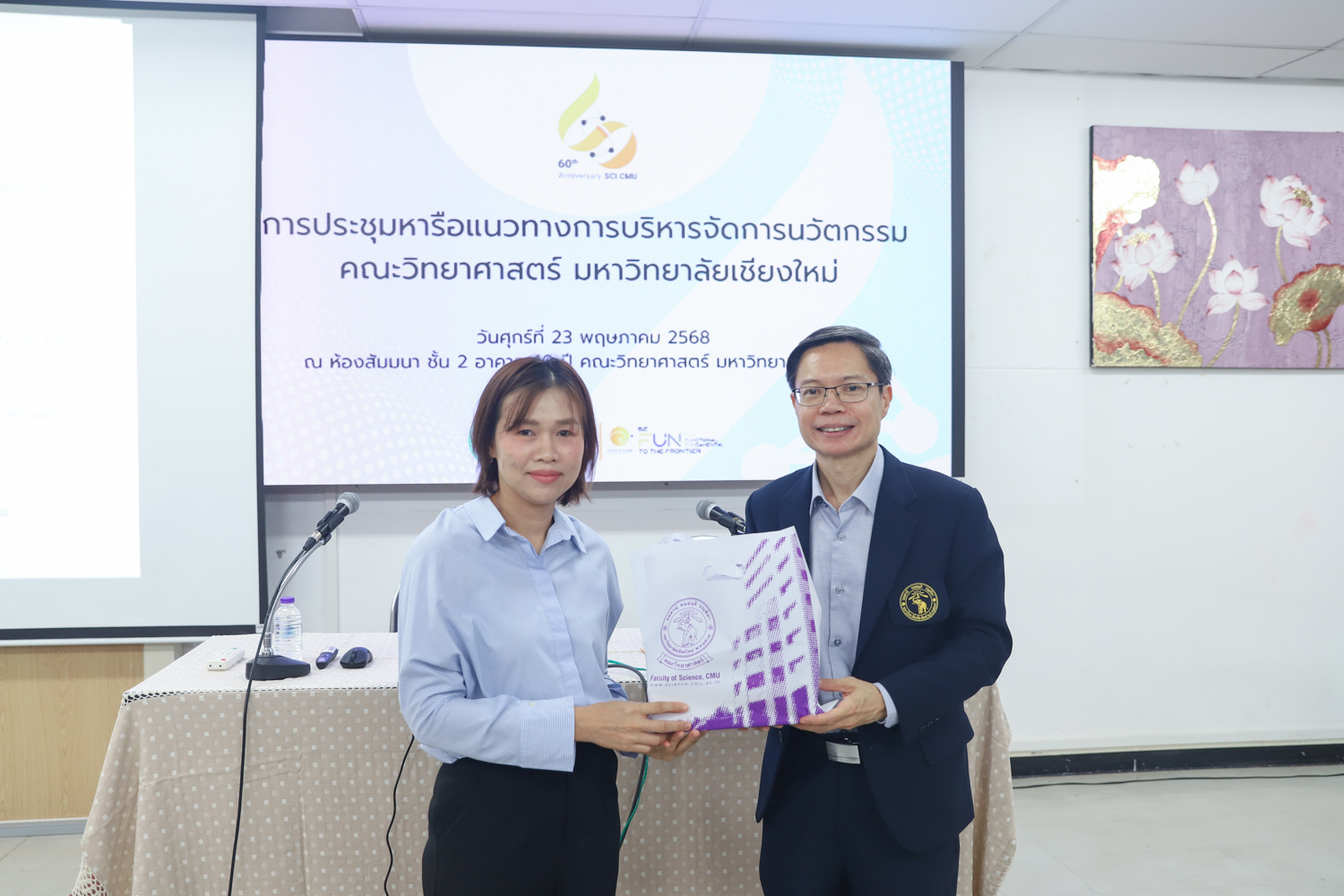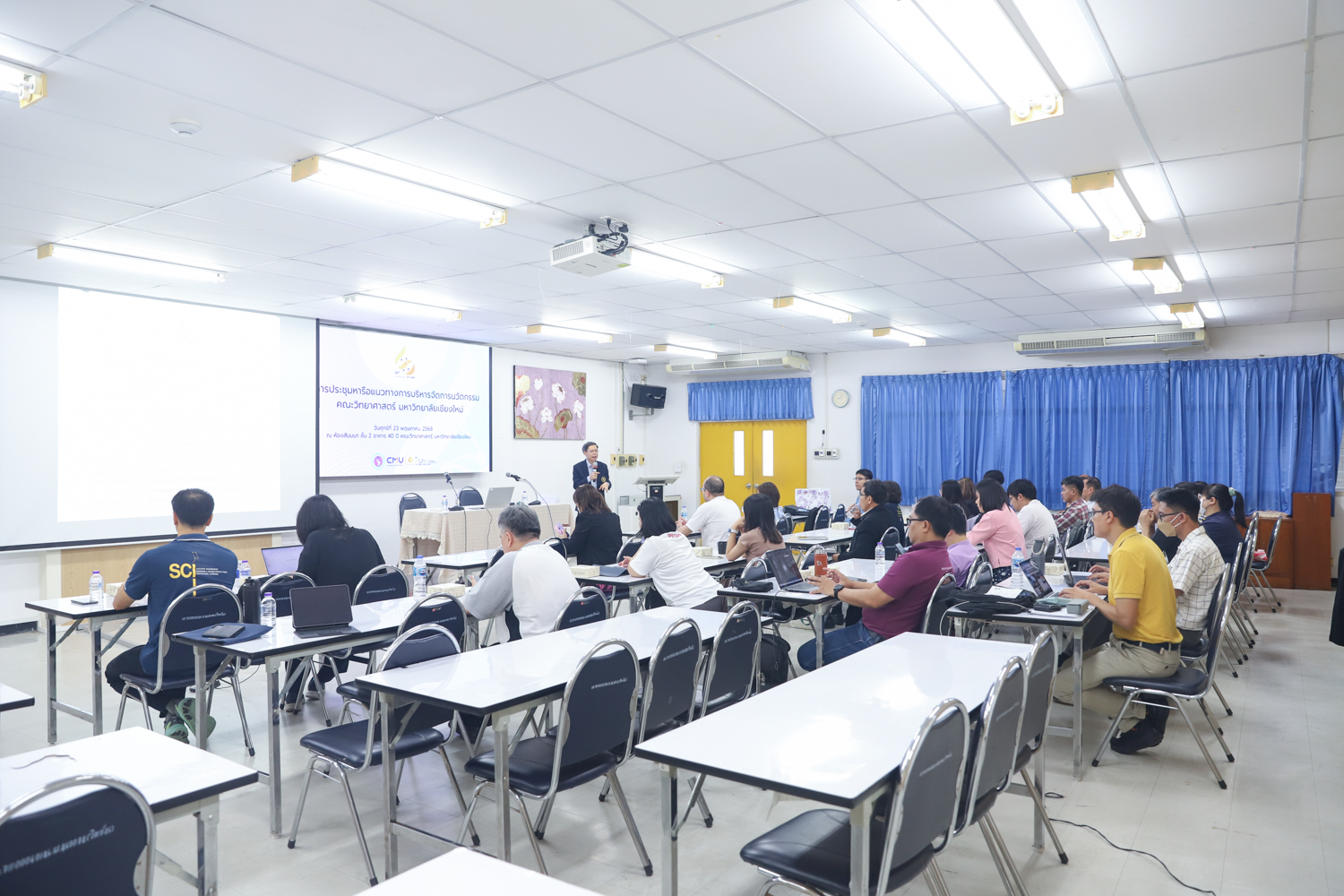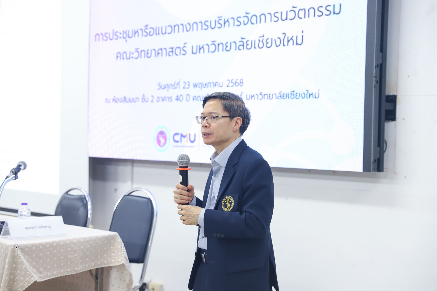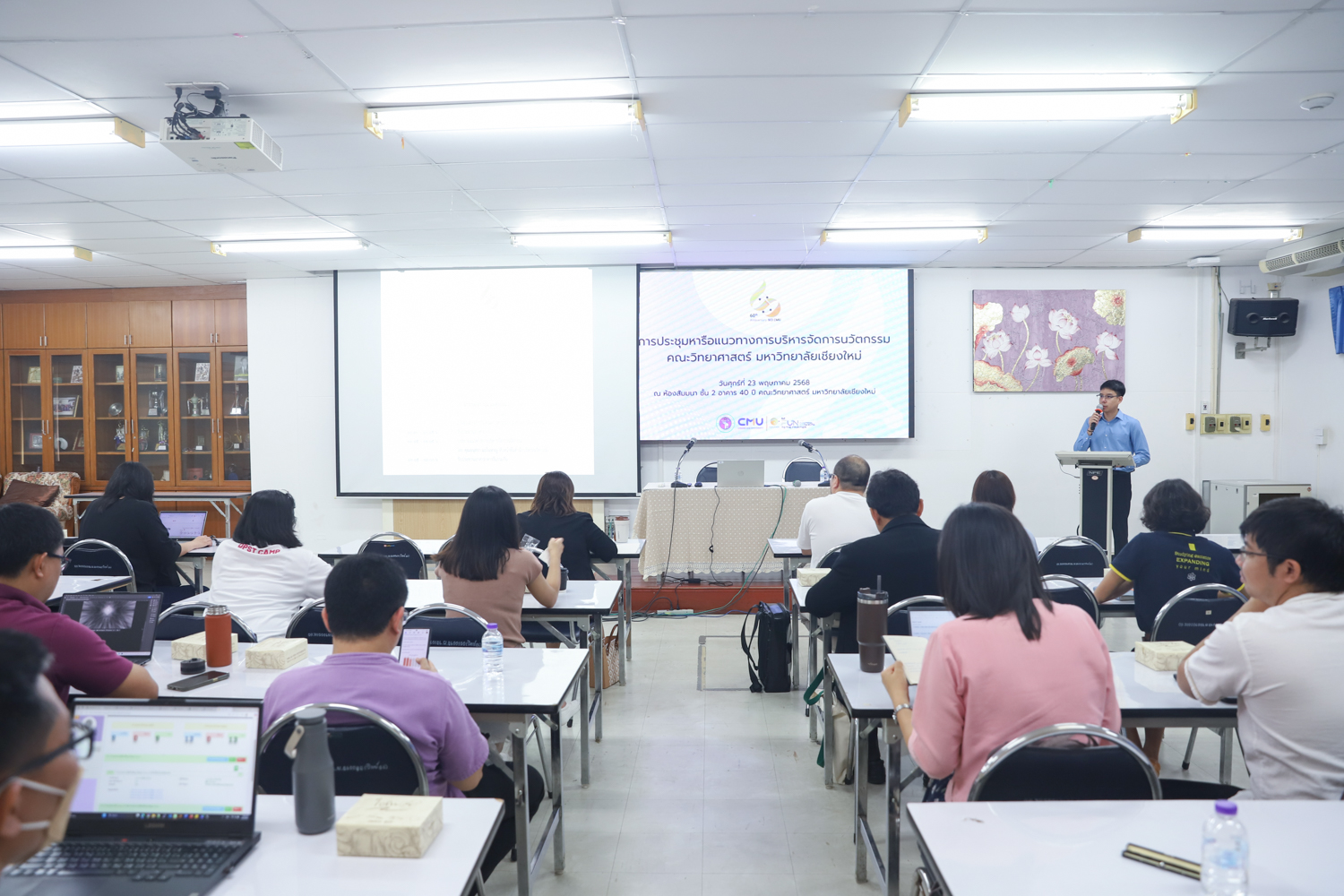 รศ.ดร.ปิยะพงศ์ เนียมทรัพย์ คณบดีคณะวิทยาศาสตร์ เป็นประธานเปิดการประชุมหารือแนวทางการบริหารจัดการนวัตกรรมของคณะวิทยาศาสตร์ ในวันศุกร์ที่ 23 พฤษภาคม 2568 ณ ห้องสัมมนา ชั้น 2 อาคาร 40 ปี คณะวิทยาศาสตร์ เพื่อเป็นการส่งเสริม สนับสนุน และวางแนวทางการบริหารจัดการผลงานวิจัยและนวัตกรรมของคณะวิทยาศาสตร์ โดยมีผู้บริหาร ได้แก่ คณบดี รองคณบดี ผู้ช่วยคณบดี หัวหน้าภาควิชาและศูนย์ฯ เข้าร่วมการประชุม เพื่อให้มองเห็นภาพรวมของการดำเนินงานด้านการบริหารจัดการนวัตกรรม และการต่อยอดสู่การใช้ประโยชน์ของสำนักบริหารนวัตกรรม รวมถึงได้รับทราบข้อมูลและแนวทางการดำเนินงานโครงการ builds (CMU Startup & Entrepreneurial Program) ซึ่งเป็นโครงการพัฒนาศักยภาพของนักศึกษาเพื่อเตรียมพร้อมสู่การเป็นผู้ประกอบการในอนาคต