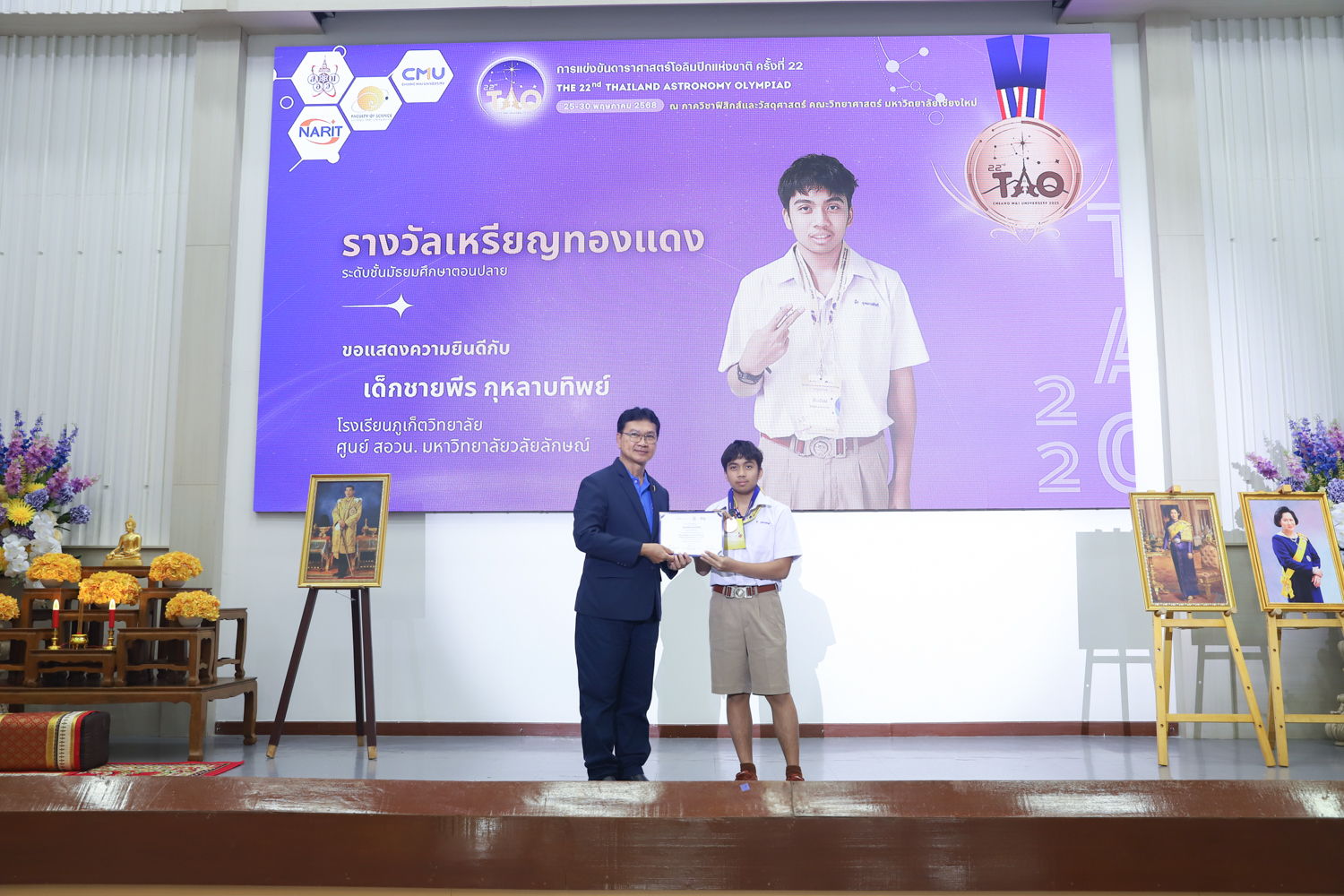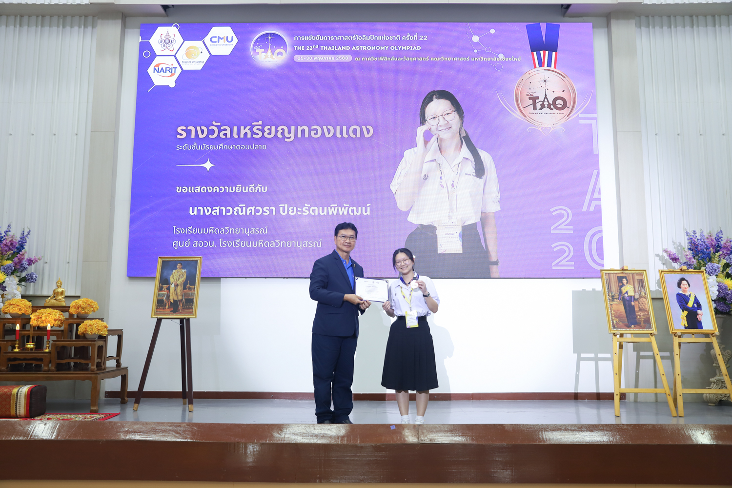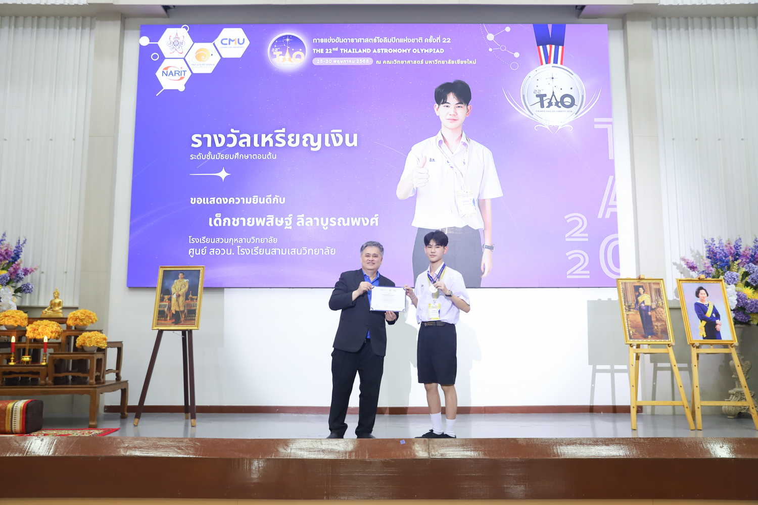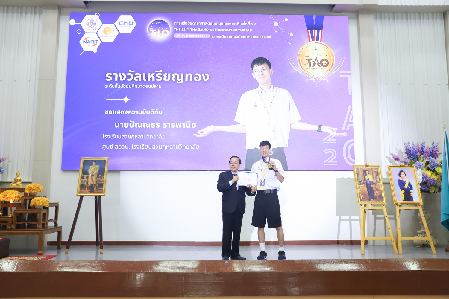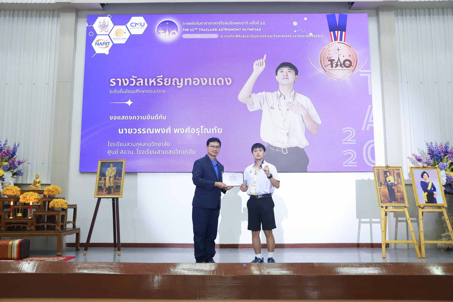 วันที่ 30 พฤษภาคม 2568 คณะวิทยาศาสตร์ มหาวิทยาลัยเชียงใหม่ จัดพิธีปิดการแข่งขันดาราศาสตร์โอลิมปิกระดับชาติ ครั้งที่ 22 (The 22nd Thailand Astronomy Olympiad (22nd TAO)) ณ ห้อง SCB2100 อาคาร 40 ปี คณะวิทยาศาสตร์ โดยได้รับเกียรติจาก รองศาสตราจารย์บุญรักษา สุนทรธรรม กรรมการและประธานสาขาดาราศาสตร์ มูลนิธิ สอวน. เป็นประธานในพิธีปิดการแข่งขัน และรองศาสตราจารย์ ดร.ปิยะพงศ์ เนียมทรัพย์ คณบดีคณะวิทยาศาสตร์ มหาวิทยาลัยเชียงใหม่ กล่าวต้อนรับและกล่าวรายงานการจัดการแข่งขัน โดยมีผู้ทรงคุณวุฒิจากหน่วยงานต่างๆ ตลอดจนครู อาจารย์ และนักเรียนผู้แทนศูนย์ ร่วมเป็นเกียรติในพิธี