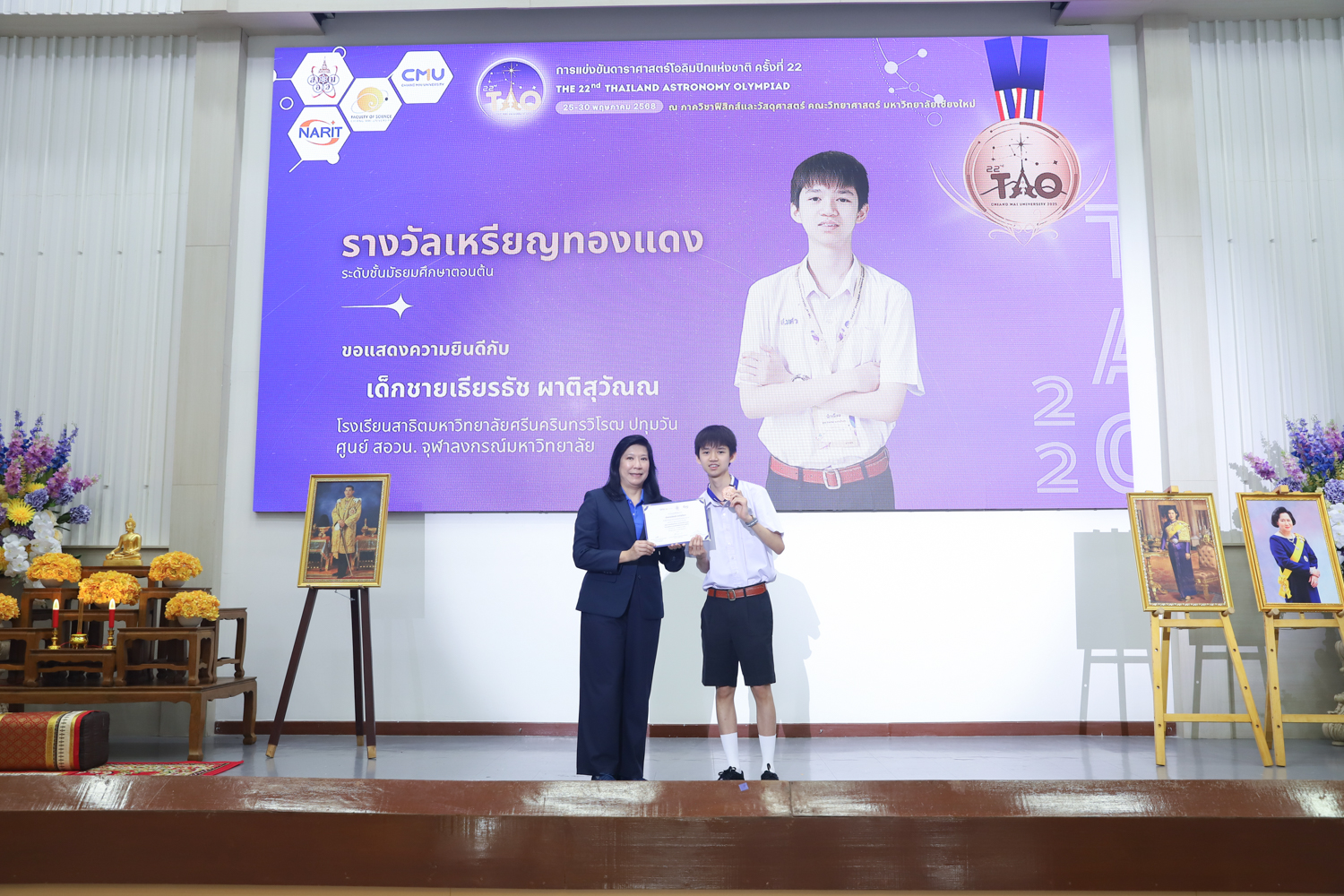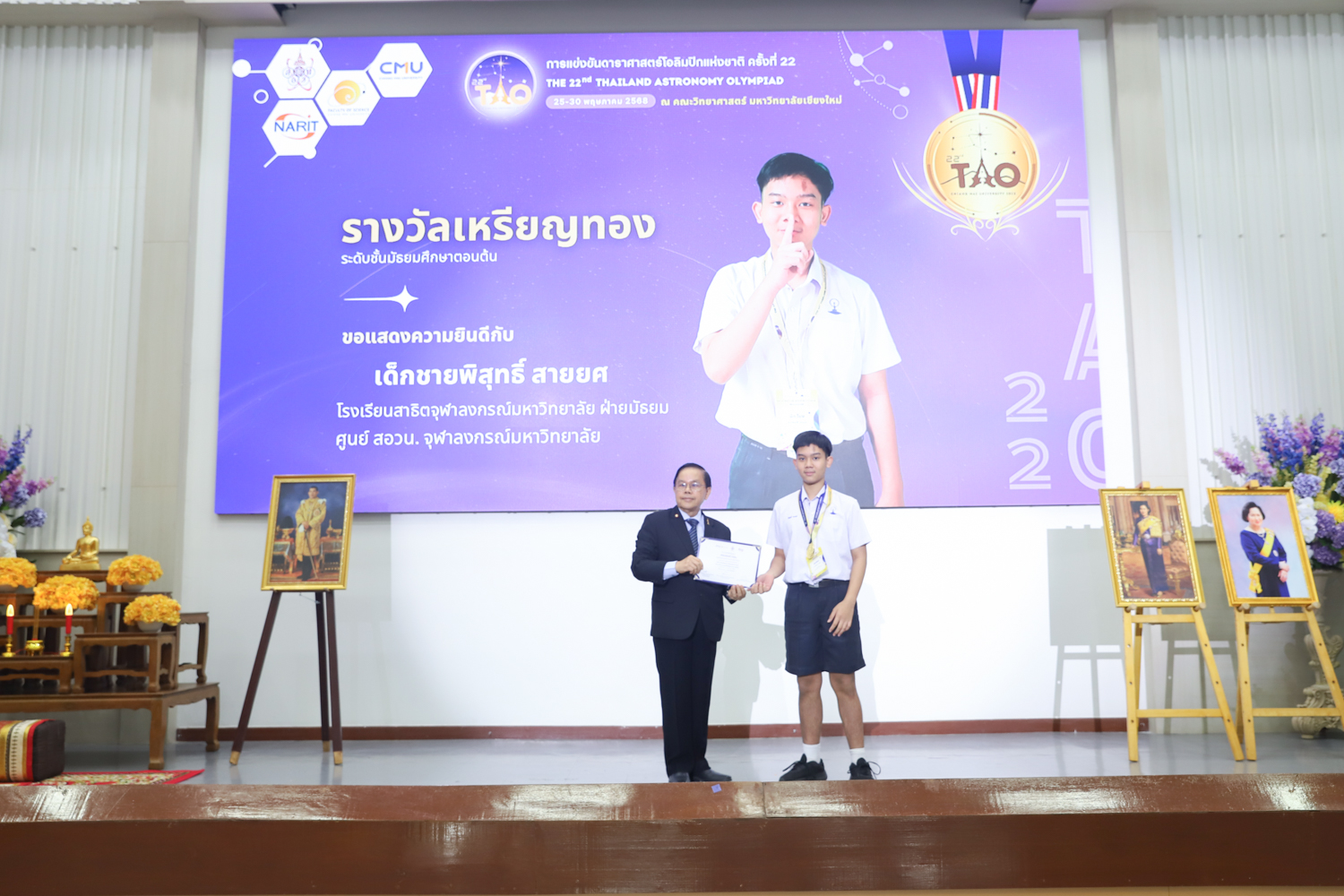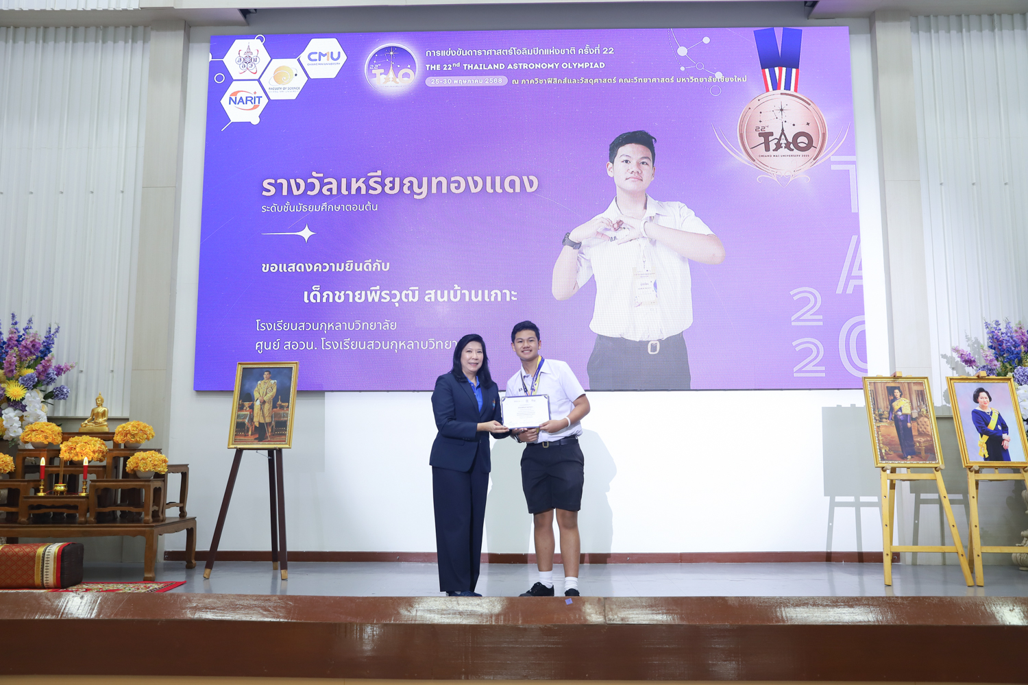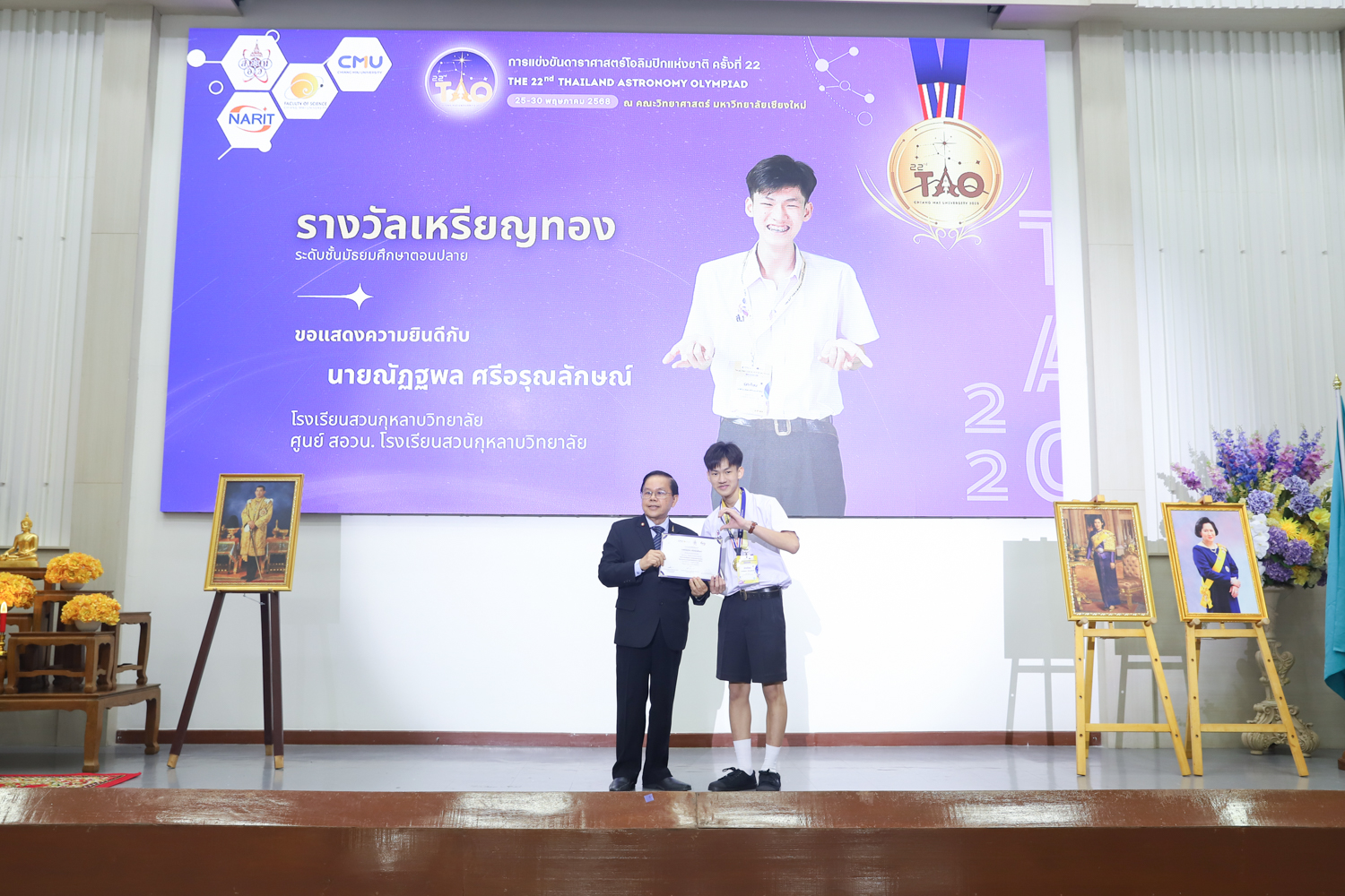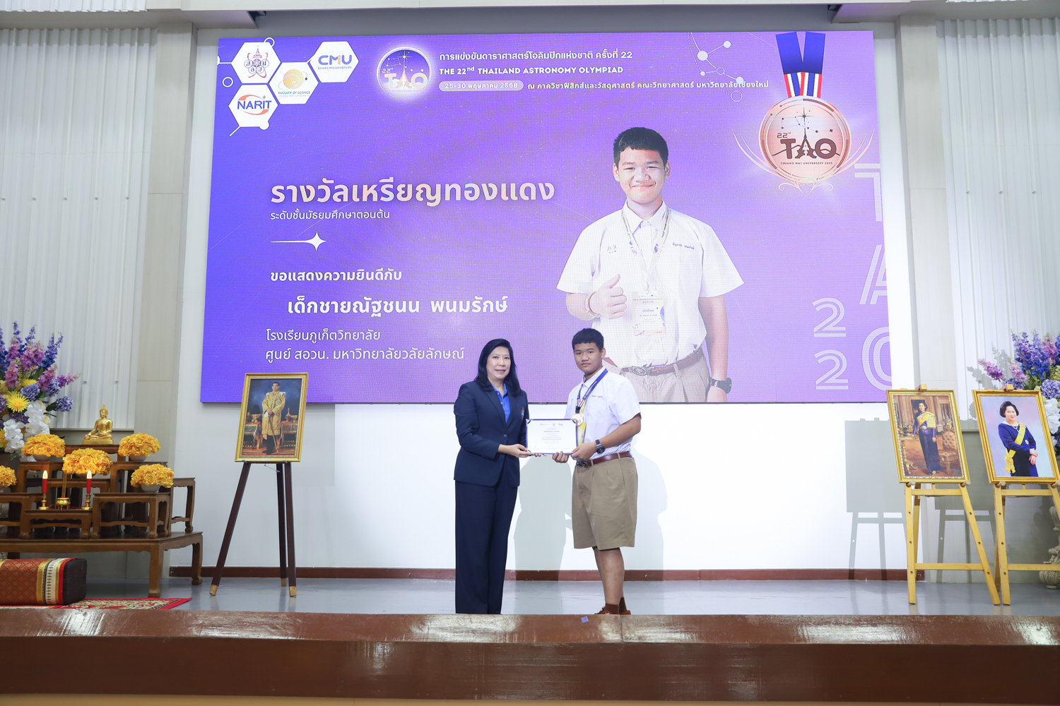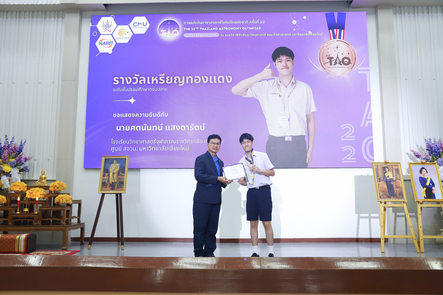 วันที่ 30 พฤษภาคม 2568 คณะวิทยาศาสตร์ มหาวิทยาลัยเชียงใหม่ จัดพิธีปิดการแข่งขันดาราศาสตร์โอลิมปิกระดับชาติ ครั้งที่ 22 (The 22nd Thailand Astronomy Olympiad (22nd TAO)) ณ ห้อง SCB2100 อาคาร 40 ปี คณะวิทยาศาสตร์ โดยได้รับเกียรติจาก รองศาสตราจารย์บุญรักษา สุนทรธรรม กรรมการและประธานสาขาดาราศาสตร์ มูลนิธิ สอวน. เป็นประธานในพิธีปิดการแข่งขัน และรองศาสตราจารย์ ดร.ปิยะพงศ์ เนียมทรัพย์ คณบดีคณะวิทยาศาสตร์ มหาวิทยาลัยเชียงใหม่ กล่าวต้อนรับและกล่าวรายงานการจัดการแข่งขัน โดยมีผู้ทรงคุณวุฒิจากหน่วยงานต่างๆ ตลอดจนครู อาจารย์ และนักเรียนผู้แทนศูนย์ ร่วมเป็นเกียรติในพิธี