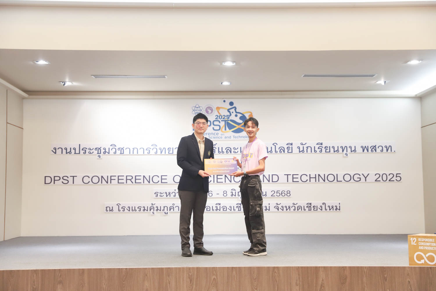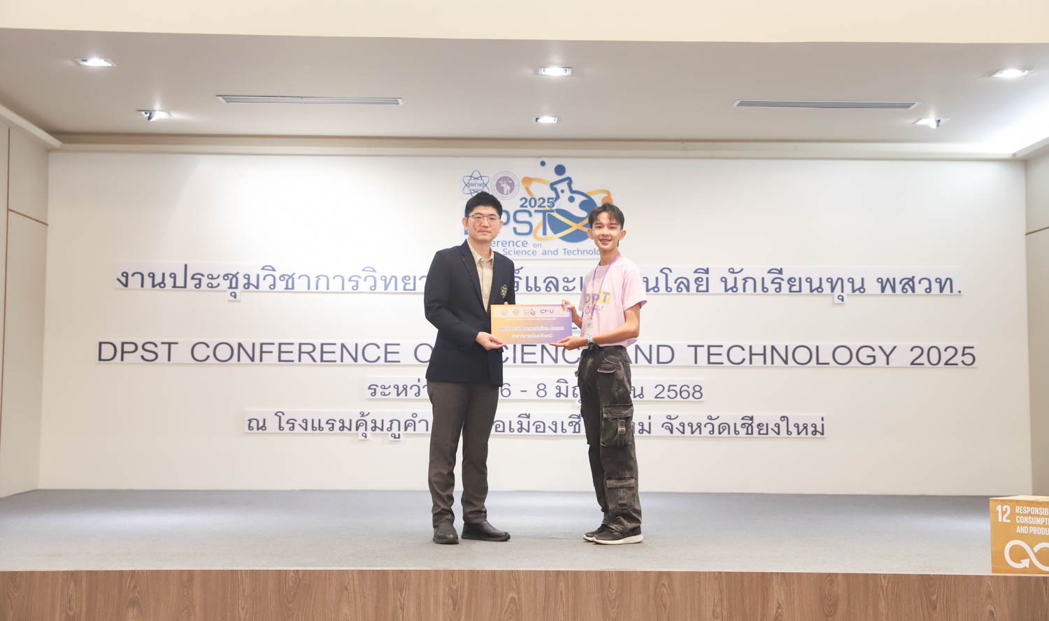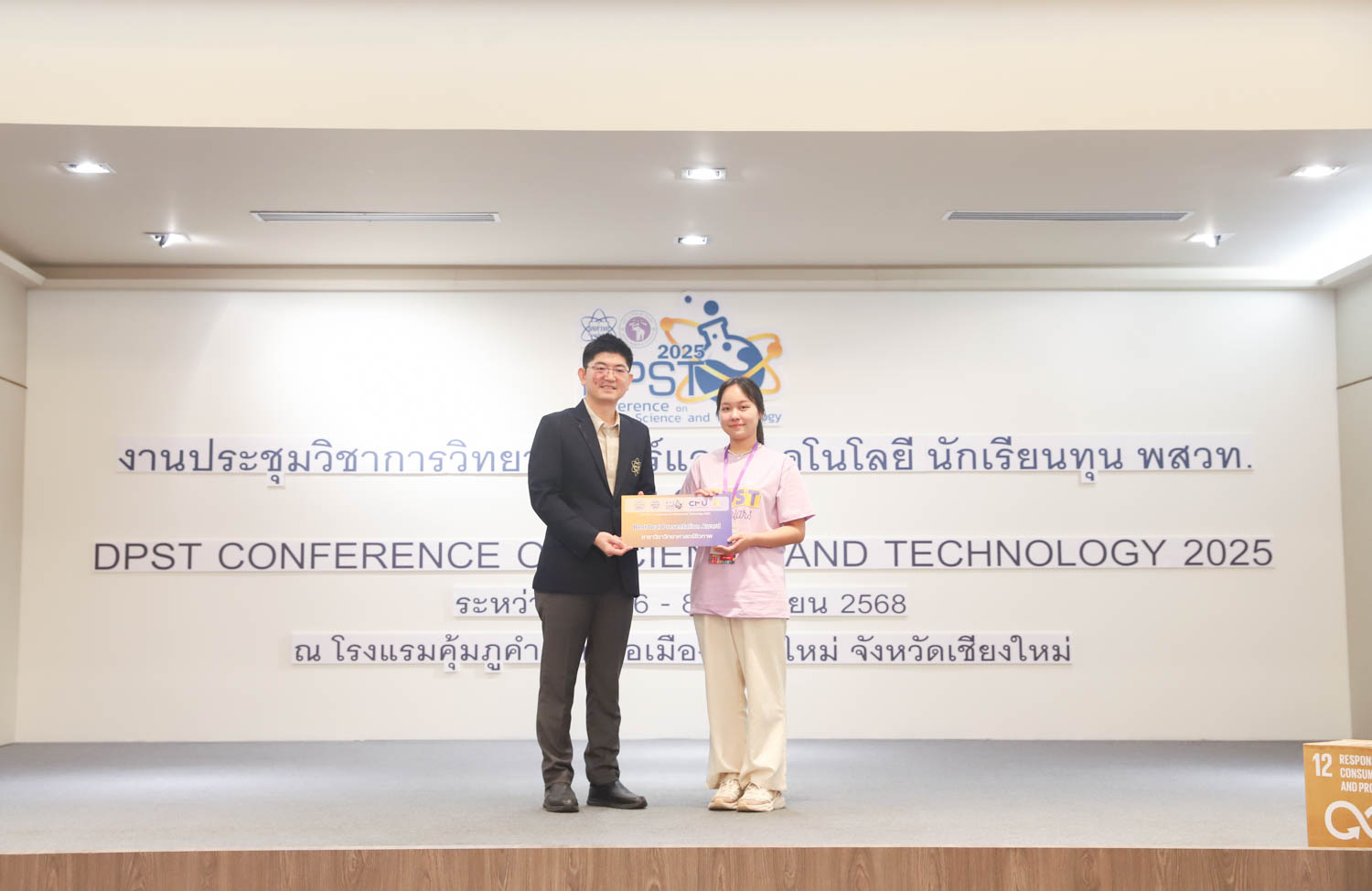 วันที่ 8 มิถุนายน 2568 คณะวิทยาศาสตร์ มหาวิทยาลัยเชียงใหม่ จัดพิธีปิดงานประชุมวิชาการวิทยาศาสตร์และเทคโนโลยี นักเรียนทุน พสวท. ประจำปี 2568 ณ โรงแรมคุ้มภูคำ จังหวัดเชียงใหม่ โดยได้รับเกียรติจาก รองศาสตราจารย์ธีระเดช เจียรสุขสกุล ผู้อำนวยการสถาบันส่งเสริมการสอนวิทยาศาสตร์และเทคโนโลยี (สสวท.) เป็นประธานในพิธีปิดงาน และรองศาสตราจารย์ ดร.ปิยะพงศ์ เนียมทรัพย์ คณบดีคณะวิทยาศาสตร์ มหาวิทยาลัยเชียงใหม่ ร่วมเป็นเกียรติในพิธี โดยภายในงานมีการมอบรางวัลการนำเสนอผลงานวิชาการ และการมอบธงแก่เจ้าภาพในปีถัดไป