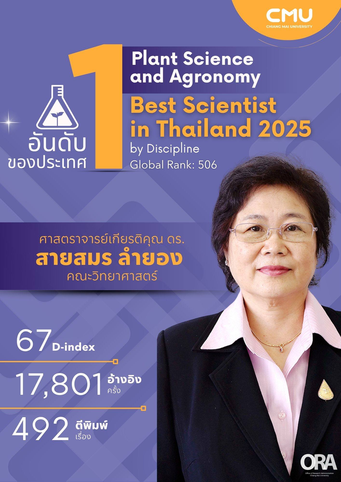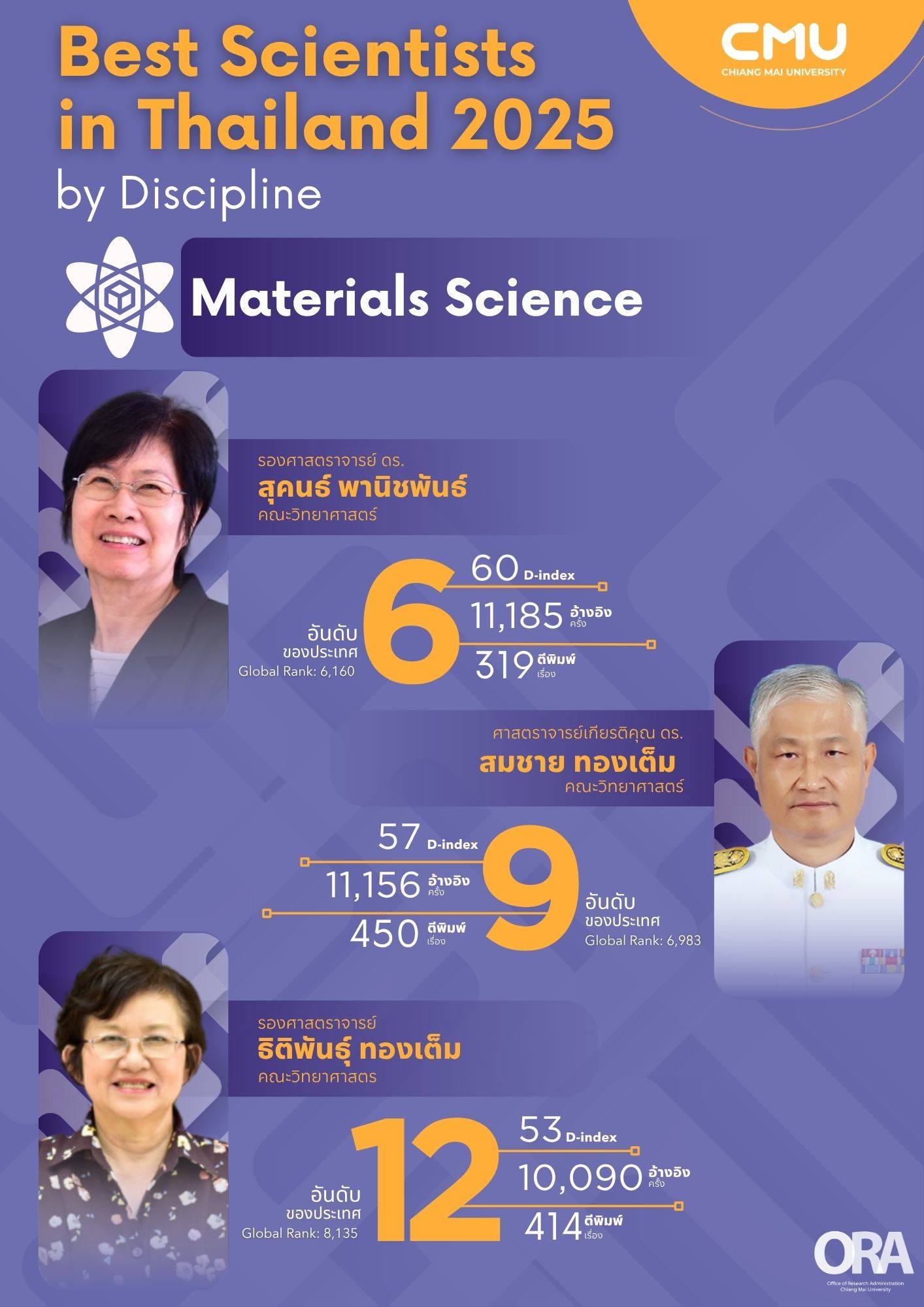 นักวิจัยจากมหาวิทยาลัยเชียงใหม่ จำนวน 16 ท่าน ได้รับการจัดอันดับเป็น Best Scientists in Thailand 2025 โดยพิจารณาจาก D-index, จำนวนการอ้างอิง และผลงานวิจัยคุณภาพสูงระดับโลก โดยอาจารย์คณะวิทยาศาสตร์ที่ได้รับการจัดอันดับดังกล่าว มีดังนี้