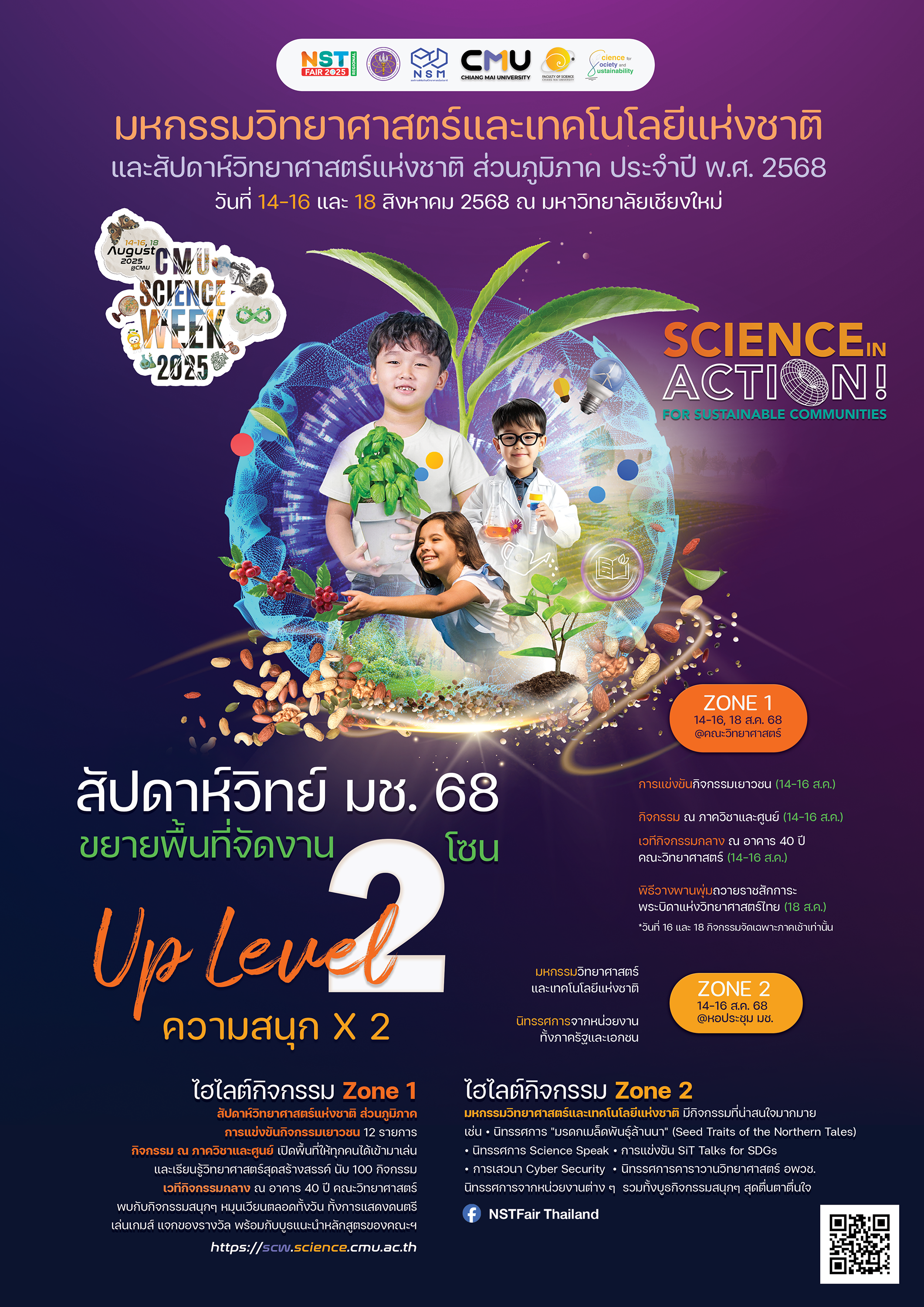 การจัดงานมหกรรมวิทยาศาสตร์และเทคโนโลยีแห่งชาติ และสัปดาห์วิทยาศาสตร์แห่งชาติ ส่วนภูมิภาค ประจำปี พ.ศ. 2568 จะแบ่งพื้นที่การจัดงานออกเป็น 2 โซน ได้แก่ โซนคณะวิทยาศาสตร์ และโซนหอประชุมมหาวิทยาลัยเชียงใหม่ ดังนี้