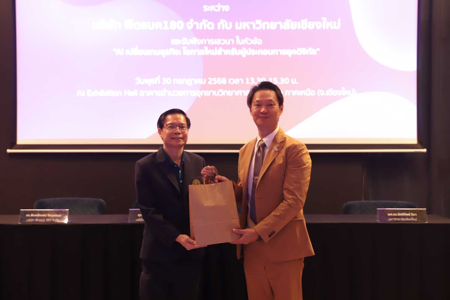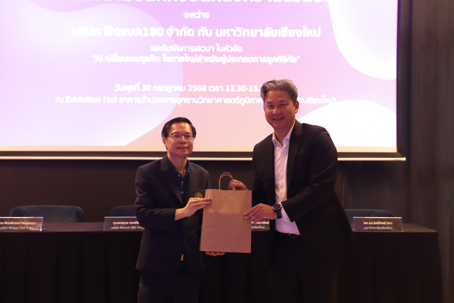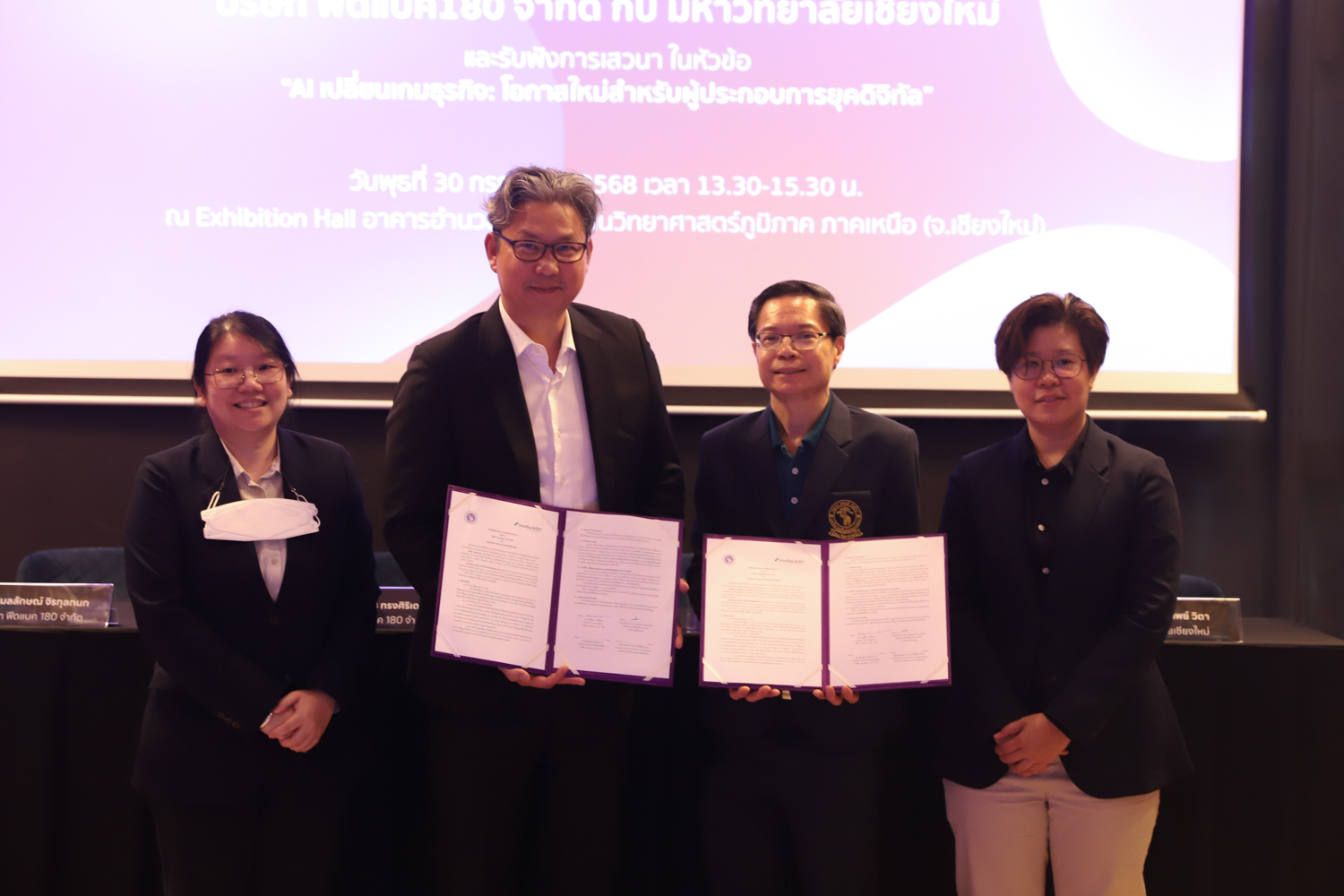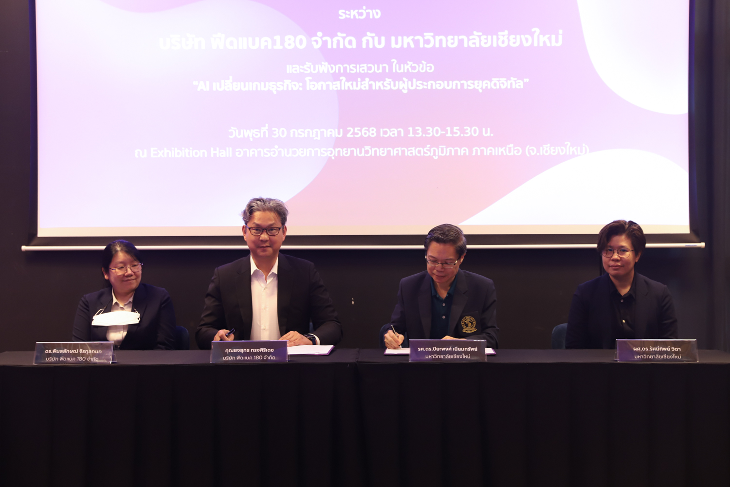 ภายในงานได้รับเกียรติจาก รองศาสตราจารย์ ดร.ปิยะพงศ์ เนียมทรัพย์ คณบดีคณะวิทยาศาสตร์ มหาวิทยาลัยเชียงใหม่ กล่าวเปิดงาน และกล่าวถึงความสำคัญของความร่วมมือในครั้งนี้ โดยมี รองศาสตราจารย์ ดร.ปิติวัฒน์ วัฒนชัย ผู้อำนวยการอุทยานวิทยาศาสตร์และเทคโนโลยี มหาวิทยาลัยเชียงใหม่ คุณยงยุทธ ทรงศิริเดช กรรมการผู้จัดการ บริษัท Feedback 180 จำกัด และ ดร.พิมลลักษณ์ จิรกุลกนก หัวหน้าฝ่ายวิจัยและพัฒนา บริษัท Feedback 180 จำกัด พร้อมด้วยผู้บริหารและบุคลากรที่เกี่ยวข้องร่วมพิธี