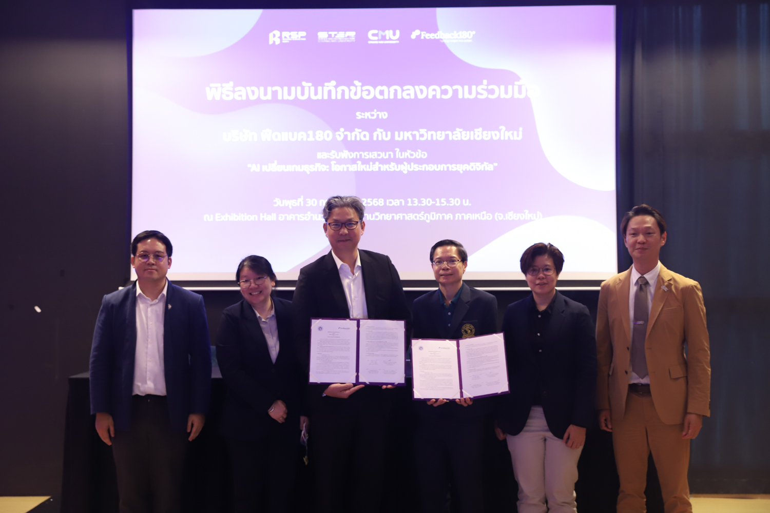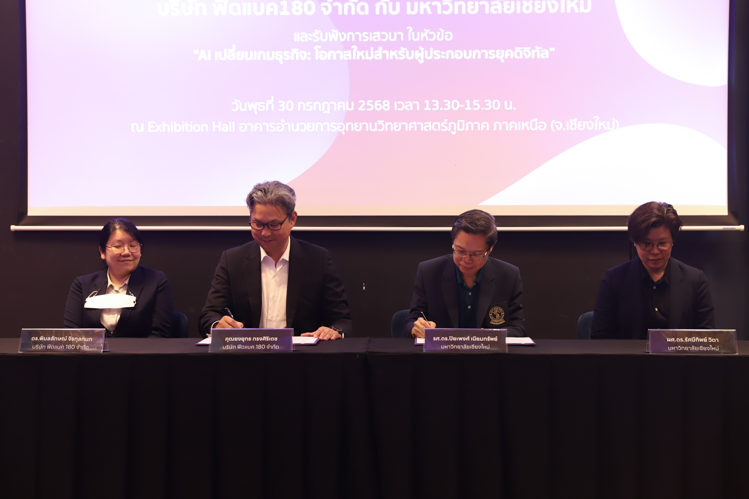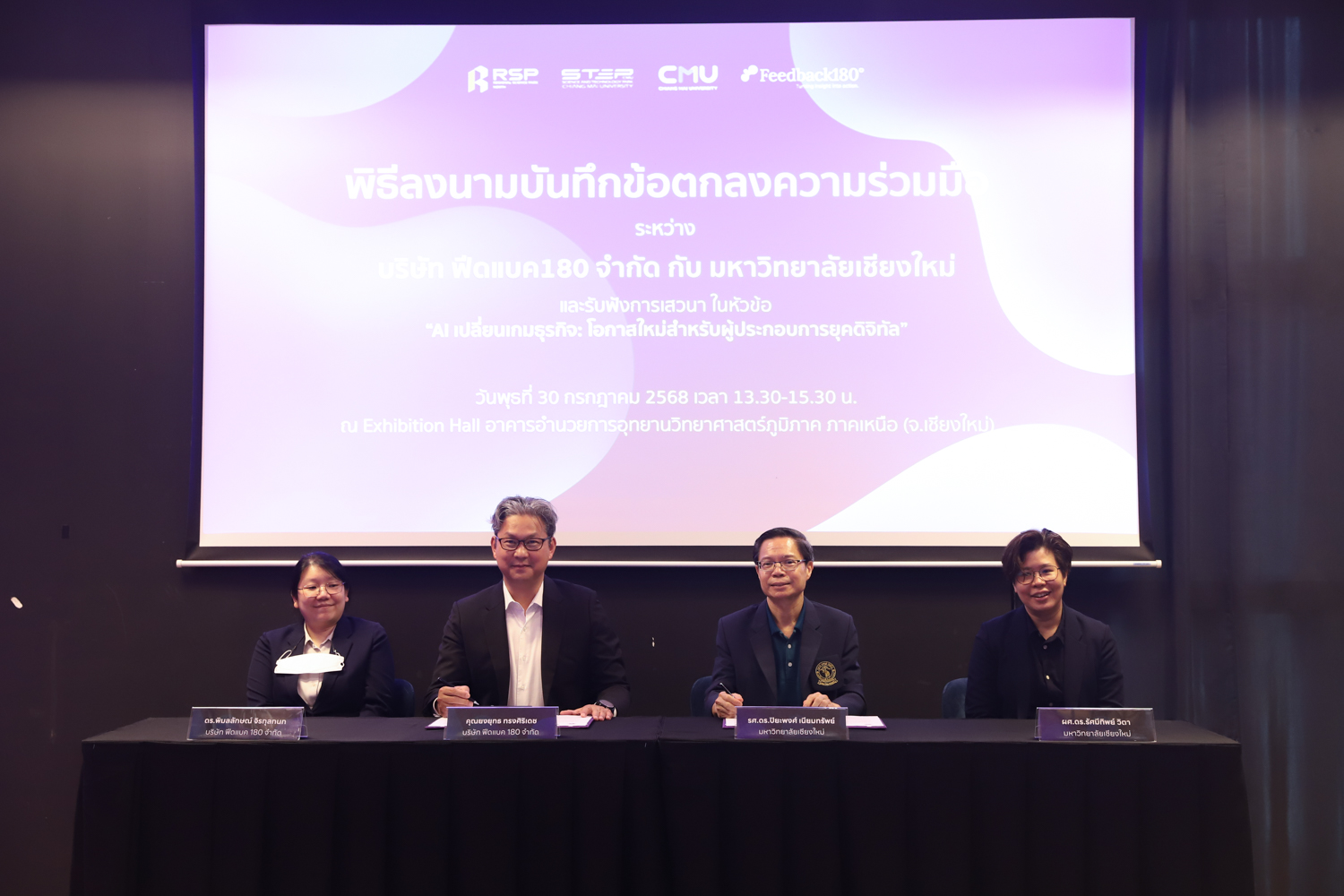 วันพุธที่ 30 กรกฎาคม 2568 คณะวิทยาศาสตร์ มหาวิทยาลัยเชียงใหม่ ร่วมลงนามในบันทึกข้อตกลงความร่วมมือทางวิชาการ กับบริษัท Feedback 180 จำกัด ณ อาคารอำนวยการอุทยานวิทยาศาสตร์ภูมิภาค ภาคเหนือ จังหวัดเชียงใหม่ เพื่อเสริมสร้างความร่วมมือด้านการวิจัยและการผลิตบัณฑิตในสาขาวิชาวิทยาการคอมพิวเตอร์ สถิติ คณิตศาสตร์ และวิทยาการข้อมูล