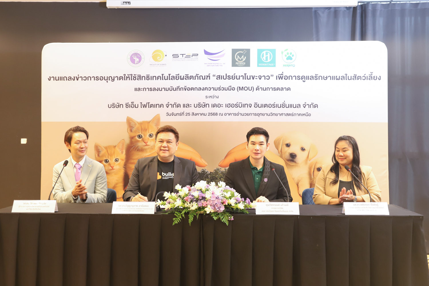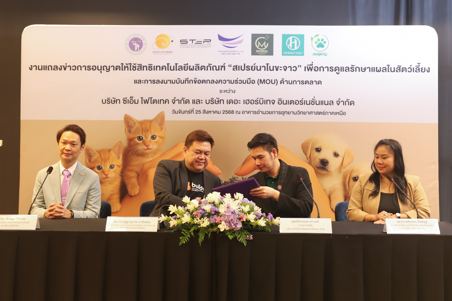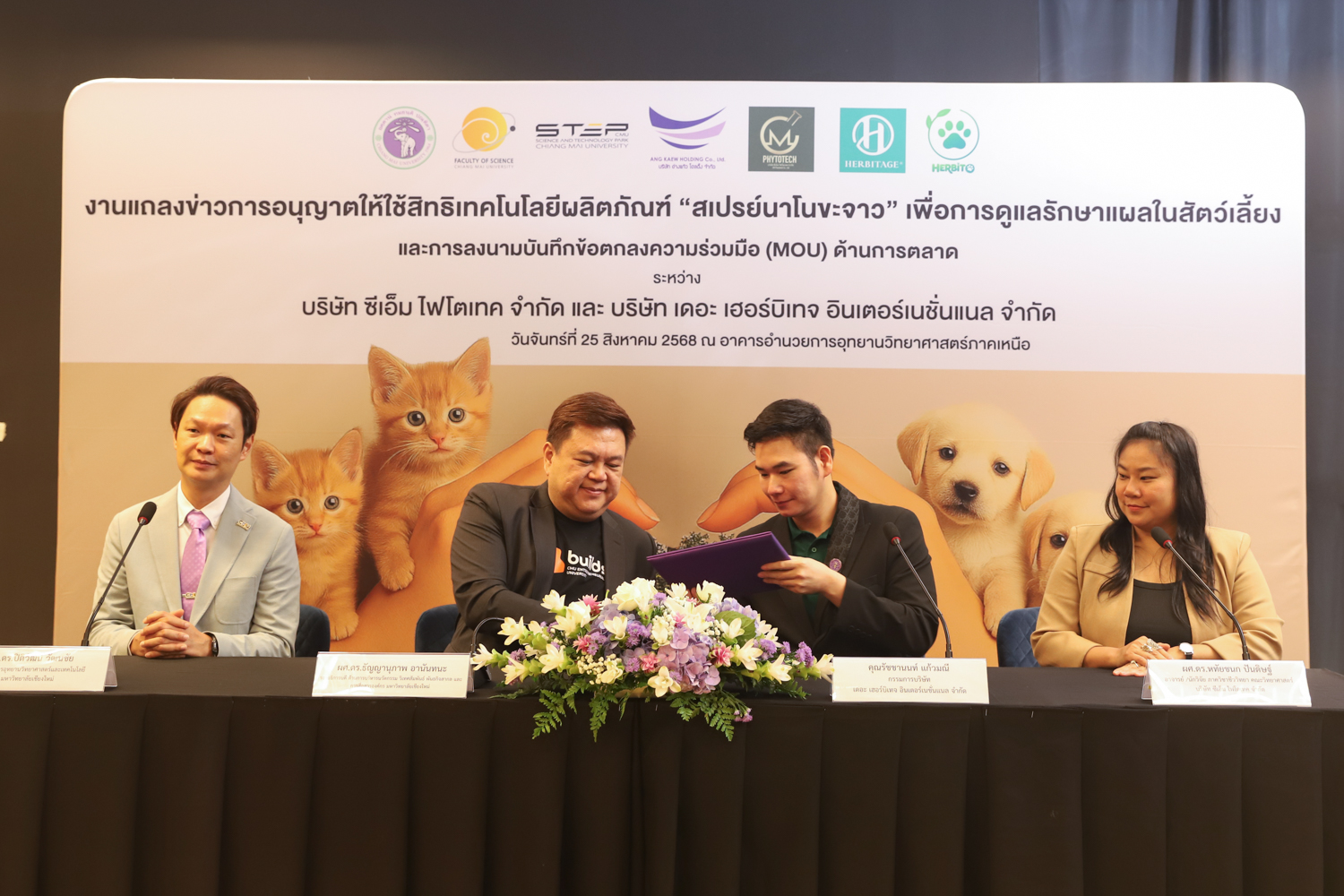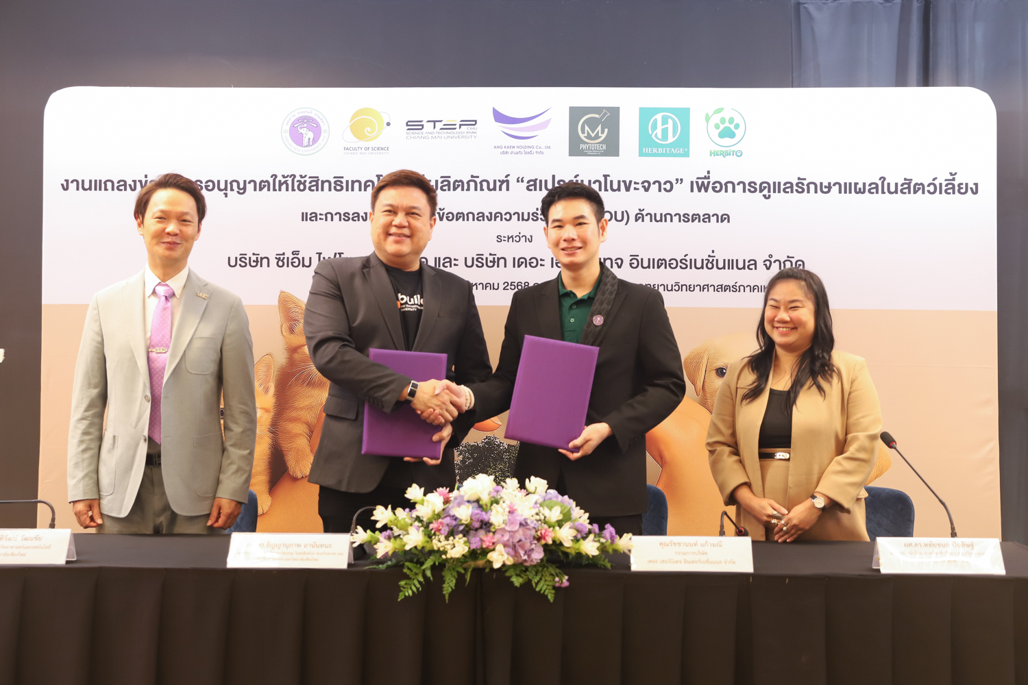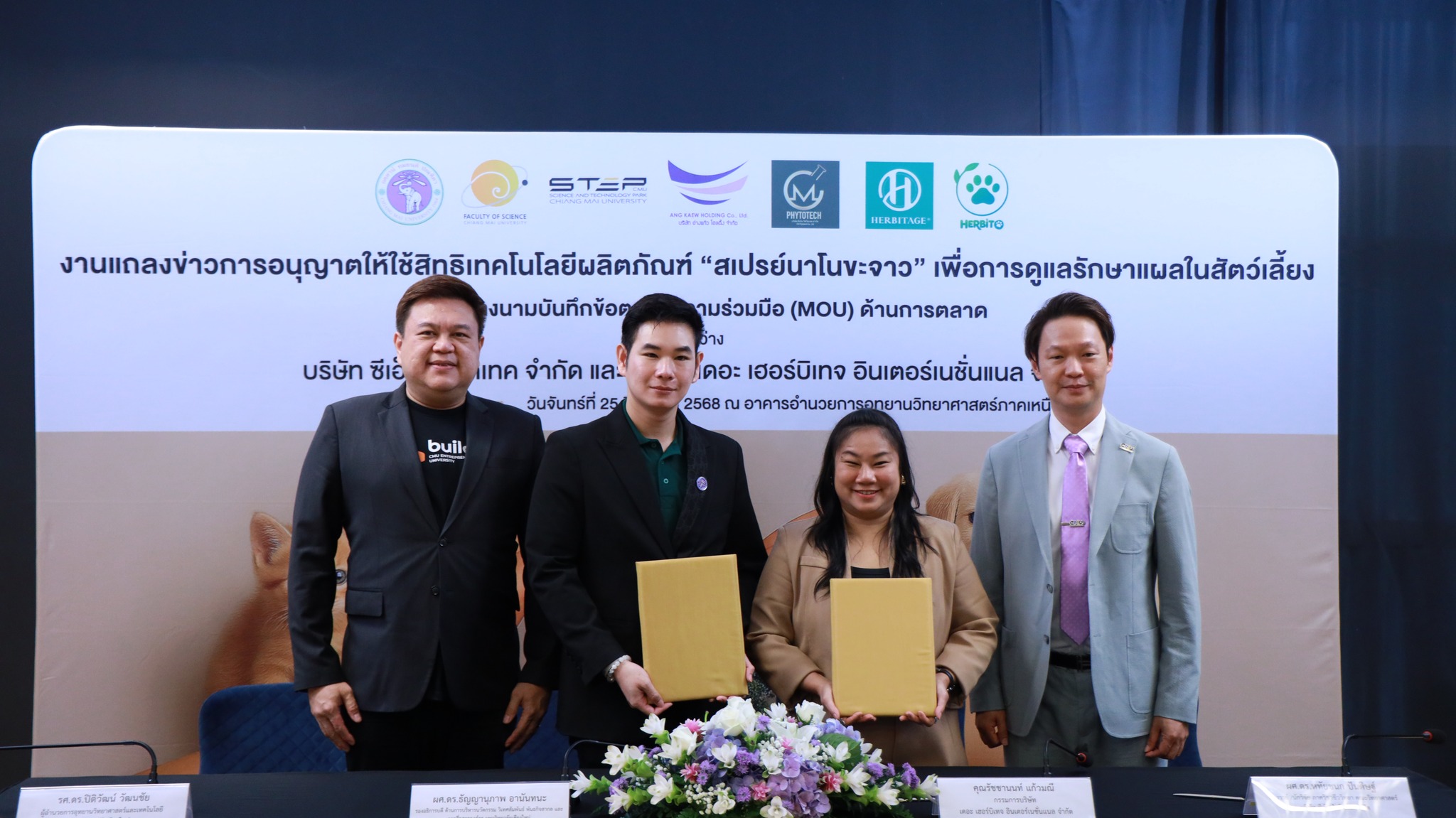 วันจันทร์ที่ 25 สิงหาคม 2568 มหาวิทยาลัยเชียงใหม่ จัดงานแถลงข่าวการลงนามสัญญาอนุญาตให้ใช้สิทธิเทคโนโลยี “สเปรย์นาโนขะจาว” เพื่อการดูแลรักษาแผลในสัตว์เลี้ยง ระหว่างมหาวิทยาลัยเชียงใหม่ (มช.) และบริษัท เดอะ เฮอร์บิเทจ อินเตอร์เนชั่นแนล จำกัด และพิธีลงนามทำบันทึกข้อตกลงความร่วมมือ (MOU) ระหว่างบริษัท ซีเอ็ม ไฟโตเทค จำกัด บริษัทในเครือบริษัท อ่างแก้วโฮลดิ้ง จำกัด โฮลดิ้งของมช. และบริษัท เดอะ เฮอร์บิเทจ อินเตอร์เนชั่นแนล จำกัด ณ NSP Exhibition Hall (B1) อาคารอำนวยการอุทยานวิทยาศาสตร์ภูมิภาค ภาคเหนือ (จ.เชียงใหม่) โดยได้รับเกียรติจาก ผศ.ดร.ธัญญานุภาพ อานันทนะ รองอธิการบดี มหาวิทยาลัยเชียงใหม่ ร่วมลงนามสัญญาอนุญาตให้ใช้สิทธิฯ ร่วมกับ คุณรัชชานนท์ แก้วมณี กรรมการบริษัท เดอะ เฮอร์บิเทจ อินเตอร์เนชั่นแนล จำกัด โดยความร่วมมือดังกล่าวจะขยายผลต่อยอดงานวิจัยสู่เชิงพาณิชย์ ควบคู่กับกลยุทธ์การตลาดทั้งในและต่างประเทศ ผ่านการกระจายผลิตภัณฑ์ไปยังโรงพยาบาลสัตว์ เพ็ทช็อป ห้างสรรพสินค้า และแพลตฟอร์มออนไลน์ พร้อมโครงการ CSR ที่สนับสนุนการรักษาสัตว์เลี้ยงด้อยโอกาส เพื่อสร้างคุณค่าให้สังคมควบคู่กับการเติบโตทางธุรกิจอีกด้วย