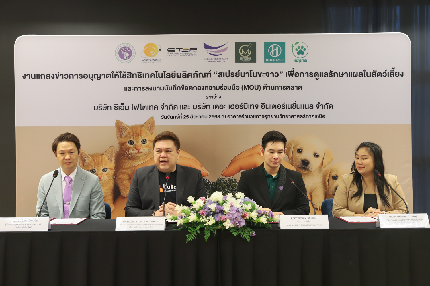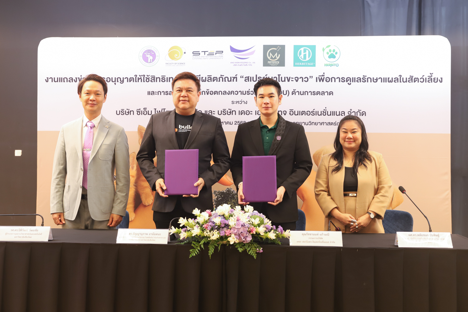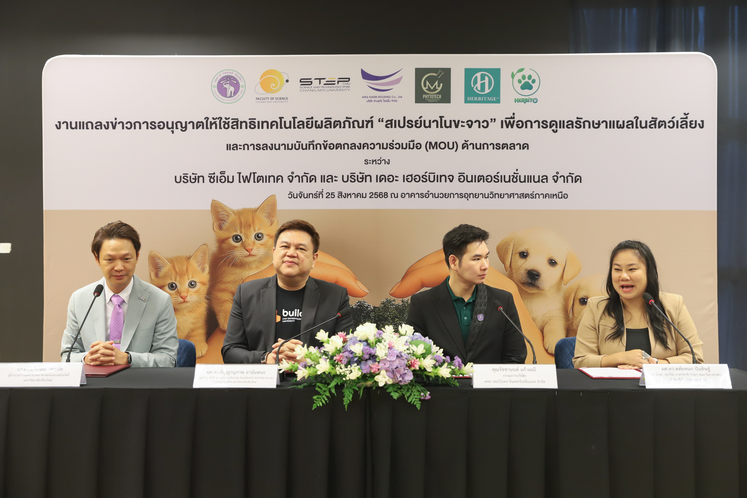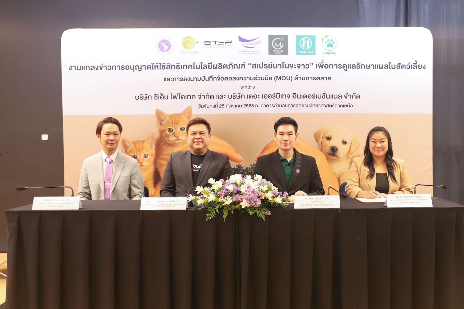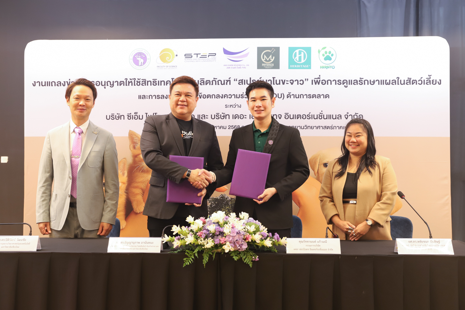 วันจันทร์ที่ 25 สิงหาคม 2568 มหาวิทยาลัยเชียงใหม่ จัดงานแถลงข่าวการลงนามสัญญาอนุญาตให้ใช้สิทธิเทคโนโลยี “สเปรย์นาโนขะจาว” เพื่อการดูแลรักษาแผลในสัตว์เลี้ยง ระหว่างมหาวิทยาลัยเชียงใหม่ (มช.) และบริษัท เดอะ เฮอร์บิเทจ อินเตอร์เนชั่นแนล จำกัด และพิธีลงนามทำบันทึกข้อตกลงความร่วมมือ (MOU) ระหว่างบริษัท ซีเอ็ม ไฟโตเทค จำกัด บริษัทในเครือบริษัท อ่างแก้วโฮลดิ้ง จำกัด โฮลดิ้งของมช. และบริษัท เดอะ เฮอร์บิเทจ อินเตอร์เนชั่นแนล จำกัด ณ NSP Exhibition Hall (B1) อาคารอำนวยการอุทยานวิทยาศาสตร์ภูมิภาค ภาคเหนือ (จ.เชียงใหม่) โดยได้รับเกียรติจาก ผศ.ดร.ธัญญานุภาพ อานันทนะ รองอธิการบดี มหาวิทยาลัยเชียงใหม่ ร่วมลงนามสัญญาอนุญาตให้ใช้สิทธิฯ ร่วมกับ คุณรัชชานนท์ แก้วมณี กรรมการบริษัท เดอะ เฮอร์บิเทจ อินเตอร์เนชั่นแนล จำกัด โดยความร่วมมือดังกล่าวจะขยายผลต่อยอดงานวิจัยสู่เชิงพาณิชย์ ควบคู่กับกลยุทธ์การตลาดทั้งในและต่างประเทศ ผ่านการกระจายผลิตภัณฑ์ไปยังโรงพยาบาลสัตว์ เพ็ทช็อป ห้างสรรพสินค้า และแพลตฟอร์มออนไลน์ พร้อมโครงการ CSR ที่สนับสนุนการรักษาสัตว์เลี้ยงด้อยโอกาส เพื่อสร้างคุณค่าให้สังคมควบคู่กับการเติบโตทางธุรกิจอีกด้วย
