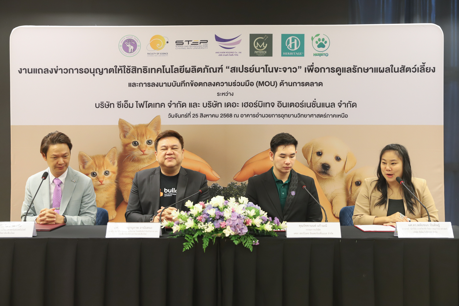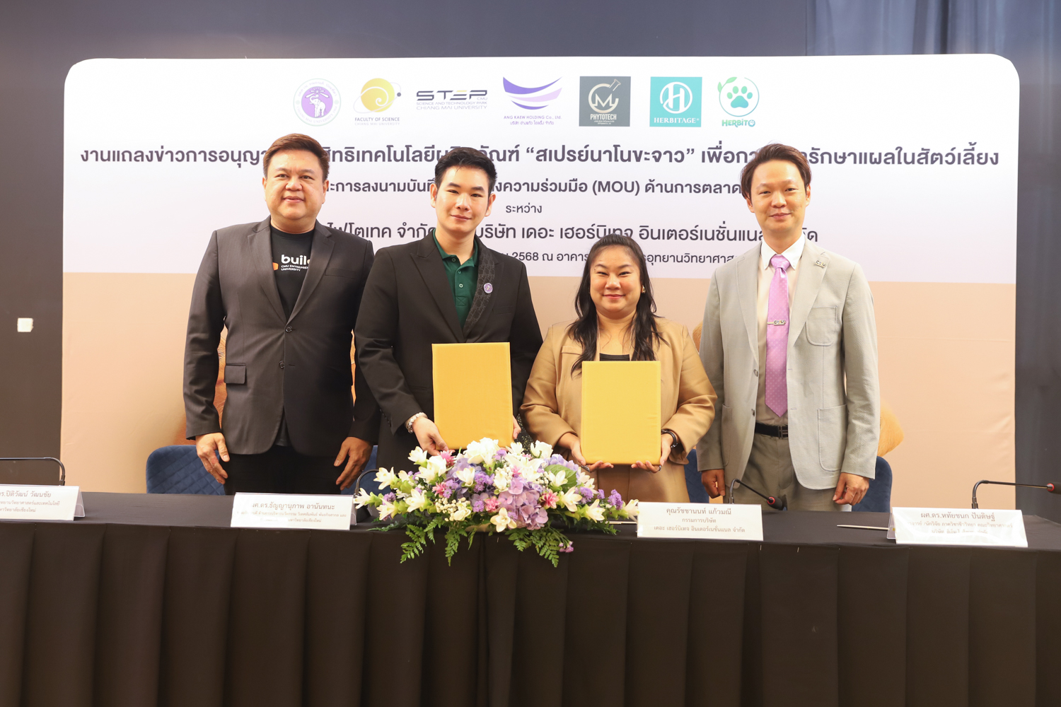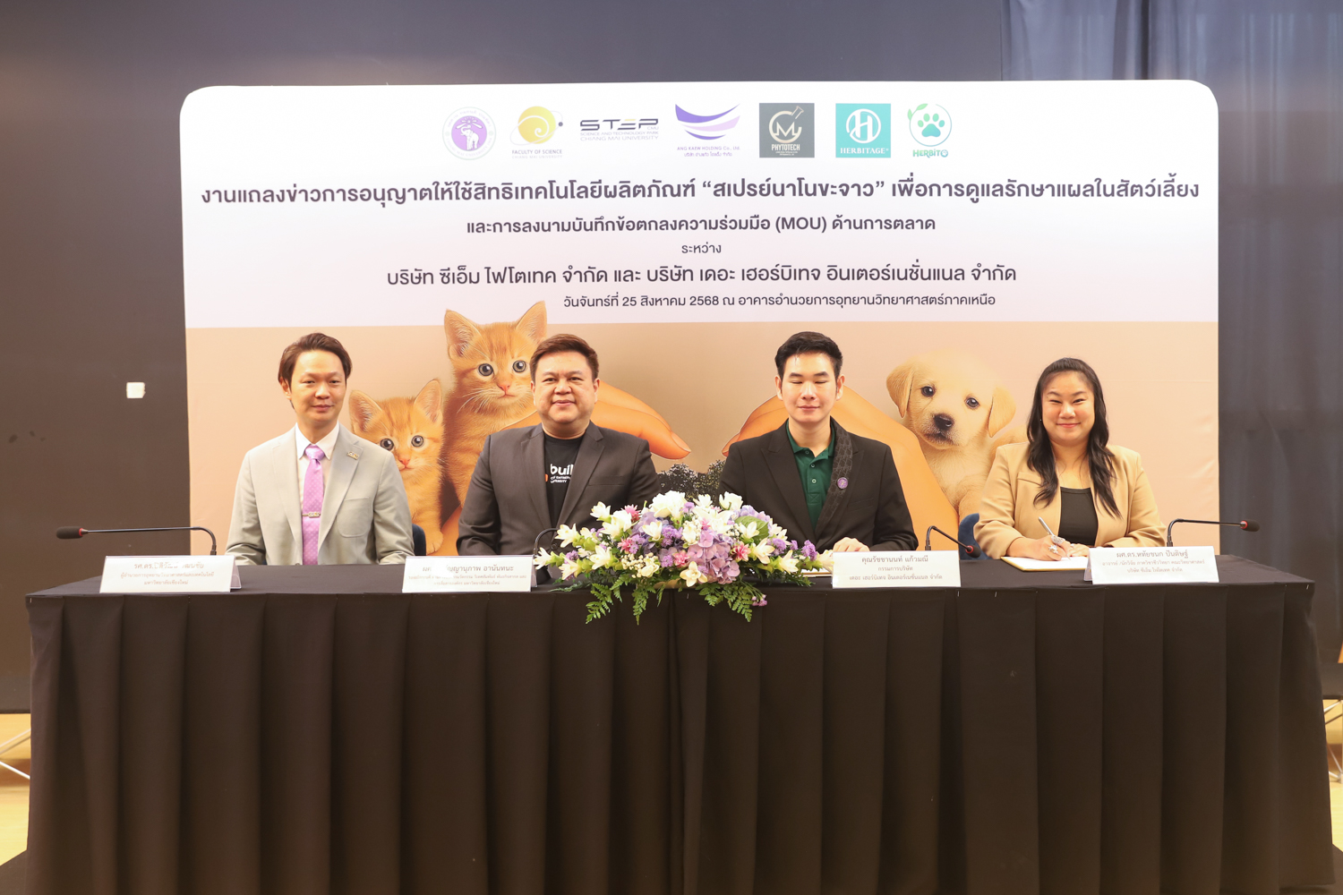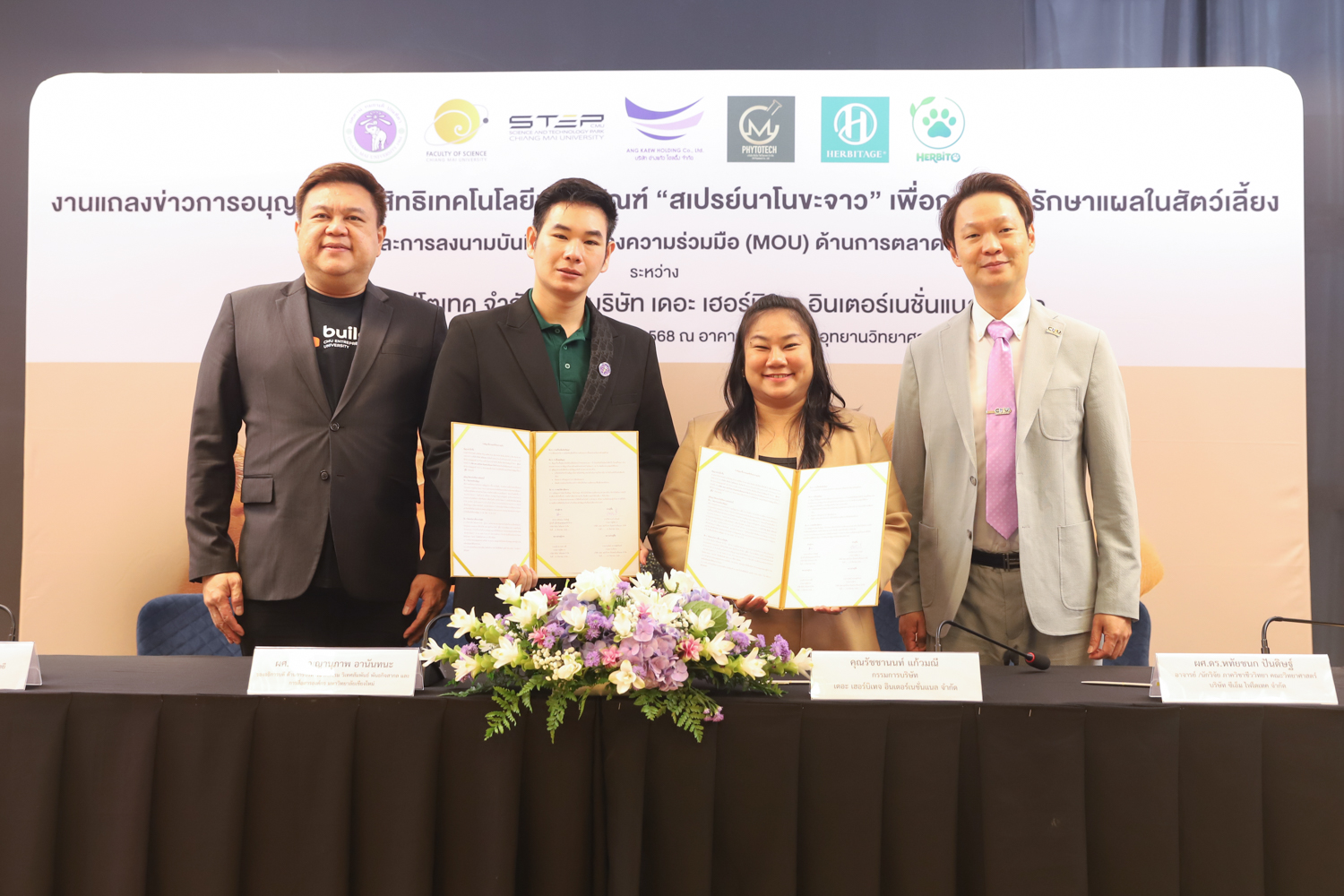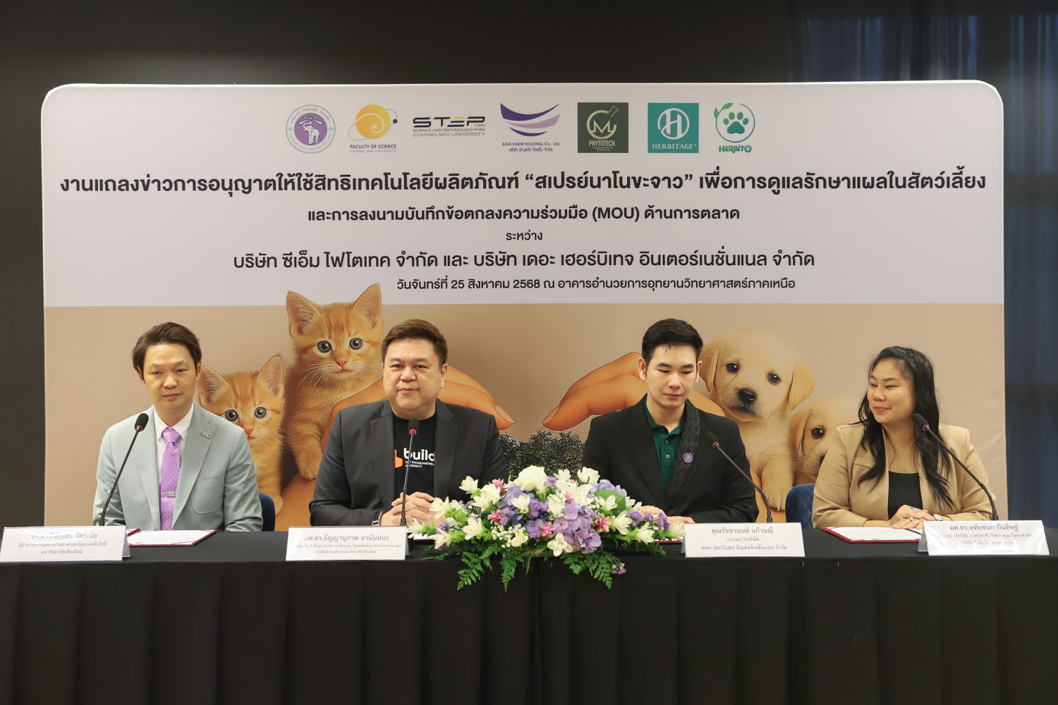 วันจันทร์ที่ 25 สิงหาคม 2568 มหาวิทยาลัยเชียงใหม่ จัดงานแถลงข่าวการลงนามสัญญาอนุญาตให้ใช้สิทธิเทคโนโลยี “สเปรย์นาโนขะจาว” เพื่อการดูแลรักษาแผลในสัตว์เลี้ยง ระหว่างมหาวิทยาลัยเชียงใหม่ (มช.) และบริษัท เดอะ เฮอร์บิเทจ อินเตอร์เนชั่นแนล จำกัด และพิธีลงนามทำบันทึกข้อตกลงความร่วมมือ (MOU) ระหว่างบริษัท ซีเอ็ม ไฟโตเทค จำกัด บริษัทในเครือบริษัท อ่างแก้วโฮลดิ้ง จำกัด โฮลดิ้งของมช. และบริษัท เดอะ เฮอร์บิเทจ อินเตอร์เนชั่นแนล จำกัด ณ NSP Exhibition Hall (B1) อาคารอำนวยการอุทยานวิทยาศาสตร์ภูมิภาค ภาคเหนือ (จ.เชียงใหม่) โดยได้รับเกียรติจาก ผศ.ดร.ธัญญานุภาพ อานันทนะ รองอธิการบดี มหาวิทยาลัยเชียงใหม่ ร่วมลงนามสัญญาอนุญาตให้ใช้สิทธิฯ ร่วมกับ คุณรัชชานนท์ แก้วมณี กรรมการบริษัท เดอะ เฮอร์บิเทจ อินเตอร์เนชั่นแนล จำกัด โดยความร่วมมือดังกล่าวจะขยายผลต่อยอดงานวิจัยสู่เชิงพาณิชย์ ควบคู่กับกลยุทธ์การตลาดทั้งในและต่างประเทศ ผ่านการกระจายผลิตภัณฑ์ไปยังโรงพยาบาลสัตว์ เพ็ทช็อป ห้างสรรพสินค้า และแพลตฟอร์มออนไลน์ พร้อมโครงการ CSR ที่สนับสนุนการรักษาสัตว์เลี้ยงด้อยโอกาส เพื่อสร้างคุณค่าให้สังคมควบคู่กับการเติบโตทางธุรกิจอีกด้วย