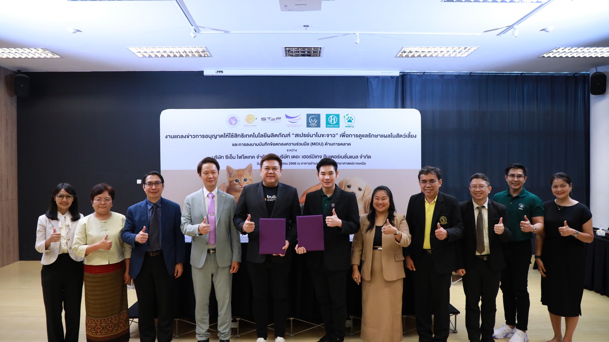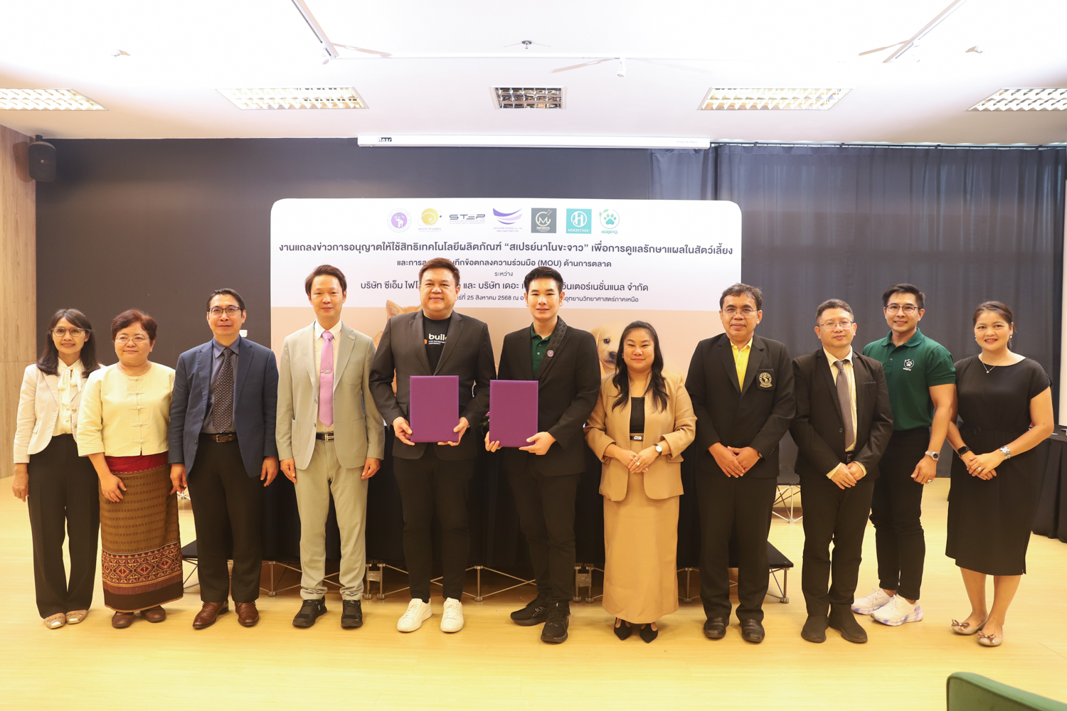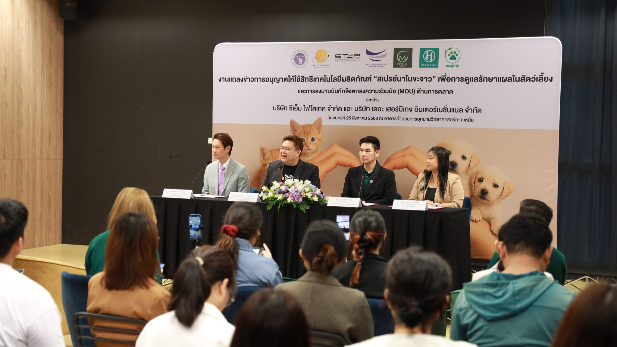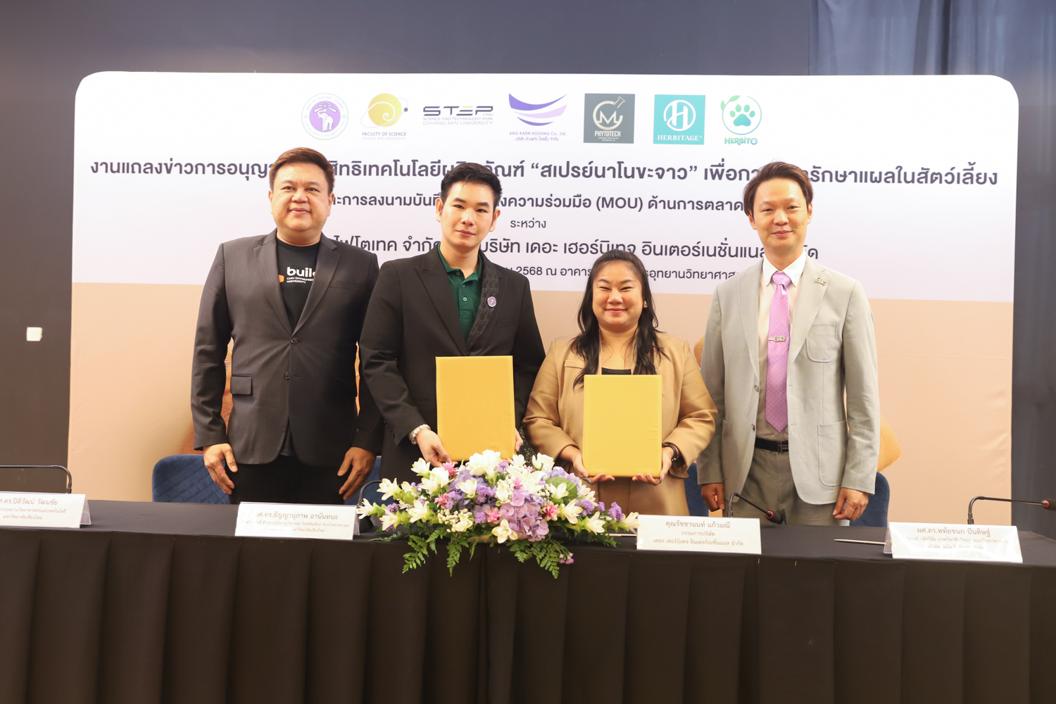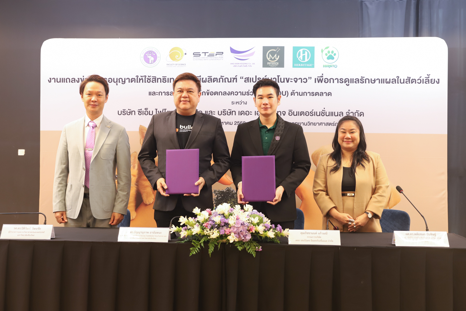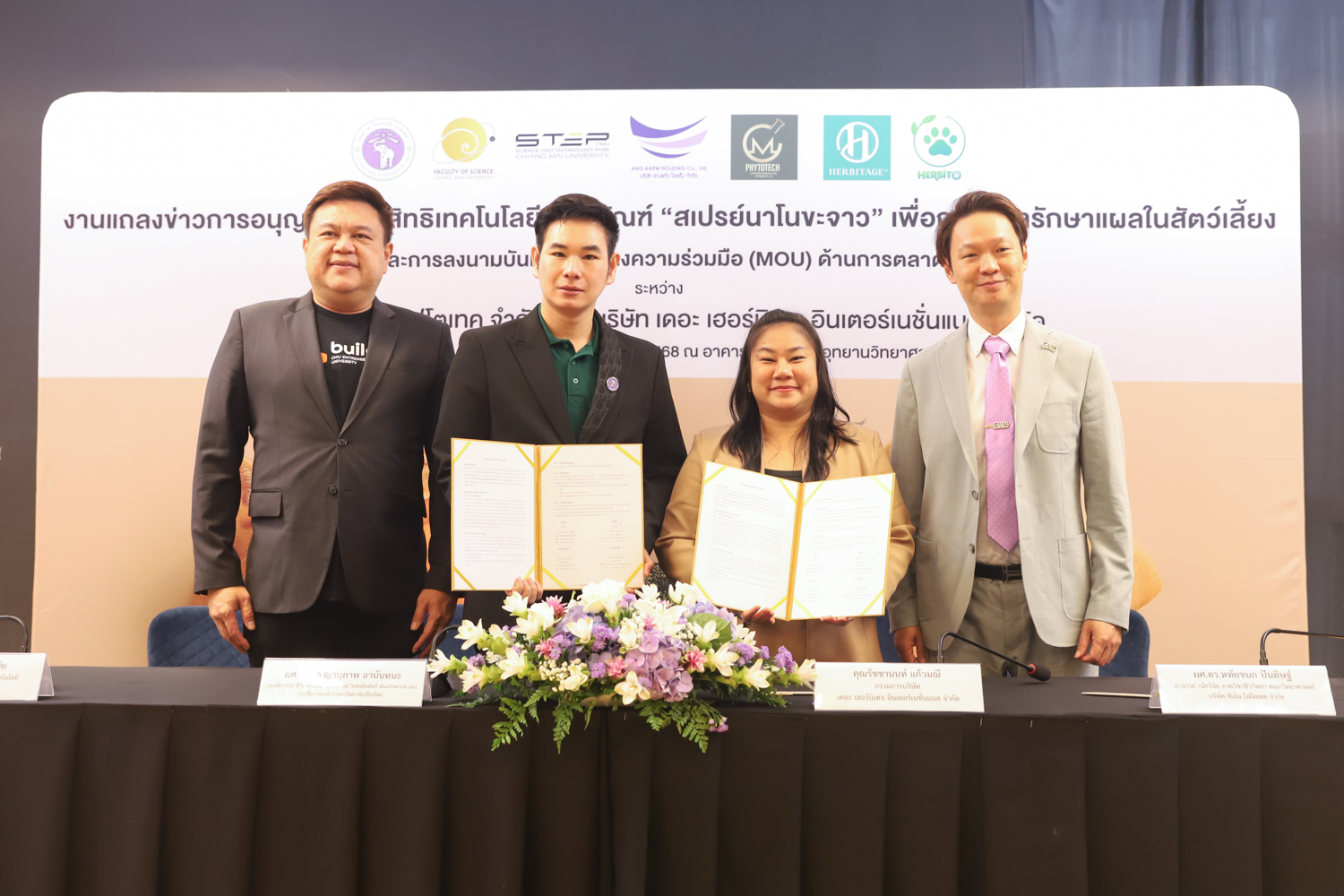 วันจันทร์ที่ 25 สิงหาคม 2568 มหาวิทยาลัยเชียงใหม่ จัดงานแถลงข่าวการลงนามสัญญาอนุญาตให้ใช้สิทธิเทคโนโลยี “สเปรย์นาโนขะจาว” เพื่อการดูแลรักษาแผลในสัตว์เลี้ยง ระหว่างมหาวิทยาลัยเชียงใหม่ (มช.) และบริษัท เดอะ เฮอร์บิเทจ อินเตอร์เนชั่นแนล จำกัด และพิธีลงนามทำบันทึกข้อตกลงความร่วมมือ (MOU) ระหว่างบริษัท ซีเอ็ม ไฟโตเทค จำกัด บริษัทในเครือบริษัท อ่างแก้วโฮลดิ้ง จำกัด โฮลดิ้งของมช. และบริษัท เดอะ เฮอร์บิเทจ อินเตอร์เนชั่นแนล จำกัด ณ NSP Exhibition Hall (B1) อาคารอำนวยการอุทยานวิทยาศาสตร์ภูมิภาค ภาคเหนือ (จ.เชียงใหม่) โดยได้รับเกียรติจาก ผศ.ดร.ธัญญานุภาพ อานันทนะ รองอธิการบดี มหาวิทยาลัยเชียงใหม่ ร่วมลงนามสัญญาอนุญาตให้ใช้สิทธิฯ ร่วมกับ คุณรัชชานนท์ แก้วมณี กรรมการบริษัท เดอะ เฮอร์บิเทจ อินเตอร์เนชั่นแนล จำกัด โดยความร่วมมือดังกล่าวจะขยายผลต่อยอดงานวิจัยสู่เชิงพาณิชย์ ควบคู่กับกลยุทธ์การตลาดทั้งในและต่างประเทศ ผ่านการกระจายผลิตภัณฑ์ไปยังโรงพยาบาลสัตว์ เพ็ทช็อป ห้างสรรพสินค้า และแพลตฟอร์มออนไลน์ พร้อมโครงการ CSR ที่สนับสนุนการรักษาสัตว์เลี้ยงด้อยโอกาส เพื่อสร้างคุณค่าให้สังคมควบคู่กับการเติบโตทางธุรกิจอีกด้วย