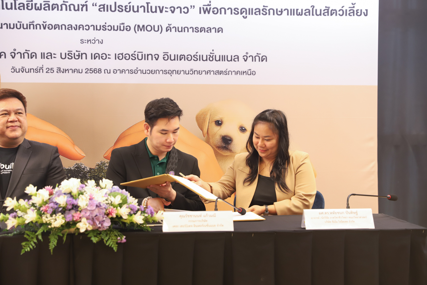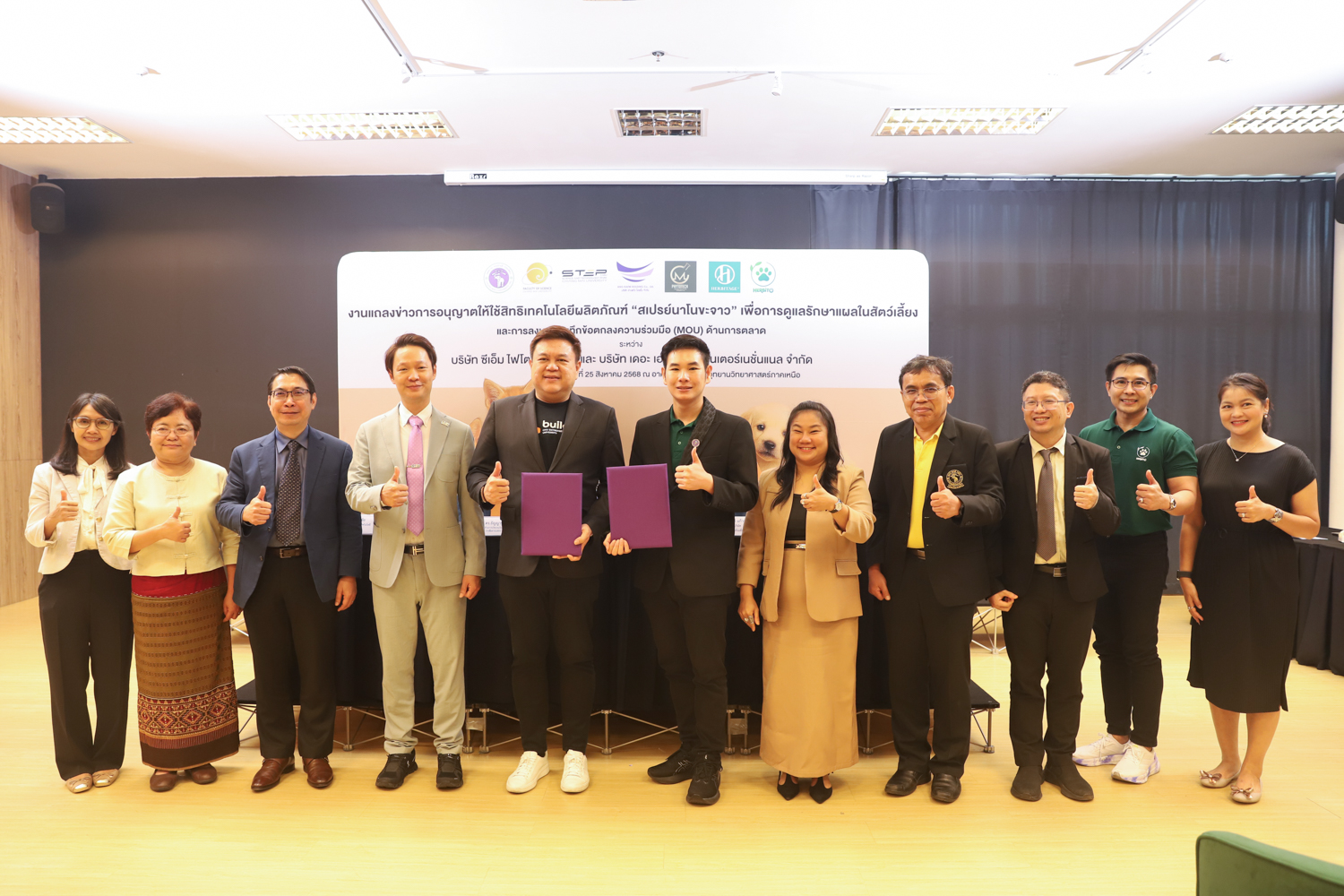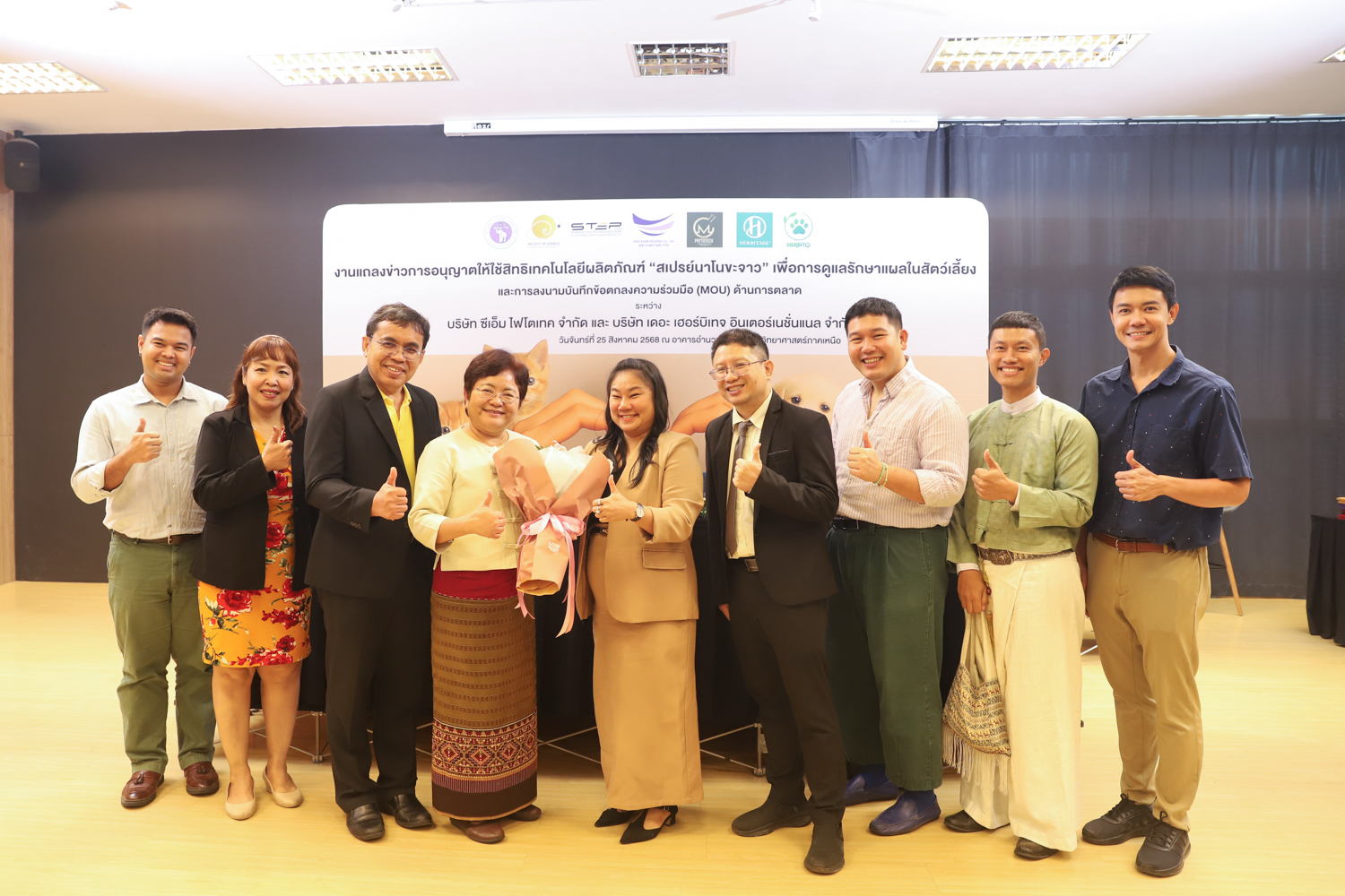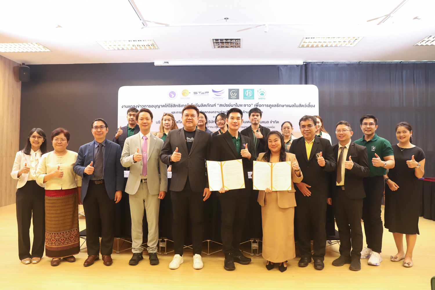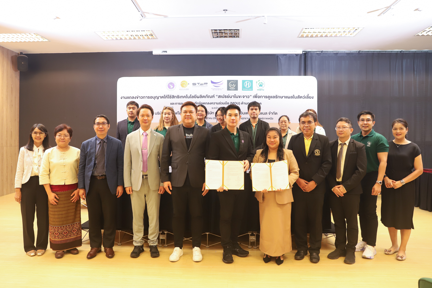 วันจันทร์ที่ 25 สิงหาคม 2568 มหาวิทยาลัยเชียงใหม่ จัดงานแถลงข่าวการลงนามสัญญาอนุญาตให้ใช้สิทธิเทคโนโลยี “สเปรย์นาโนขะจาว” เพื่อการดูแลรักษาแผลในสัตว์เลี้ยง ระหว่างมหาวิทยาลัยเชียงใหม่ (มช.) และบริษัท เดอะ เฮอร์บิเทจ อินเตอร์เนชั่นแนล จำกัด และพิธีลงนามทำบันทึกข้อตกลงความร่วมมือ (MOU) ระหว่างบริษัท ซีเอ็ม ไฟโตเทค จำกัด บริษัทในเครือบริษัท อ่างแก้วโฮลดิ้ง จำกัด โฮลดิ้งของมช. และบริษัท เดอะ เฮอร์บิเทจ อินเตอร์เนชั่นแนล จำกัด ณ NSP Exhibition Hall (B1) อาคารอำนวยการอุทยานวิทยาศาสตร์ภูมิภาค ภาคเหนือ (จ.เชียงใหม่) โดยได้รับเกียรติจาก ผศ.ดร.ธัญญานุภาพ อานันทนะ รองอธิการบดี มหาวิทยาลัยเชียงใหม่ ร่วมลงนามสัญญาอนุญาตให้ใช้สิทธิฯ ร่วมกับ คุณรัชชานนท์ แก้วมณี กรรมการบริษัท เดอะ เฮอร์บิเทจ อินเตอร์เนชั่นแนล จำกัด โดยความร่วมมือดังกล่าวจะขยายผลต่อยอดงานวิจัยสู่เชิงพาณิชย์ ควบคู่กับกลยุทธ์การตลาดทั้งในและต่างประเทศ ผ่านการกระจายผลิตภัณฑ์ไปยังโรงพยาบาลสัตว์ เพ็ทช็อป ห้างสรรพสินค้า และแพลตฟอร์มออนไลน์ พร้อมโครงการ CSR ที่สนับสนุนการรักษาสัตว์เลี้ยงด้อยโอกาส เพื่อสร้างคุณค่าให้สังคมควบคู่กับการเติบโตทางธุรกิจอีกด้วย