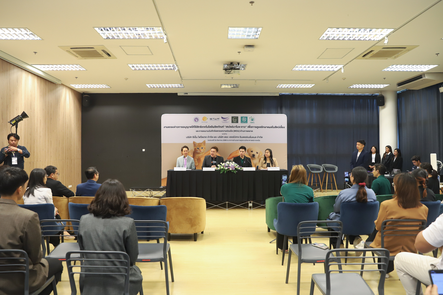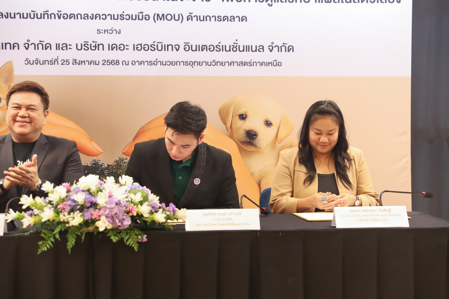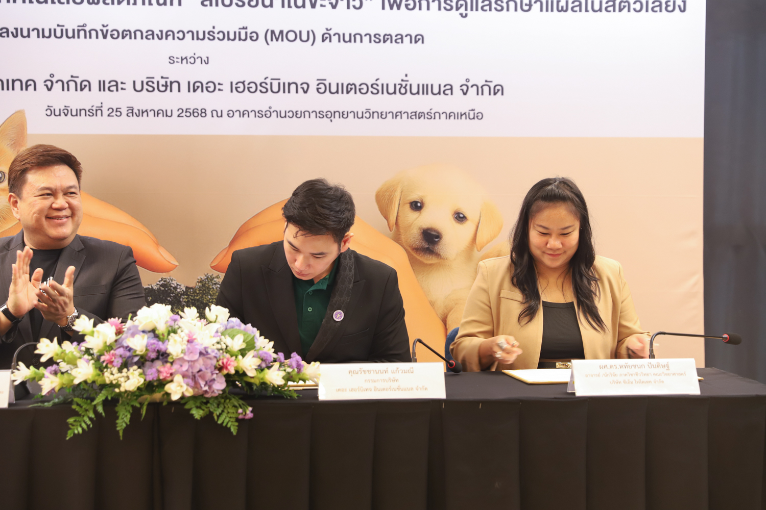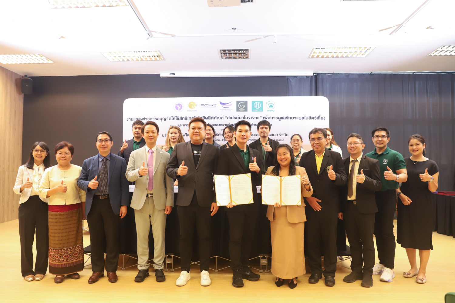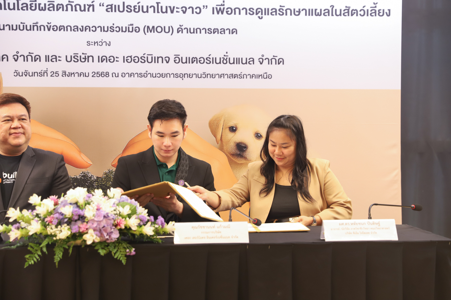 วันจันทร์ที่ 25 สิงหาคม 2568 มหาวิทยาลัยเชียงใหม่ จัดงานแถลงข่าวการลงนามสัญญาอนุญาตให้ใช้สิทธิเทคโนโลยี “สเปรย์นาโนขะจาว” เพื่อการดูแลรักษาแผลในสัตว์เลี้ยง ระหว่างมหาวิทยาลัยเชียงใหม่ (มช.) และบริษัท เดอะ เฮอร์บิเทจ อินเตอร์เนชั่นแนล จำกัด และพิธีลงนามทำบันทึกข้อตกลงความร่วมมือ (MOU) ระหว่างบริษัท ซีเอ็ม ไฟโตเทค จำกัด บริษัทในเครือบริษัท อ่างแก้วโฮลดิ้ง จำกัด โฮลดิ้งของมช. และบริษัท เดอะ เฮอร์บิเทจ อินเตอร์เนชั่นแนล จำกัด ณ NSP Exhibition Hall (B1) อาคารอำนวยการอุทยานวิทยาศาสตร์ภูมิภาค ภาคเหนือ (จ.เชียงใหม่) โดยได้รับเกียรติจาก ผศ.ดร.ธัญญานุภาพ อานันทนะ รองอธิการบดี มหาวิทยาลัยเชียงใหม่ ร่วมลงนามสัญญาอนุญาตให้ใช้สิทธิฯ ร่วมกับ คุณรัชชานนท์ แก้วมณี กรรมการบริษัท เดอะ เฮอร์บิเทจ อินเตอร์เนชั่นแนล จำกัด โดยความร่วมมือดังกล่าวจะขยายผลต่อยอดงานวิจัยสู่เชิงพาณิชย์ ควบคู่กับกลยุทธ์การตลาดทั้งในและต่างประเทศ ผ่านการกระจายผลิตภัณฑ์ไปยังโรงพยาบาลสัตว์ เพ็ทช็อป ห้างสรรพสินค้า และแพลตฟอร์มออนไลน์ พร้อมโครงการ CSR ที่สนับสนุนการรักษาสัตว์เลี้ยงด้อยโอกาส เพื่อสร้างคุณค่าให้สังคมควบคู่กับการเติบโตทางธุรกิจอีกด้วย