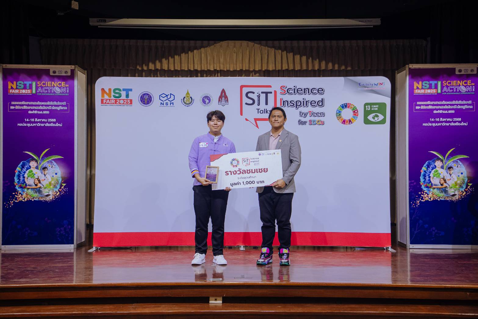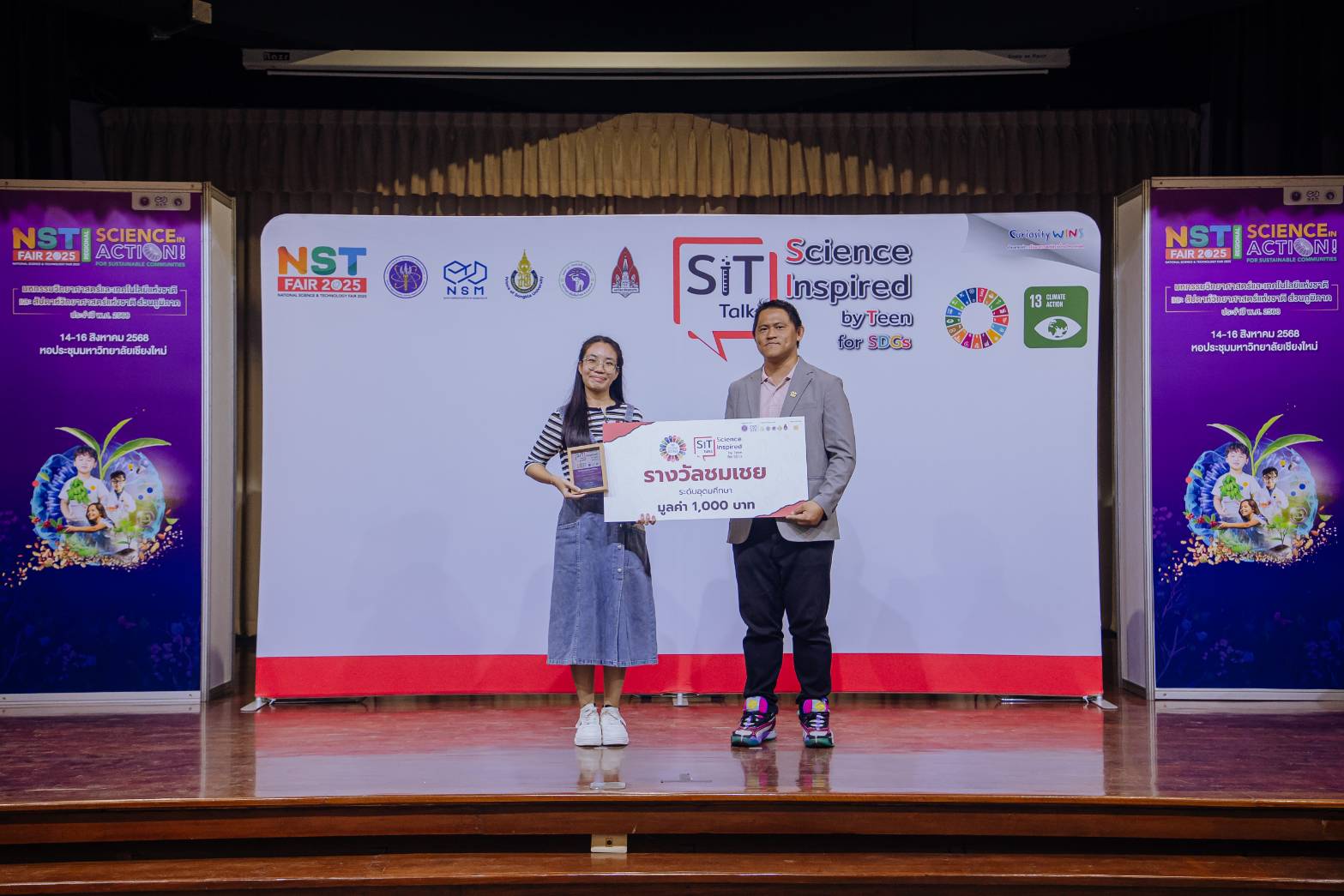 นายธัณยพงศ์ พุทธวงศ์ นักศึกษาระดับปริญญาตรี ชั้นปีที่ 1 และนางสาวปิ่นปินัทธ์ หวลจิตร์ นักศึกษาสาขาวิชาวิทยาศาสตร์สิ่งแวดล้อม ชั้นปีที่ 4 คณะวิทยาศาสตร์ ได้รับรางวัลชมเชยในการแข่งขัน ‘SiT Talks for SDGs : Science inspired by Teen – SDGs in Action’ ซึ่งจัดโดย องค์การพิพิธภัณฑ์วิทยาศาสตร์ แห่งชาติ (อพวช.) ร่วมกับมหาวิทยาลัยเชียงใหม่ เมื่อวันเสาร์ที่ 16 สิงหาคม 2558 ณ ห้องประชุมเล็ก หอประชุมมหาวิทยาลัยเชียงใหม่