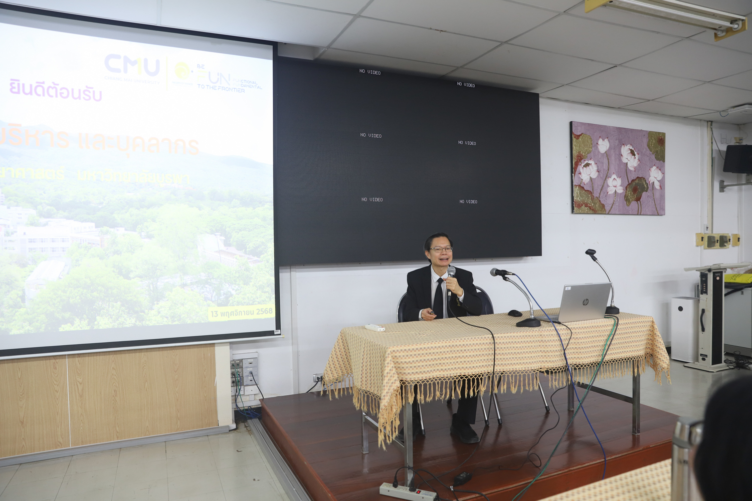 วันที่ 13 พฤศจิกายน 2568 รองศาสตราจารย์ ดร.ปิยะพงศ์ เนียมทรัพย์ คณบดีคณะวิทยาศาสตร์ มหาวิทยาลัยเชียงใหม่ พร้อมด้วยผู้บริหารและบุคลากร ร่วมให้การต้อนรับคณะผู้บริหารและบุคลากรจากคณะวิทยาศาสตร์ มหาวิทยาลัยบูรพา ซึ่งนำโดย รองศาสตราจารย์ ดร.อุษาวดี ตันติวรานุรักษ์ คณบดีคณะวิทยาศาสตร์ มหาวิทยาลัยบูรพา ในโอกาสเข้าศึกษาดูงานและแลกเปลี่ยนเรียนรู้เกี่ยวกับระบบบริหารงานสนับสนุนและคุณภาพของคณะวิทยาศาสตร์ มหาวิทยาลัยเชียงใหม่ ระบบสนับสนุนการปฏิบัติงานของงานต่างๆ ภายในสำนักงานคณะวิทยาศาสตร์ ตลอดจนเข้าเยี่ยมชมศูนย์เครื่องมือวิทยาศาสตร์ขั้นสูง ศูนย์บริการวิทยาศาสตร์และเทคโนโลยี และศูนย์ที่เกี่ยวข้อง โดยทั้ง 2 สถาบัน ได้ประสานความร่วมมือทั้งทางด้านวิชาการและการวิจัยอย่างใกล้ชิดมายาวนาน ในนามของคณะวิทยาศาสตร์ยินดีต้อนรับทุกท่าน และขอขอบคุณที่ให้ความไว้วางใจคณะวิทยาศาสตร์ในการถ่ายทอดประสบการณ์ครั้งนี้