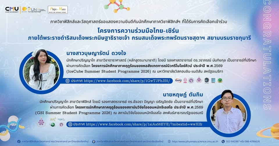 2 นักศึกษาภาควิชาฟิสิกส์ฯ ได้รับการคัดเลือกเข้าร่วมโครงการนักศึกษาภาคฤดูร้อน ณ สหรัฐอเมริกา และเยอรมนี ภายใต้โครงการในพระราชดำริฯ