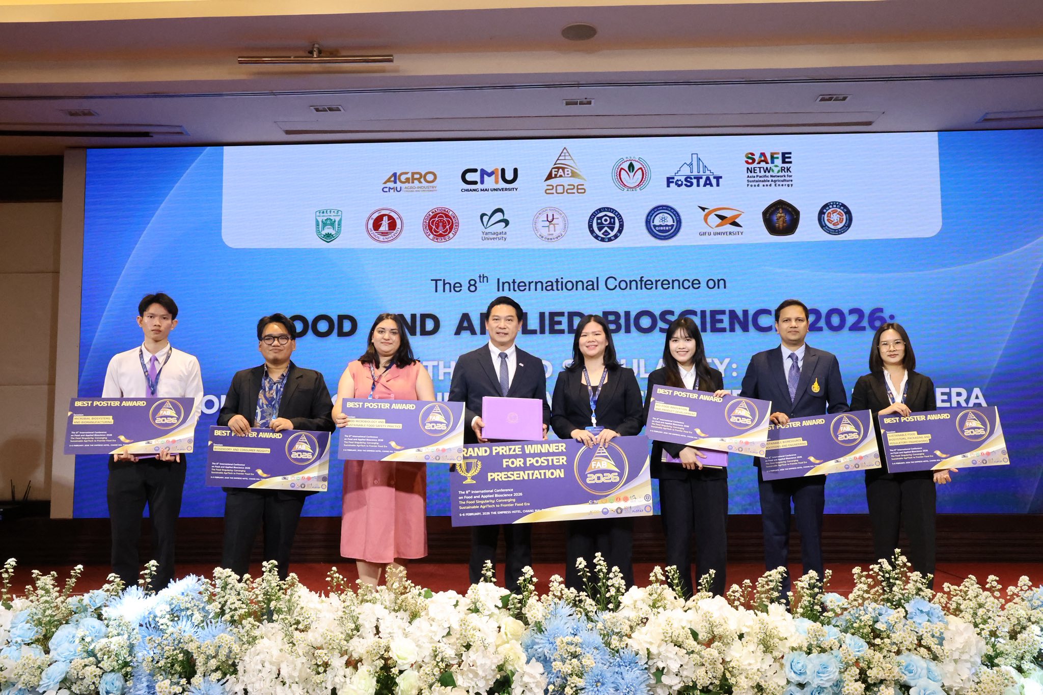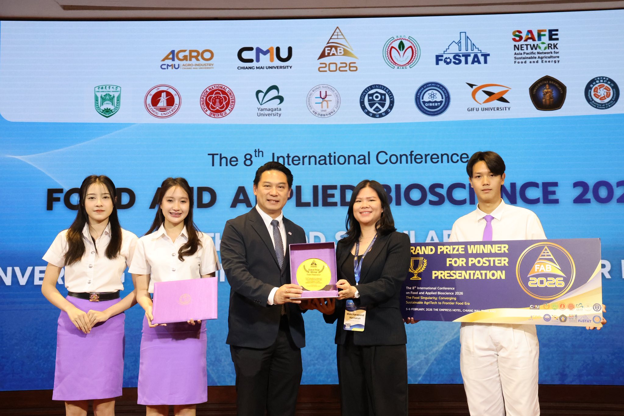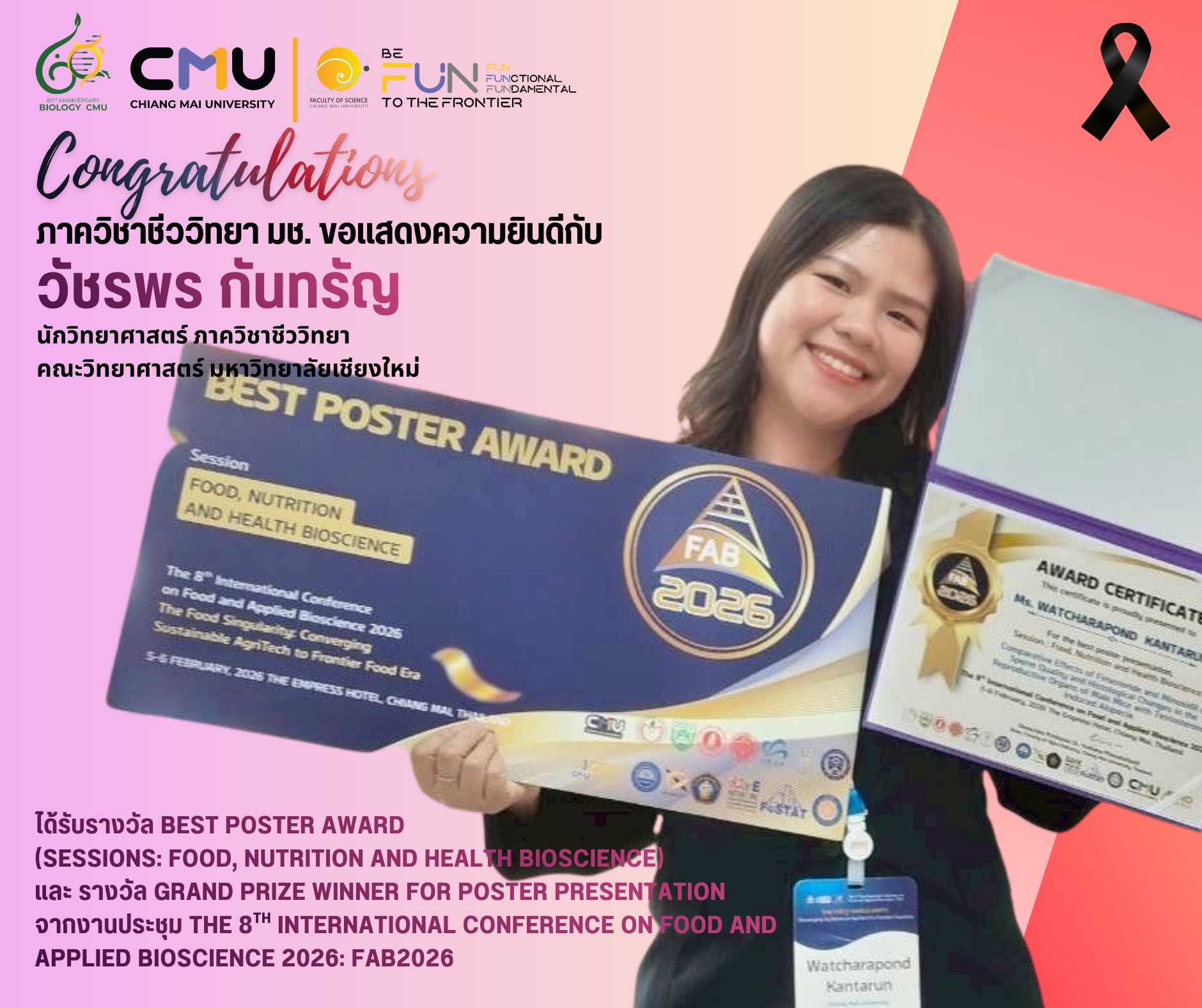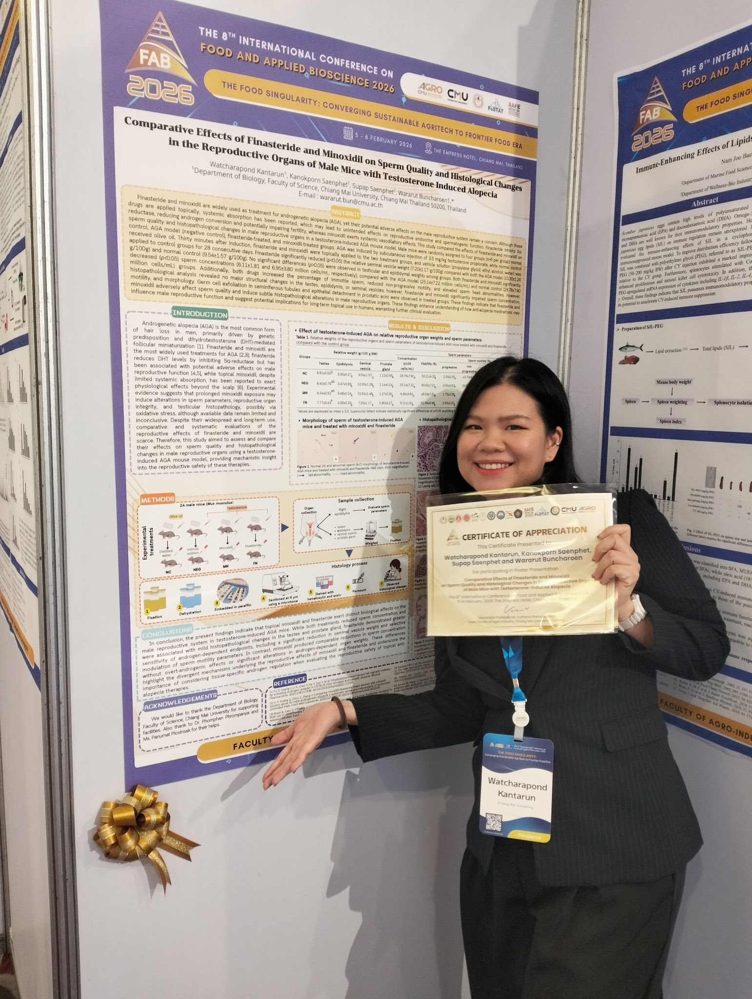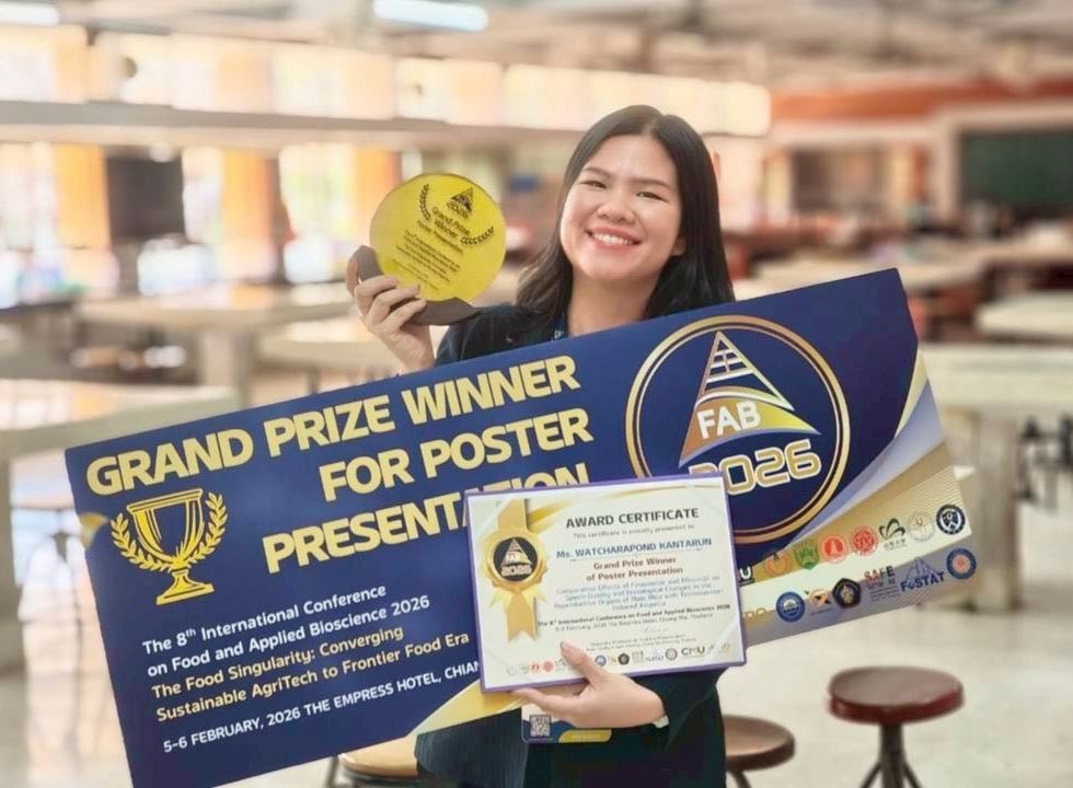 นางสาววัชรพร กันทรัญ (MS. WATCHARAPOND KANTARUN) นักวิทยาศาสตร์ ภาควิชาชีววิทยา คณะวิทยาศาสตร์ มหาวิทยาลัยเชียงใหม่ ได้นำเสนอผลงานในรูปแบบโปสเตอร์ (Poster Presentation) ในหัวข้อ “Comparative Effects of Finasteride and Minoxidil on Sperm Quality and Histological Changes in the Reproductive Organs of Male Mice with Testosterone-Induced Alopecia” ได้รับรางวัล Best poster Award (sessions: Food, Nutrition and Health Bioscience) และรางวัล Grand prize winner for poster presentation ในงานการประชุมวิชาการนานาชาติด้านอาหารและชีวภาพประยุกต์ ครั้งที่ 8 (The 8th International Conference on Food and Applied Bioscience 2026: FAB2026) จัดขึ้นระหว่างวันที่ 5–6 กุมภาพันธ์ 2569 ณ โรงแรมดิเอ็มเพรส จังหวัดเชียงใหม่