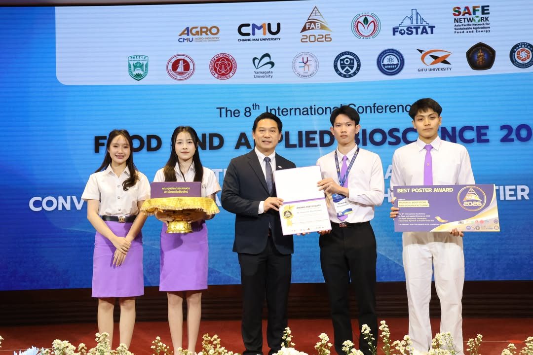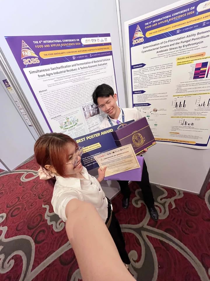 ผลงานดังกล่าวได้รับรางวัล Best Poster Presentation Award ในกลุ่ม Microbial Biosystems and Biomanufacturing จากการประชุมวิชาการนานาชาติ The 8th International Conference on Food and Applied Bioscience 2026 (FAB2026) ซึ่งจัดขึ้น ณ The Empress Hotel จังหวัดเชียงใหม่ เมื่อวันที่ 5–6 กุมภาพันธ์ 2569