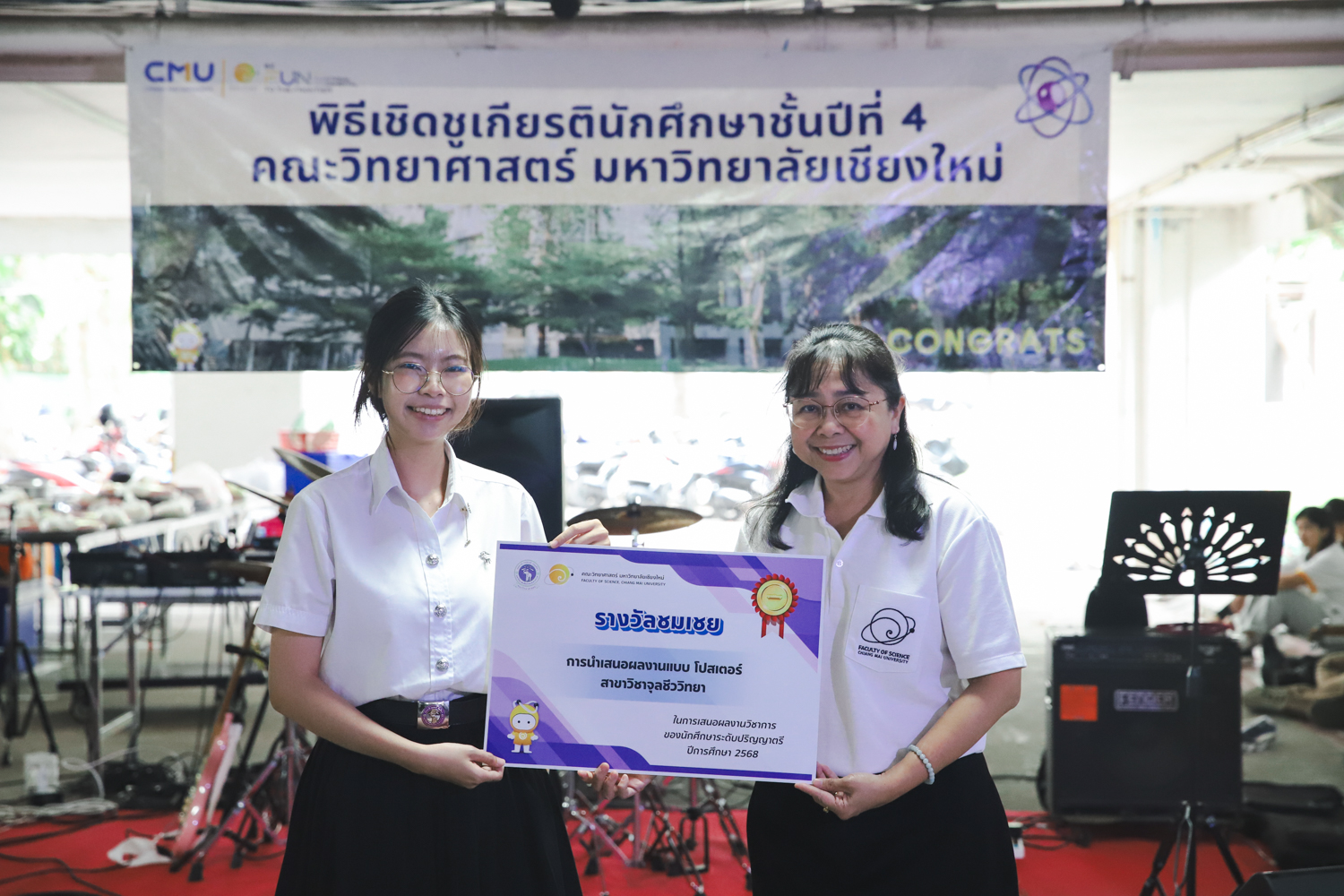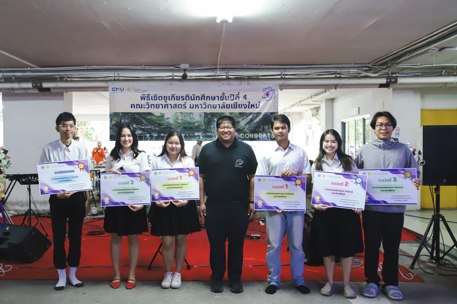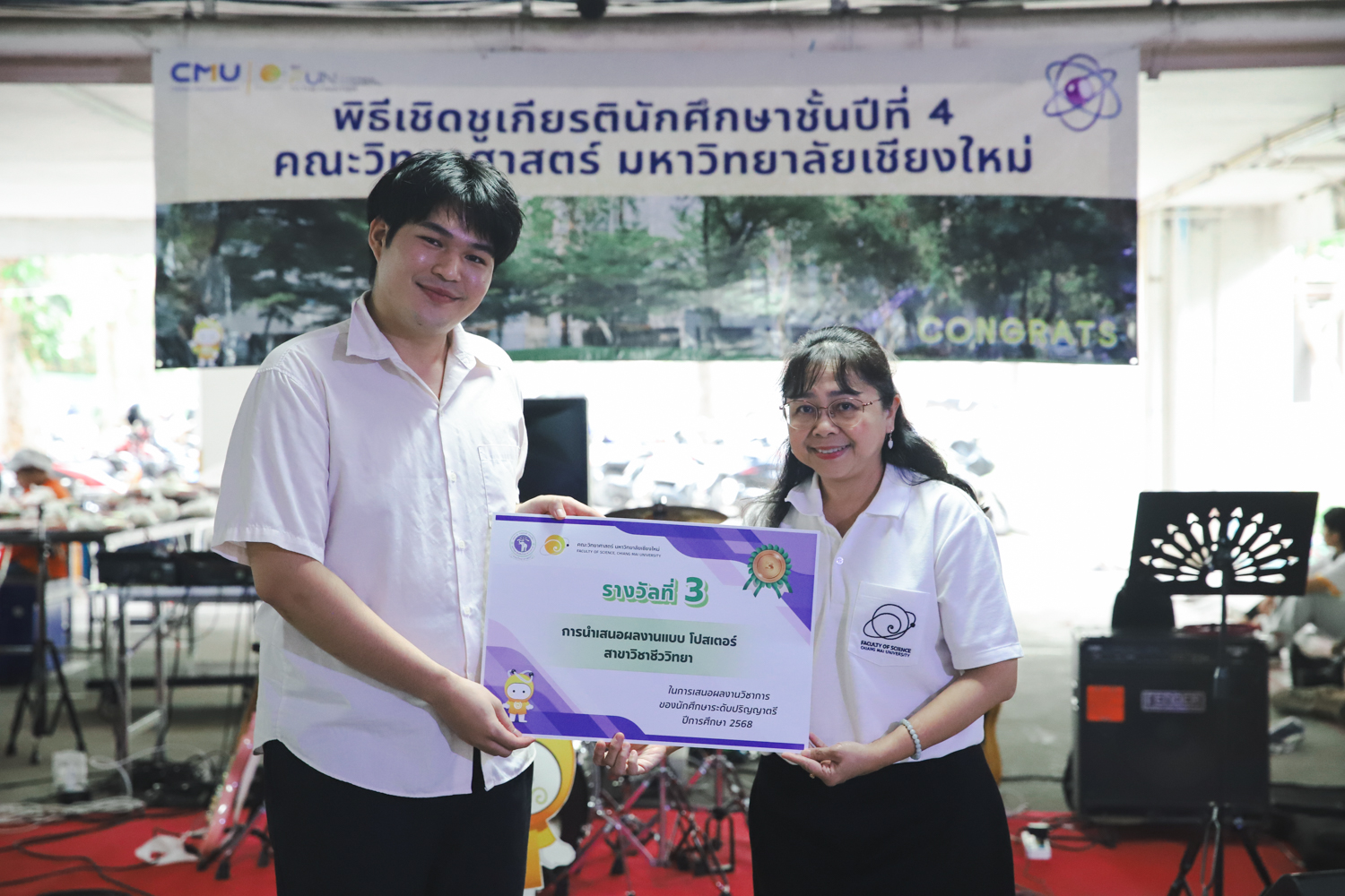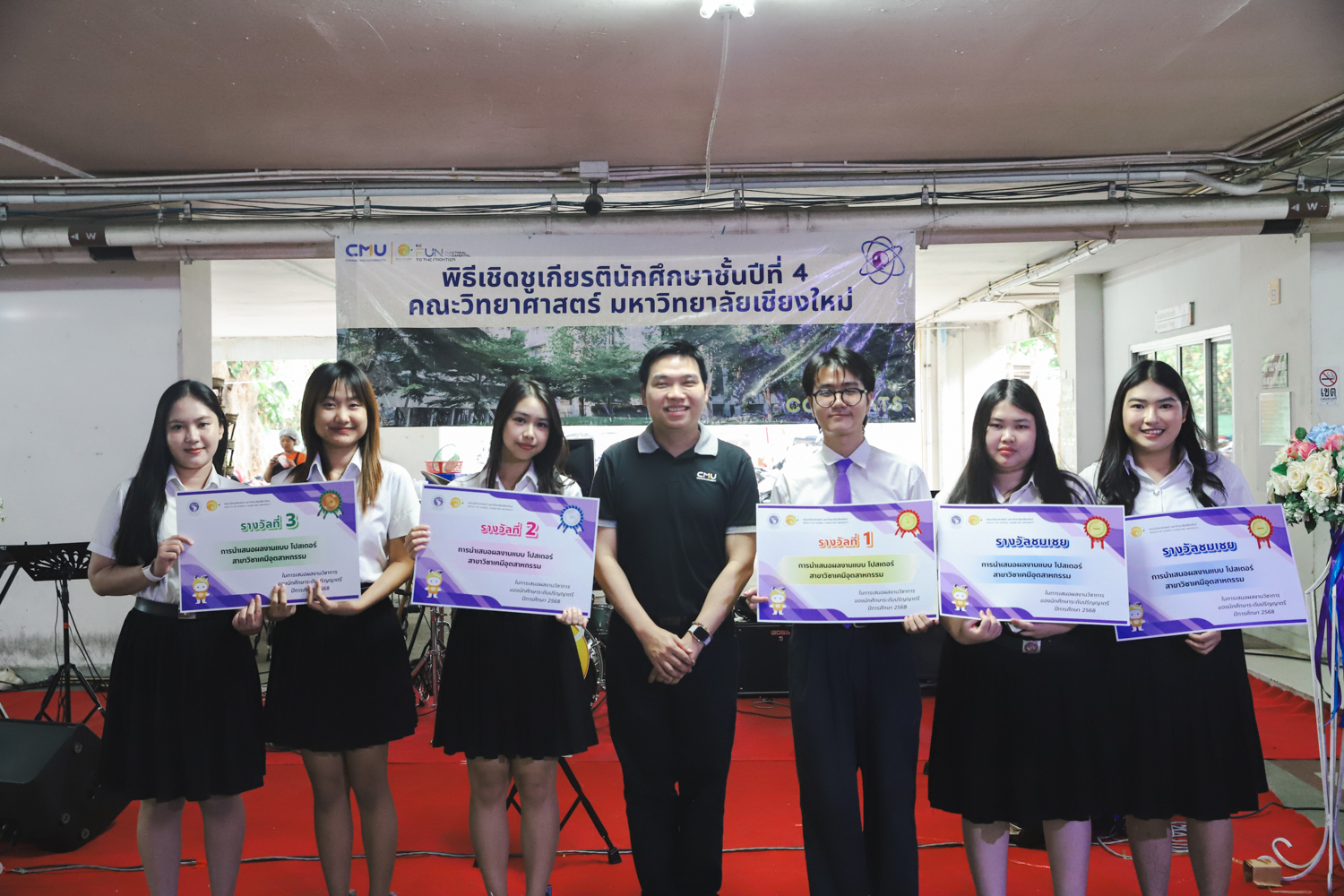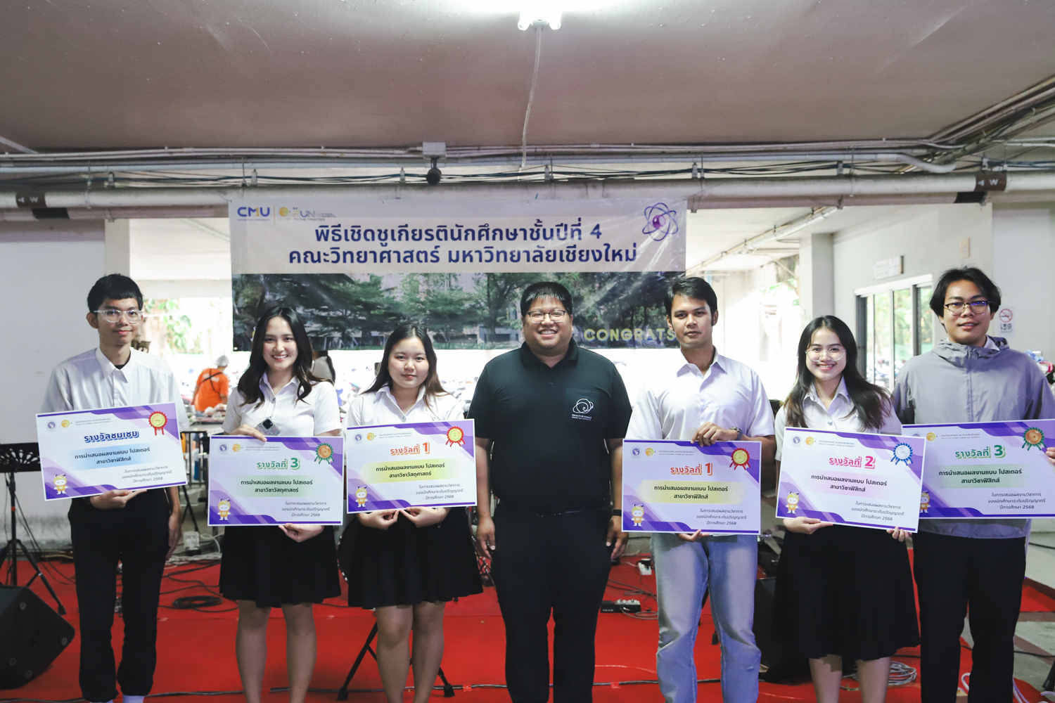 เมื่อวันที่ 11 มีนาคม 2569 ณ อาคาร 40 ปีฯ คณะวิทยาศาสตร์จัดพิธีปัจฉิมนิเทศและงานเลี้ยงแสดงความยินดีกับนักศึกษาชั้นปีที่ 4 ประจำปีการศึกษา 2568 โดยได้รับเกียรติจาก ศาสตราจารย์ ดร.ปิยะพงศ์ เนียมทรัพย์ คณบดีคณะวิทยาศาสตร์ กล่าวแสดงความยินดีและให้โอวาทแก่นักศึกษา โดยเน้นย้ำถึงการนำความรู้ทางวิทยาศาสตร์ไปสร้างคุณประโยชน์ทั้งต่อตนเองและสังคม โดยไฮไลท์สำคัญภายในงานนอกจากจะเป็นการเฉลิมฉลองความสำเร็จก้าวแรกของพี่ปี 4 แล้ว ยังมีการมอบรางวัลเพื่อเชิดชูความเก่งและความทุ่มเทของเหล่านักศึกษาในด้านต่าง ๆ เช่น เกียรติบัตรคณะกรรมการสโมสรนักศึกษา เพื่อชื่นชมผู้เสียสละทำงานเพื่อส่วนรวมตลอดปีการศึกษา รางวัล The Best Atom รางวัลสุดพิเศษที่มอบให้แก่ไอดอลต้นแบบของคณะฯ ในสาขาต่างๆ รางวัลการนำเสนอผลงานทางวิชาการ ที่การันตีคุณภาพความรู้และความเชี่ยวชาญก่อนออกสู่โลกกว้างของนักศึกษา บรรยากาศการจัดงานเต็มไปด้วยรอยยิ้มและความประทับใจ ตอกย้ำความสัมพันธ์ที่เหนียวแน่นของครอบครัววิทยา มช.