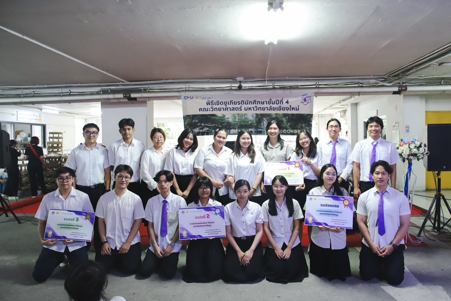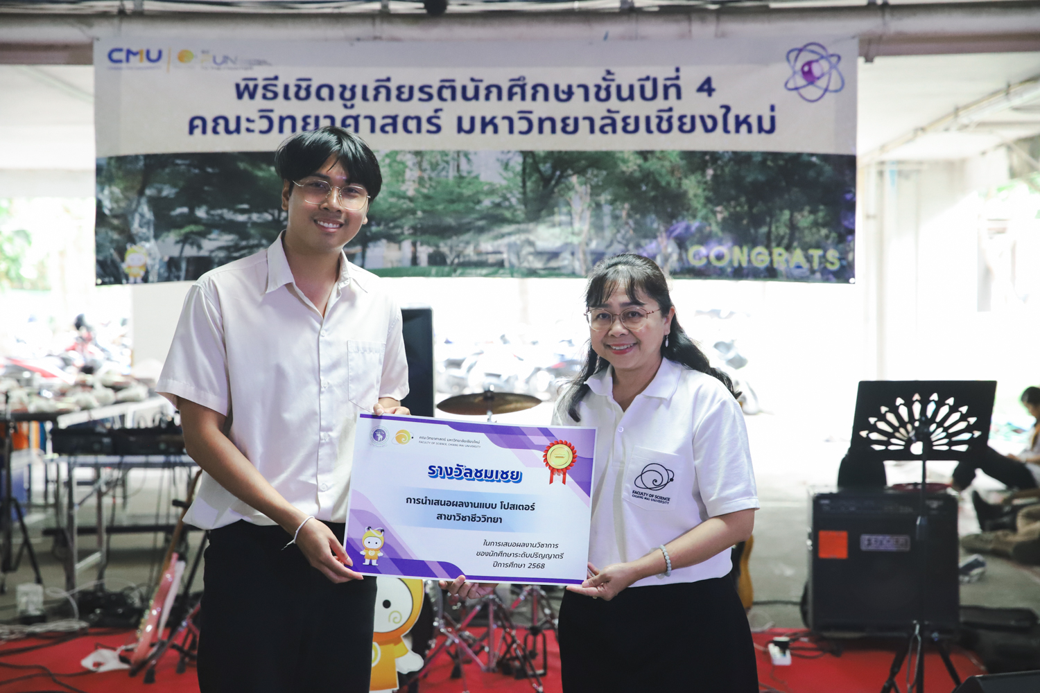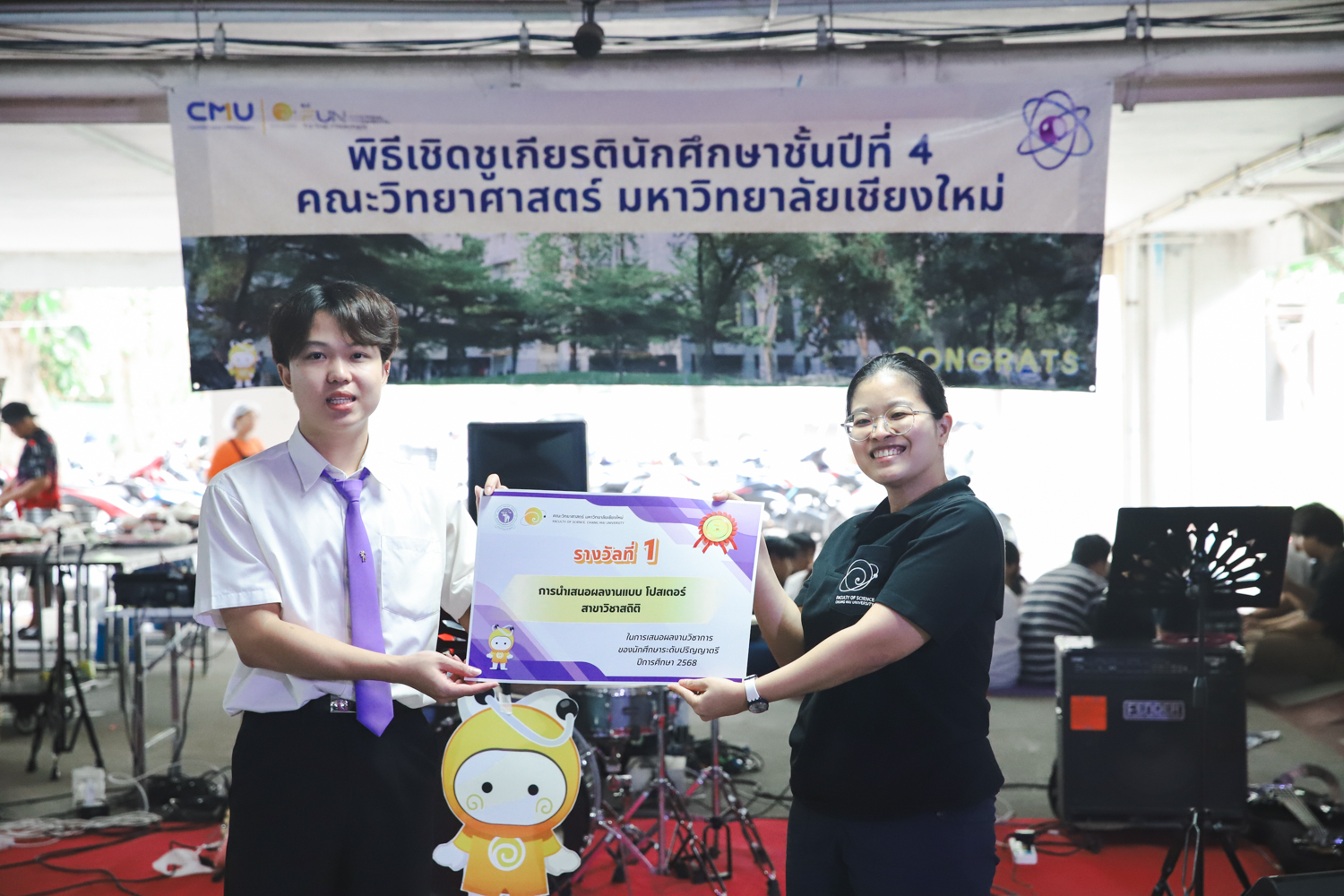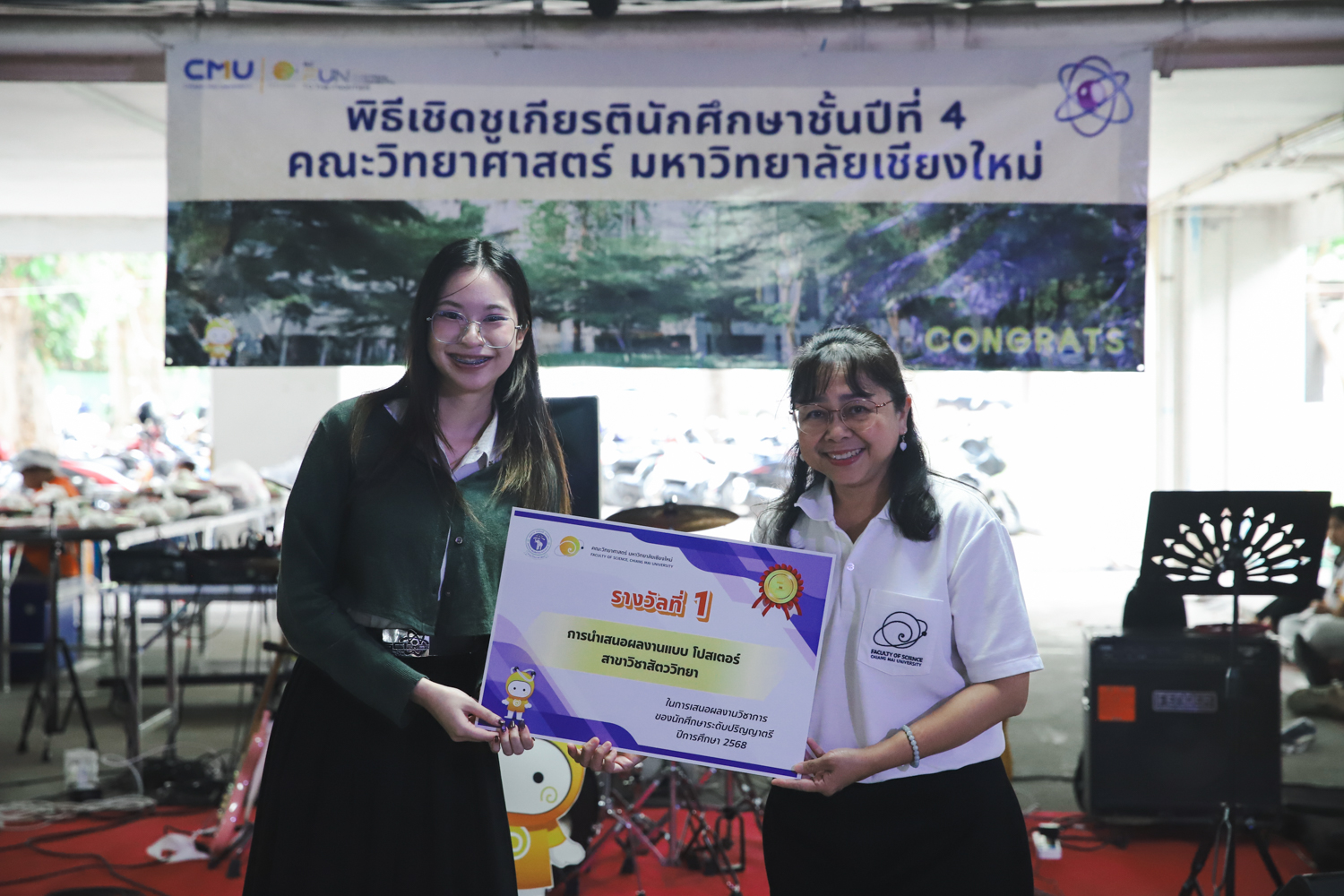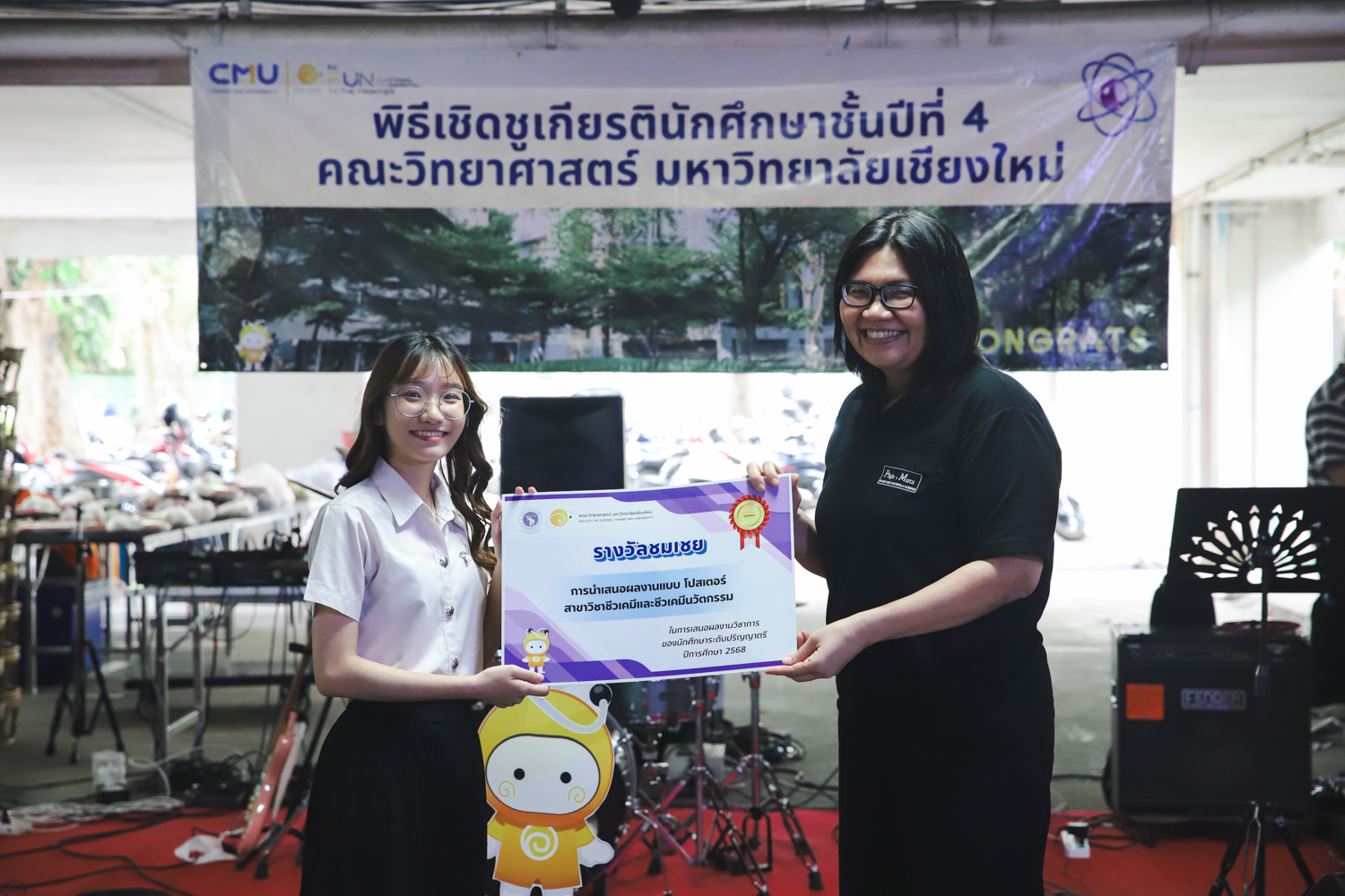 เมื่อวันที่ 11 มีนาคม 2569 ณ อาคาร 40 ปีฯ คณะวิทยาศาสตร์จัดพิธีปัจฉิมนิเทศและงานเลี้ยงแสดงความยินดีกับนักศึกษาชั้นปีที่ 4 ประจำปีการศึกษา 2568 โดยได้รับเกียรติจาก ศาสตราจารย์ ดร.ปิยะพงศ์ เนียมทรัพย์ คณบดีคณะวิทยาศาสตร์ กล่าวแสดงความยินดีและให้โอวาทแก่นักศึกษา โดยเน้นย้ำถึงการนำความรู้ทางวิทยาศาสตร์ไปสร้างคุณประโยชน์ทั้งต่อตนเองและสังคม โดยไฮไลท์สำคัญภายในงานนอกจากจะเป็นการเฉลิมฉลองความสำเร็จก้าวแรกของพี่ปี 4 แล้ว ยังมีการมอบรางวัลเพื่อเชิดชูความเก่งและความทุ่มเทของเหล่านักศึกษาในด้านต่าง ๆ เช่น เกียรติบัตรคณะกรรมการสโมสรนักศึกษา เพื่อชื่นชมผู้เสียสละทำงานเพื่อส่วนรวมตลอดปีการศึกษา รางวัล The Best Atom รางวัลสุดพิเศษที่มอบให้แก่ไอดอลต้นแบบของคณะฯ ในสาขาต่างๆ รางวัลการนำเสนอผลงานทางวิชาการ ที่การันตีคุณภาพความรู้และความเชี่ยวชาญก่อนออกสู่โลกกว้างของนักศึกษา บรรยากาศการจัดงานเต็มไปด้วยรอยยิ้มและความประทับใจ ตอกย้ำความสัมพันธ์ที่เหนียวแน่นของครอบครัววิทยา มช.