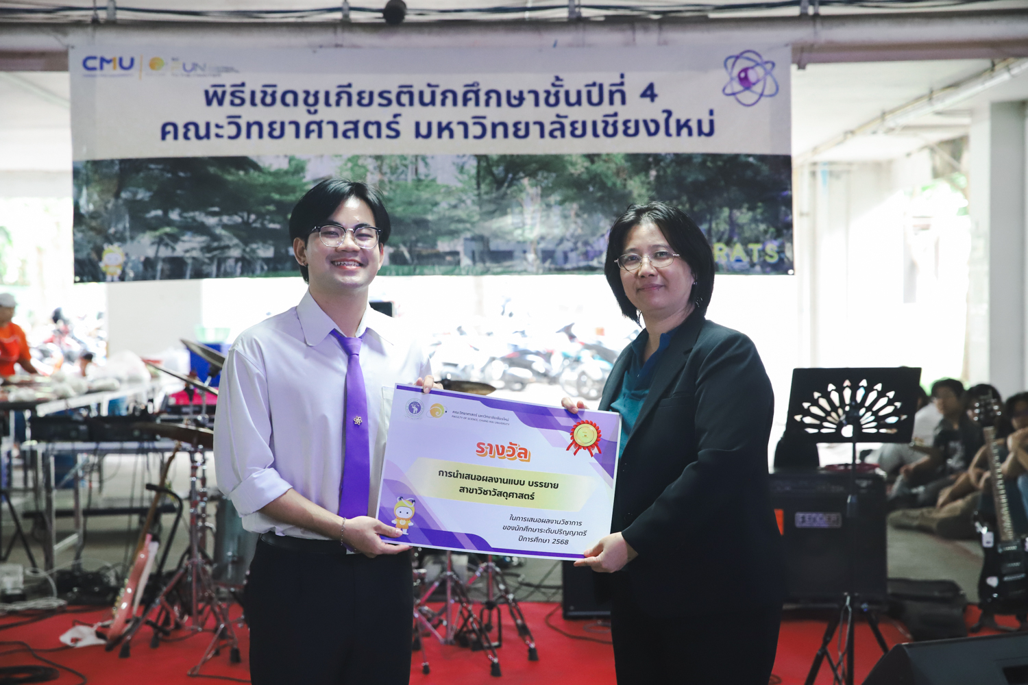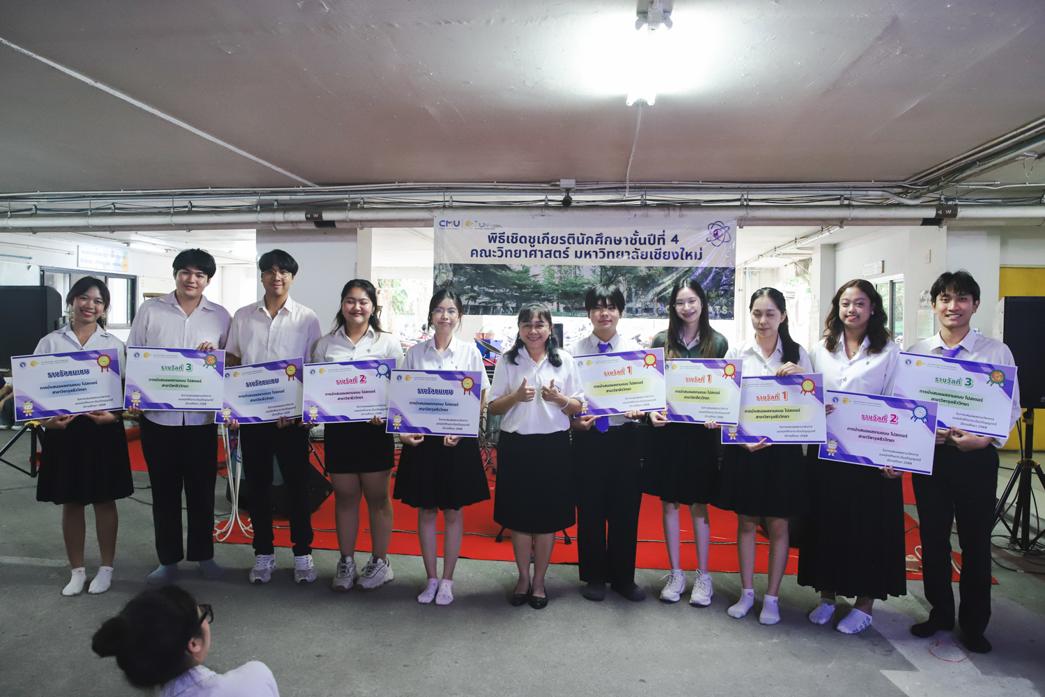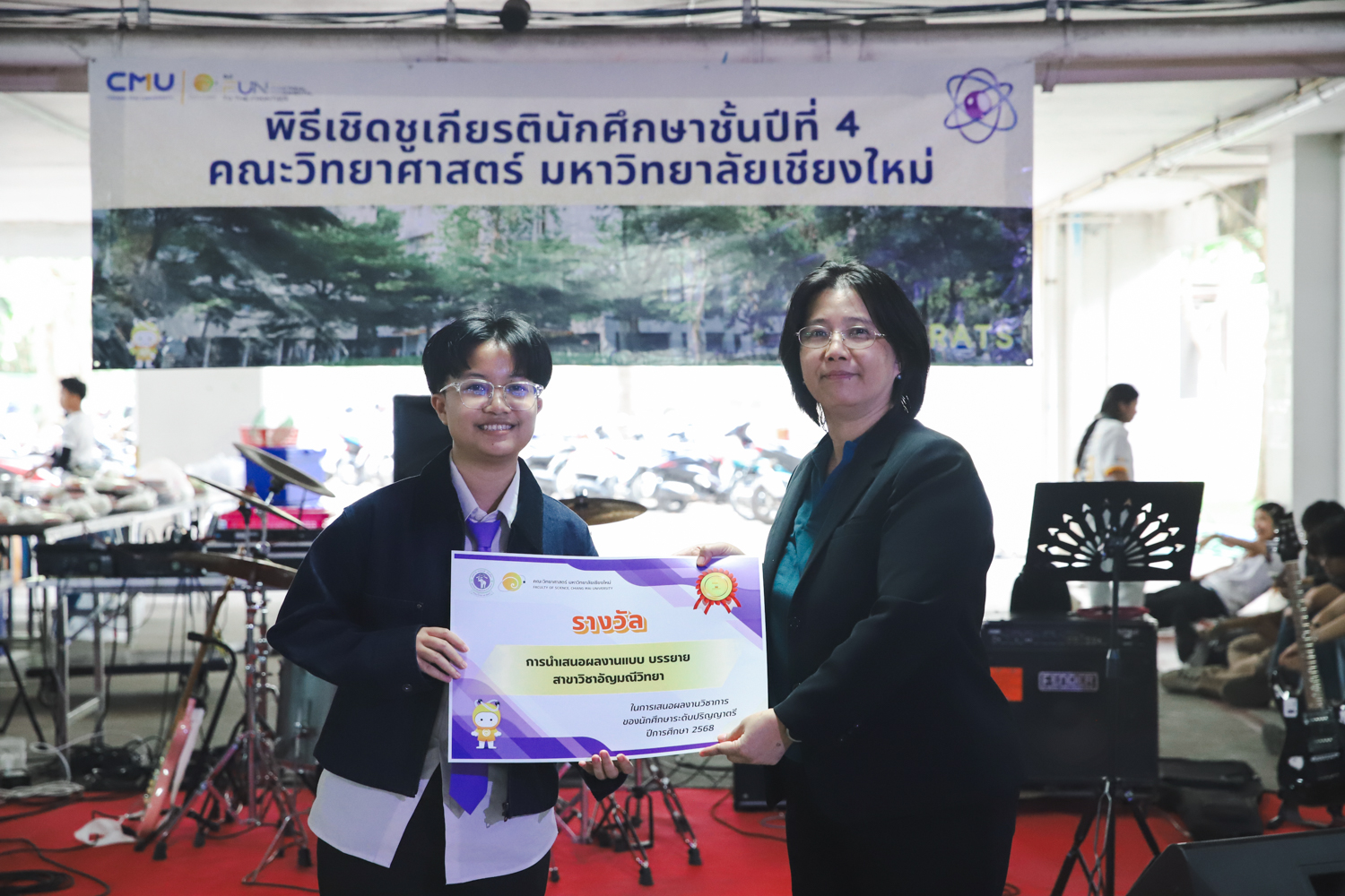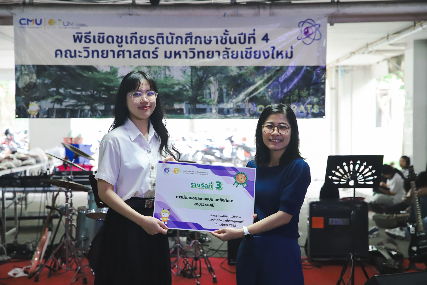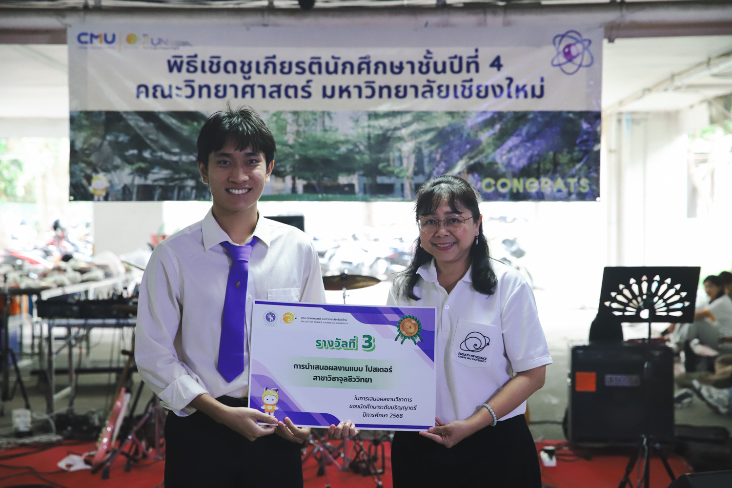 เมื่อวันที่ 11 มีนาคม 2569 ณ อาคาร 40 ปีฯ คณะวิทยาศาสตร์จัดพิธีปัจฉิมนิเทศและงานเลี้ยงแสดงความยินดีกับนักศึกษาชั้นปีที่ 4 ประจำปีการศึกษา 2568 โดยได้รับเกียรติจาก ศาสตราจารย์ ดร.ปิยะพงศ์ เนียมทรัพย์ คณบดีคณะวิทยาศาสตร์ กล่าวแสดงความยินดีและให้โอวาทแก่นักศึกษา โดยเน้นย้ำถึงการนำความรู้ทางวิทยาศาสตร์ไปสร้างคุณประโยชน์ทั้งต่อตนเองและสังคม โดยไฮไลท์สำคัญภายในงานนอกจากจะเป็นการเฉลิมฉลองความสำเร็จก้าวแรกของพี่ปี 4 แล้ว ยังมีการมอบรางวัลเพื่อเชิดชูความเก่งและความทุ่มเทของเหล่านักศึกษาในด้านต่าง ๆ เช่น เกียรติบัตรคณะกรรมการสโมสรนักศึกษา เพื่อชื่นชมผู้เสียสละทำงานเพื่อส่วนรวมตลอดปีการศึกษา รางวัล The Best Atom รางวัลสุดพิเศษที่มอบให้แก่ไอดอลต้นแบบของคณะฯ ในสาขาต่างๆ รางวัลการนำเสนอผลงานทางวิชาการ ที่การันตีคุณภาพความรู้และความเชี่ยวชาญก่อนออกสู่โลกกว้างของนักศึกษา บรรยากาศการจัดงานเต็มไปด้วยรอยยิ้มและความประทับใจ ตอกย้ำความสัมพันธ์ที่เหนียวแน่นของครอบครัววิทยา มช.