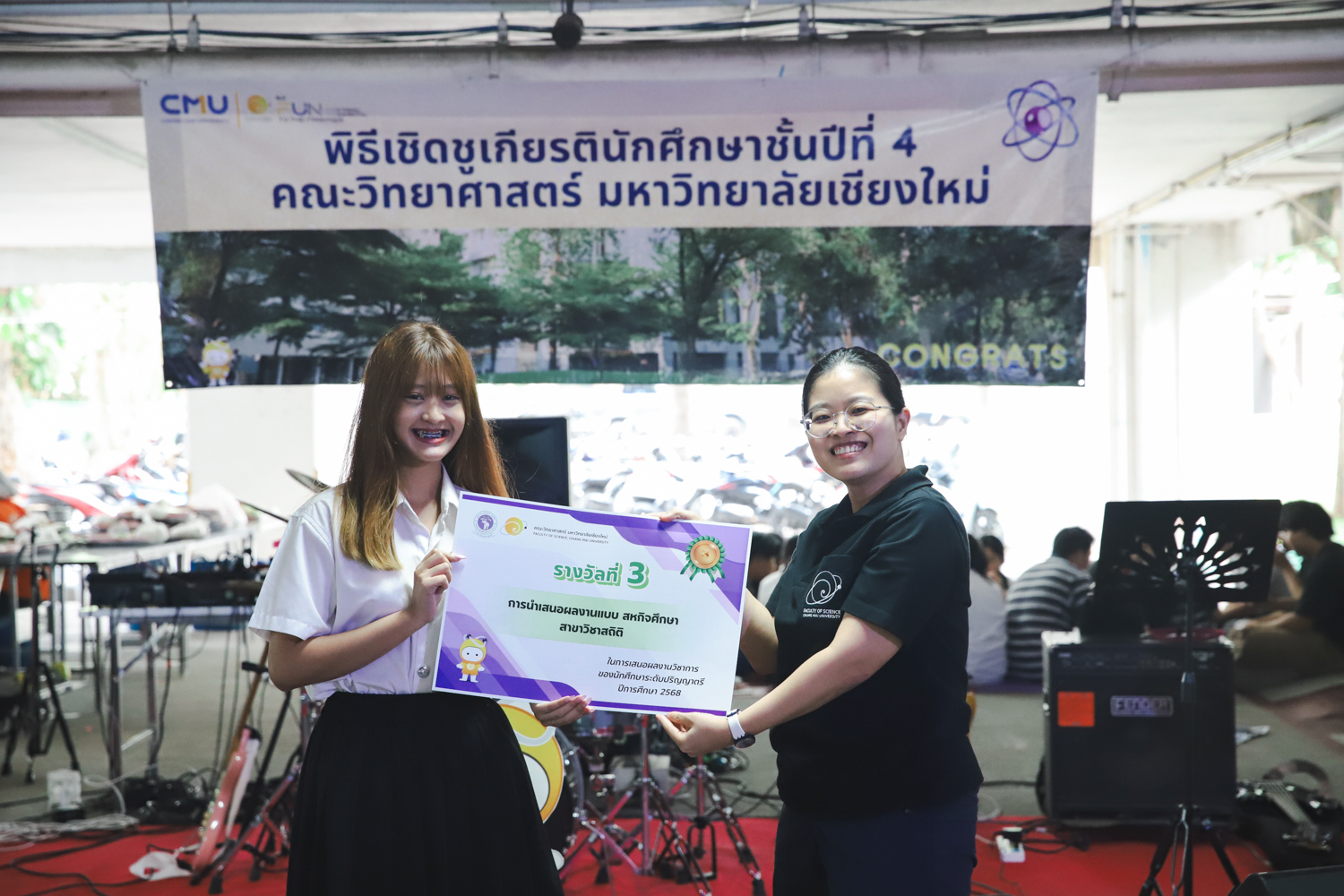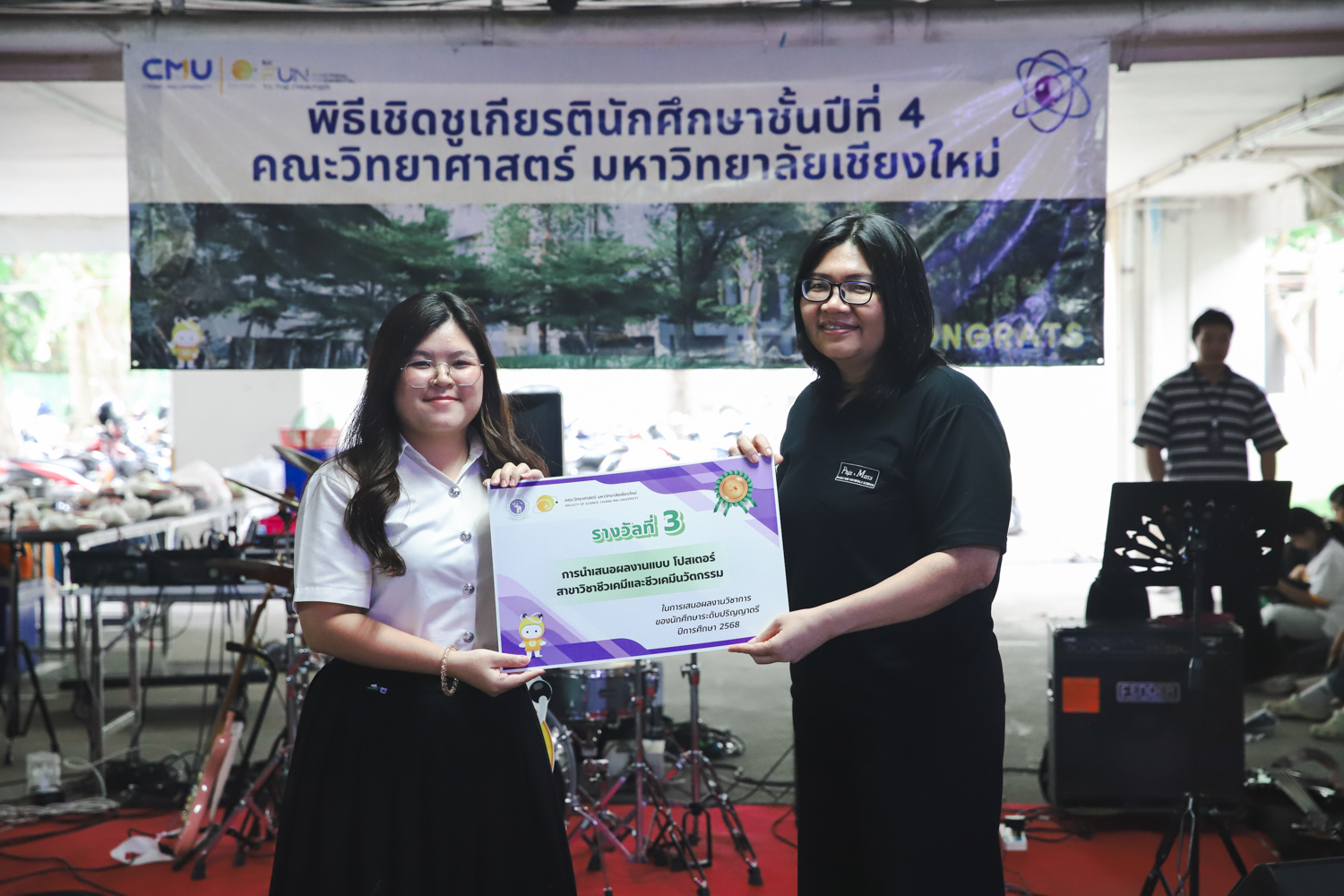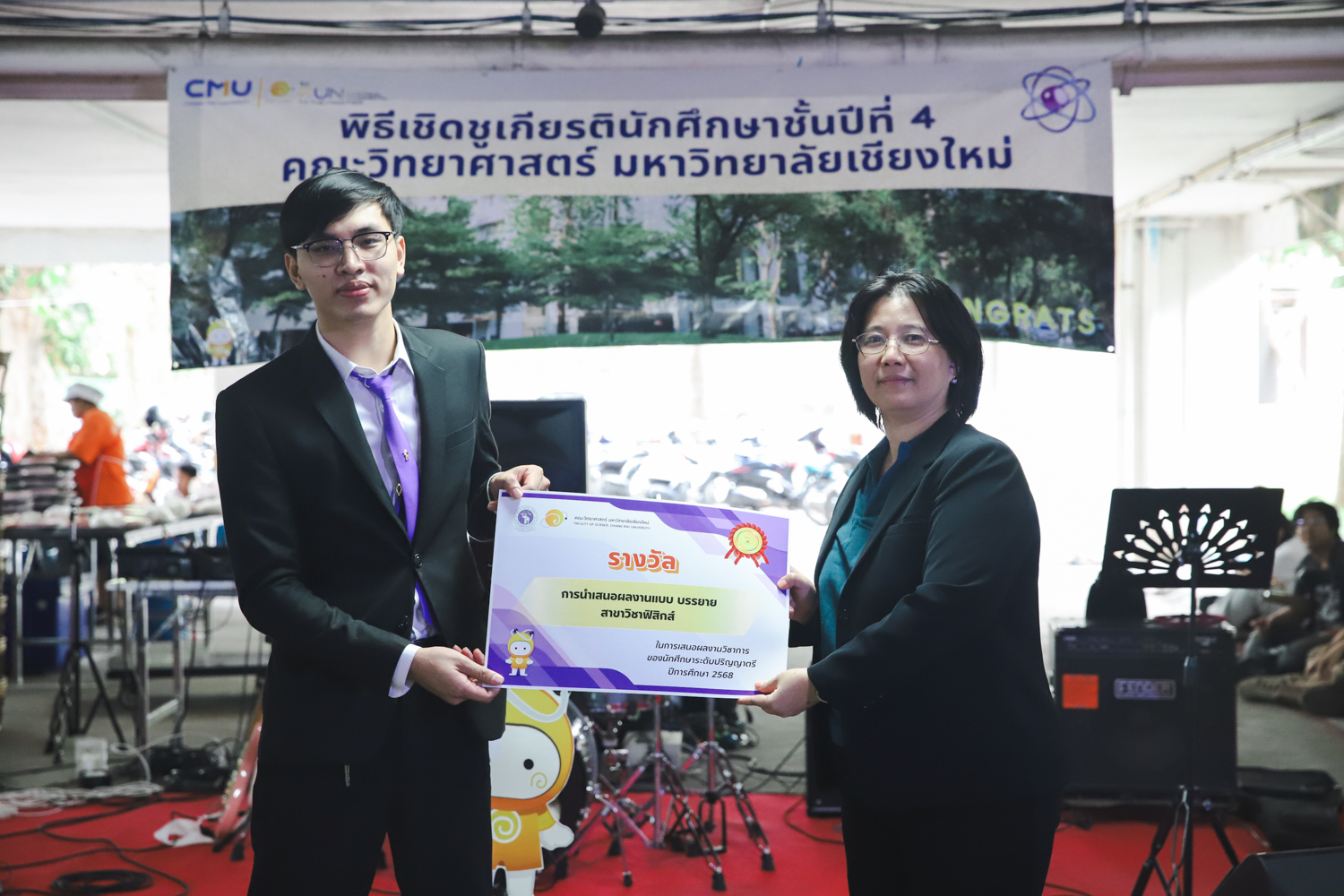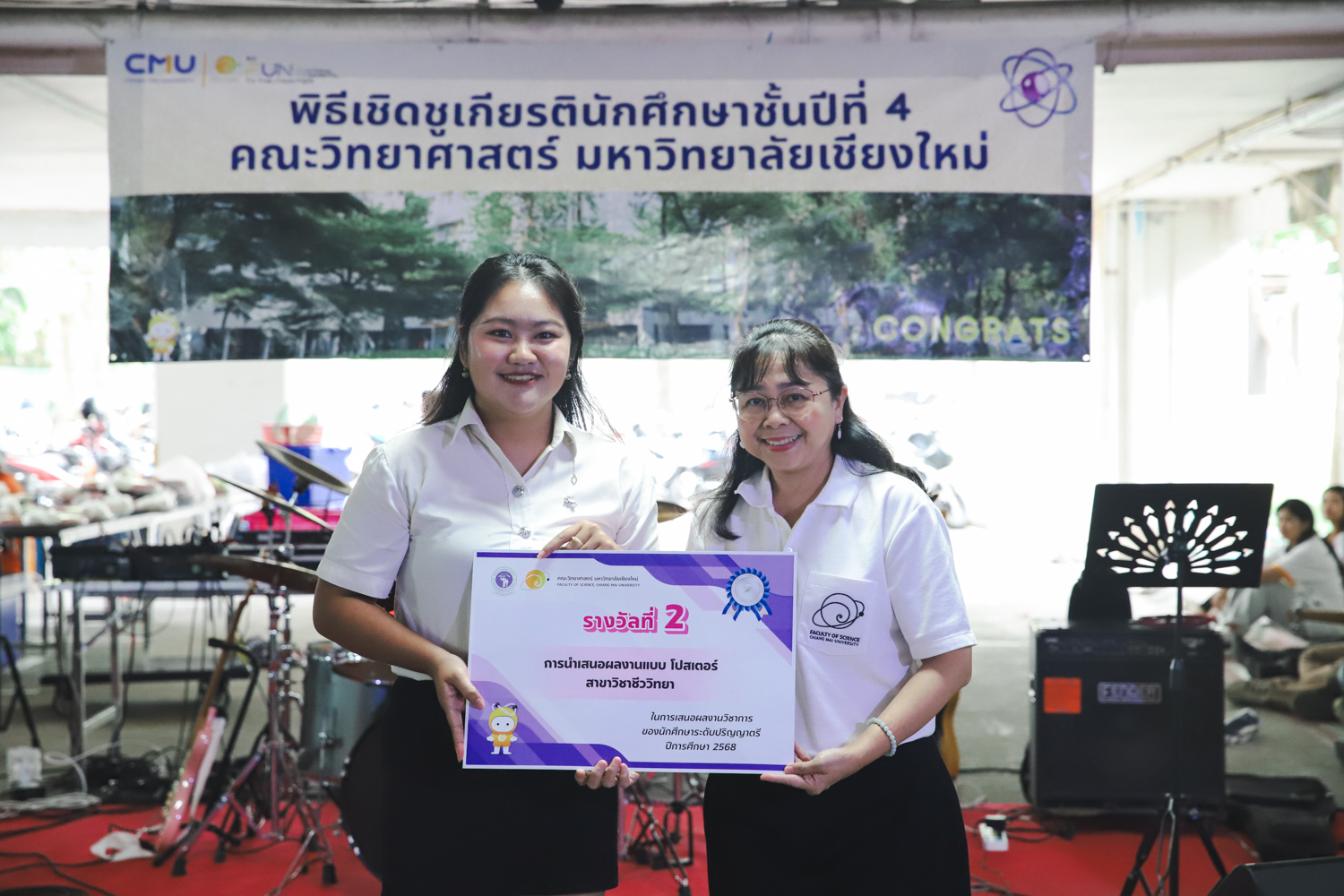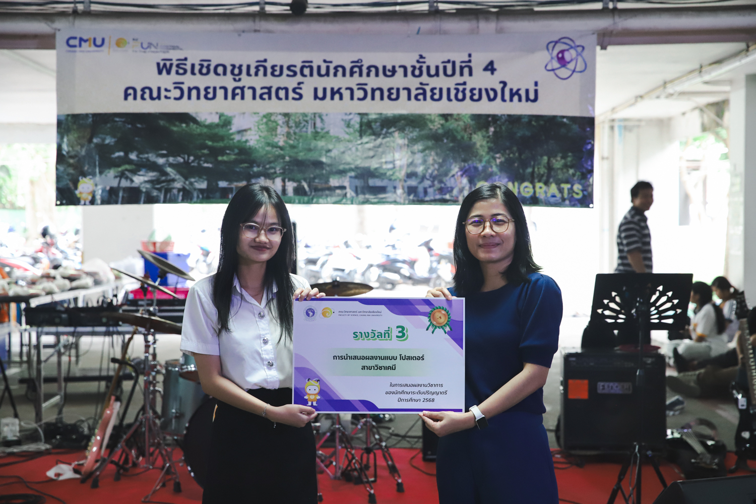 เมื่อวันที่ 11 มีนาคม 2569 ณ อาคาร 40 ปีฯ คณะวิทยาศาสตร์จัดพิธีปัจฉิมนิเทศและงานเลี้ยงแสดงความยินดีกับนักศึกษาชั้นปีที่ 4 ประจำปีการศึกษา 2568 โดยได้รับเกียรติจาก ศาสตราจารย์ ดร.ปิยะพงศ์ เนียมทรัพย์ คณบดีคณะวิทยาศาสตร์ กล่าวแสดงความยินดีและให้โอวาทแก่นักศึกษา โดยเน้นย้ำถึงการนำความรู้ทางวิทยาศาสตร์ไปสร้างคุณประโยชน์ทั้งต่อตนเองและสังคม โดยไฮไลท์สำคัญภายในงานนอกจากจะเป็นการเฉลิมฉลองความสำเร็จก้าวแรกของพี่ปี 4 แล้ว ยังมีการมอบรางวัลเพื่อเชิดชูความเก่งและความทุ่มเทของเหล่านักศึกษาในด้านต่าง ๆ เช่น เกียรติบัตรคณะกรรมการสโมสรนักศึกษา เพื่อชื่นชมผู้เสียสละทำงานเพื่อส่วนรวมตลอดปีการศึกษา รางวัล The Best Atom รางวัลสุดพิเศษที่มอบให้แก่ไอดอลต้นแบบของคณะฯ ในสาขาต่างๆ รางวัลการนำเสนอผลงานทางวิชาการ ที่การันตีคุณภาพความรู้และความเชี่ยวชาญก่อนออกสู่โลกกว้างของนักศึกษา บรรยากาศการจัดงานเต็มไปด้วยรอยยิ้มและความประทับใจ ตอกย้ำความสัมพันธ์ที่เหนียวแน่นของครอบครัววิทยา มช.