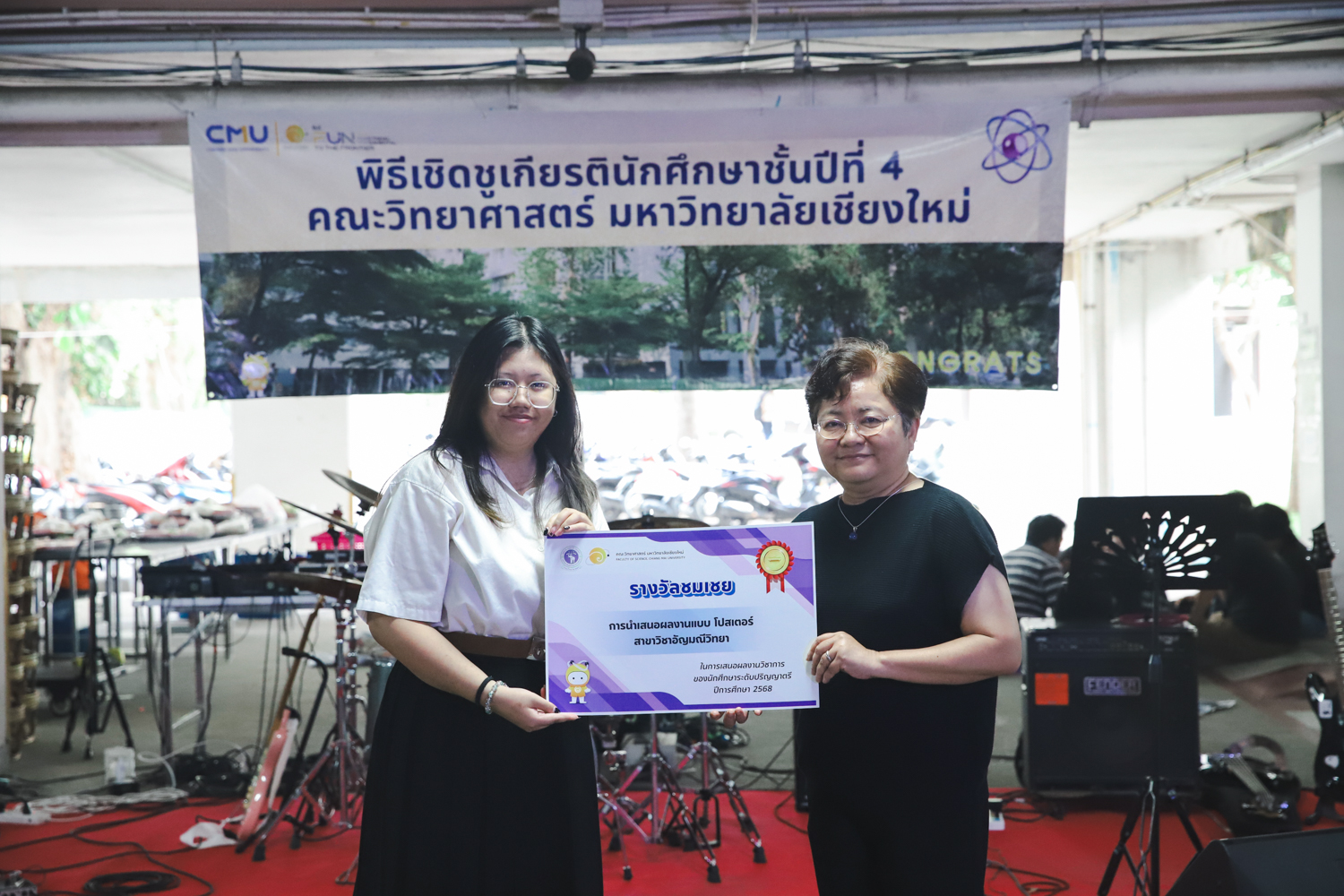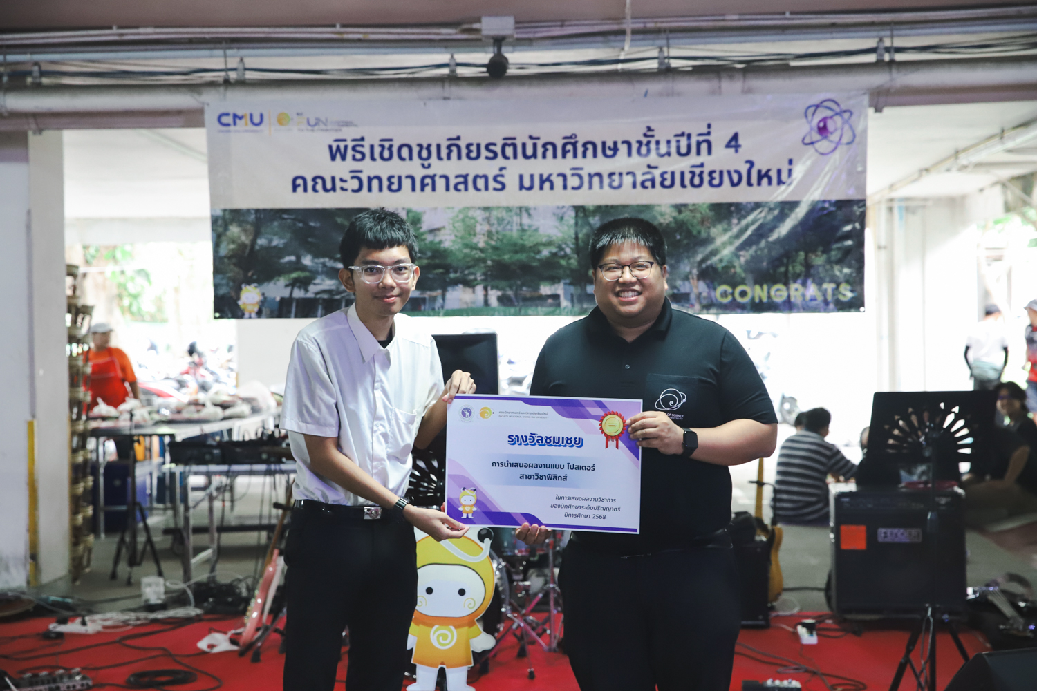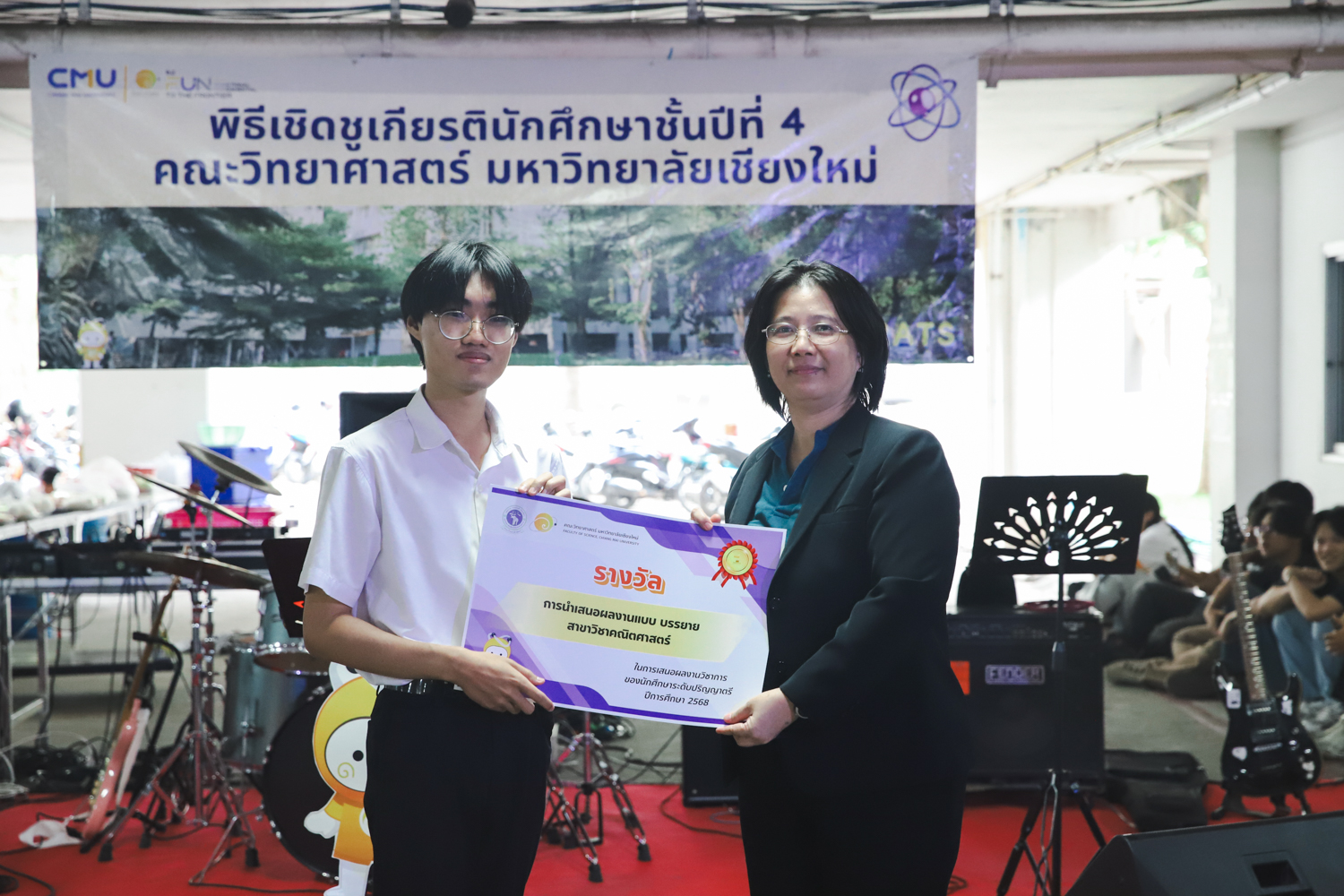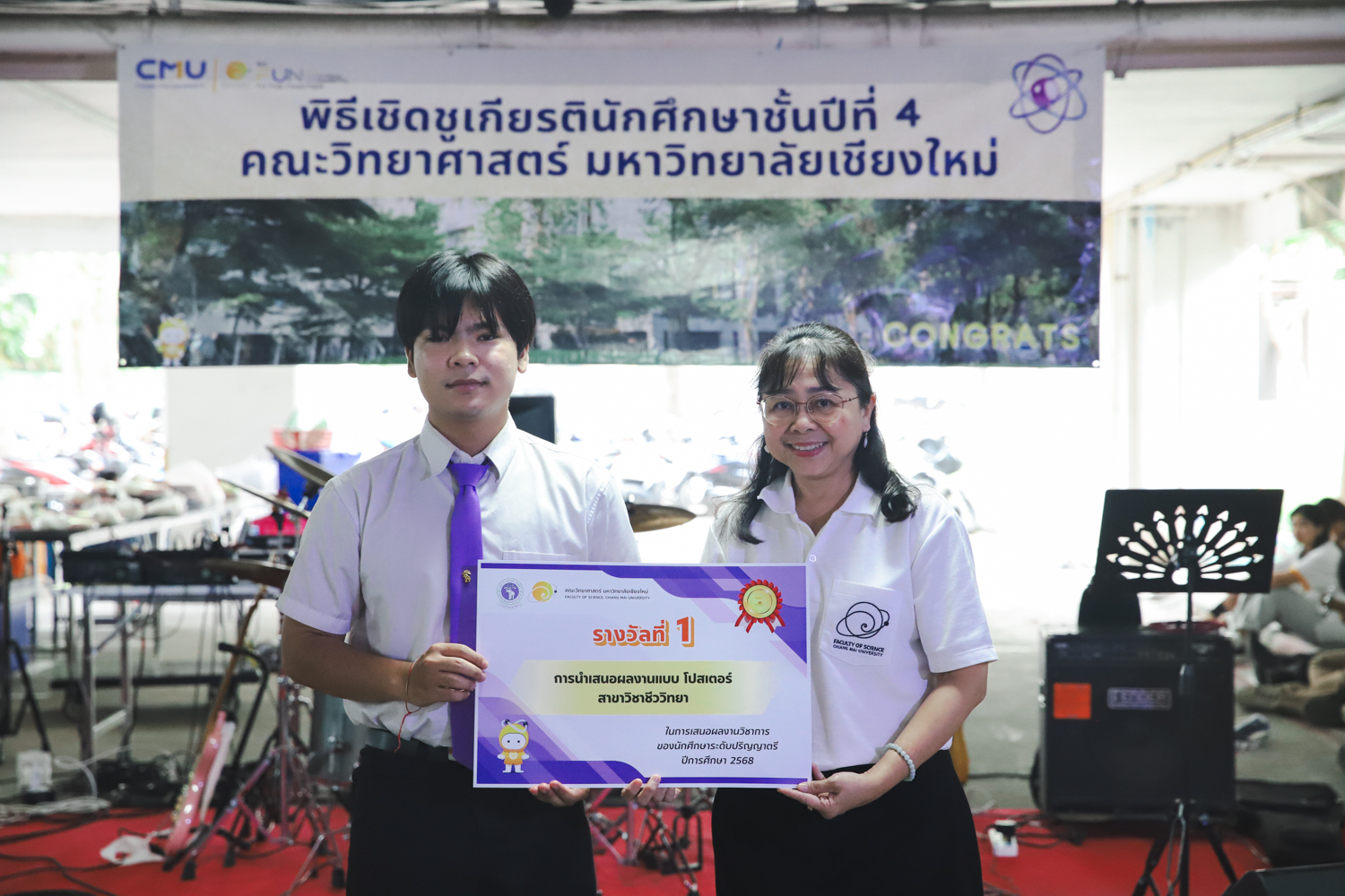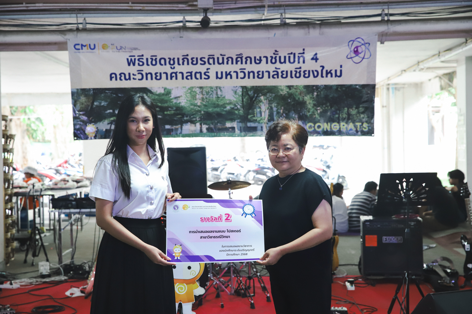 เมื่อวันที่ 11 มีนาคม 2569 ณ อาคาร 40 ปีฯ คณะวิทยาศาสตร์จัดพิธีปัจฉิมนิเทศและงานเลี้ยงแสดงความยินดีกับนักศึกษาชั้นปีที่ 4 ประจำปีการศึกษา 2568 โดยได้รับเกียรติจาก ศาสตราจารย์ ดร.ปิยะพงศ์ เนียมทรัพย์ คณบดีคณะวิทยาศาสตร์ กล่าวแสดงความยินดีและให้โอวาทแก่นักศึกษา โดยเน้นย้ำถึงการนำความรู้ทางวิทยาศาสตร์ไปสร้างคุณประโยชน์ทั้งต่อตนเองและสังคม โดยไฮไลท์สำคัญภายในงานนอกจากจะเป็นการเฉลิมฉลองความสำเร็จก้าวแรกของพี่ปี 4 แล้ว ยังมีการมอบรางวัลเพื่อเชิดชูความเก่งและความทุ่มเทของเหล่านักศึกษาในด้านต่าง ๆ เช่น เกียรติบัตรคณะกรรมการสโมสรนักศึกษา เพื่อชื่นชมผู้เสียสละทำงานเพื่อส่วนรวมตลอดปีการศึกษา รางวัล The Best Atom รางวัลสุดพิเศษที่มอบให้แก่ไอดอลต้นแบบของคณะฯ ในสาขาต่างๆ รางวัลการนำเสนอผลงานทางวิชาการ ที่การันตีคุณภาพความรู้และความเชี่ยวชาญก่อนออกสู่โลกกว้างของนักศึกษา บรรยากาศการจัดงานเต็มไปด้วยรอยยิ้มและความประทับใจ ตอกย้ำความสัมพันธ์ที่เหนียวแน่นของครอบครัววิทยา มช.