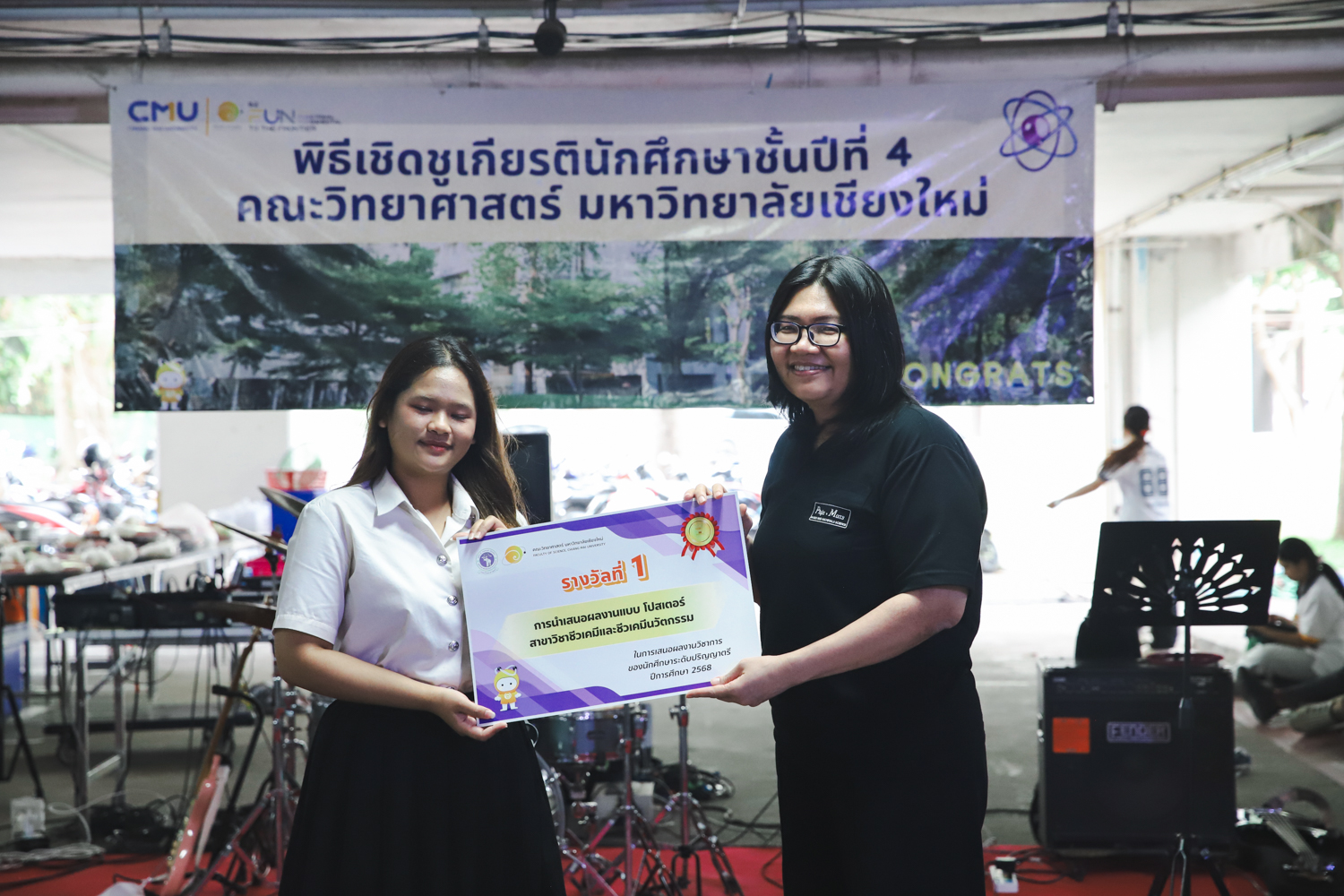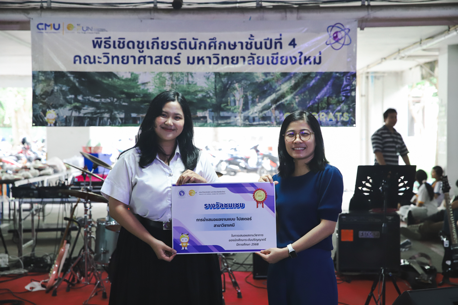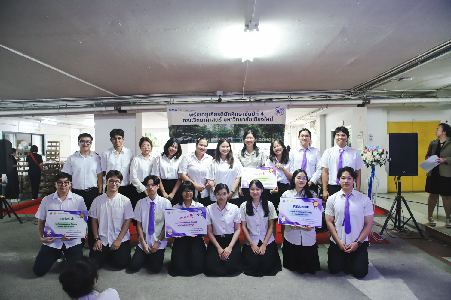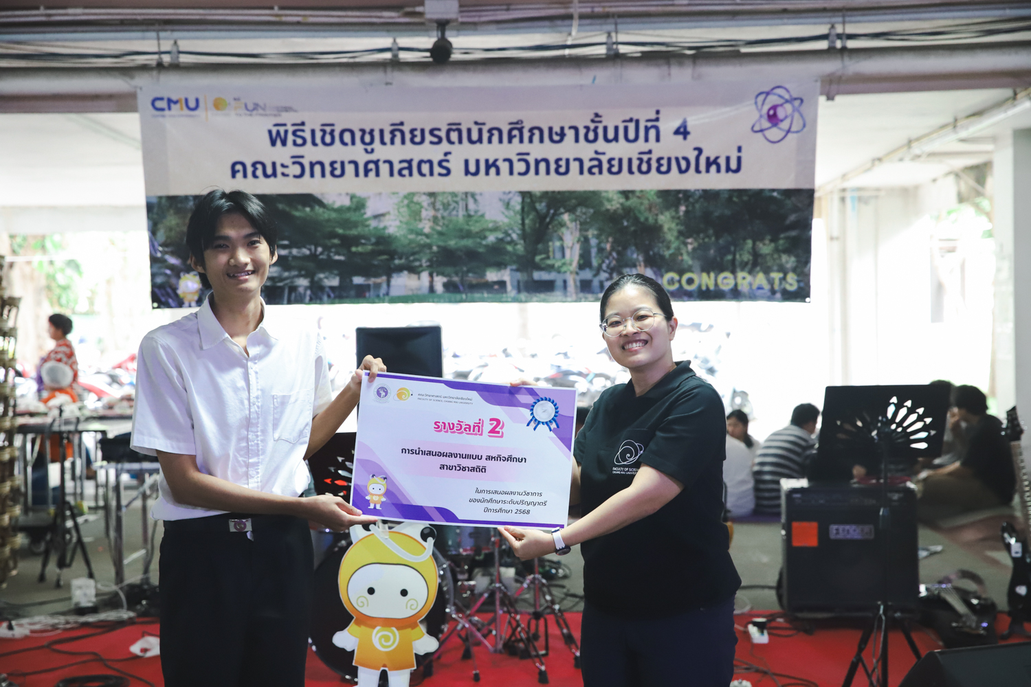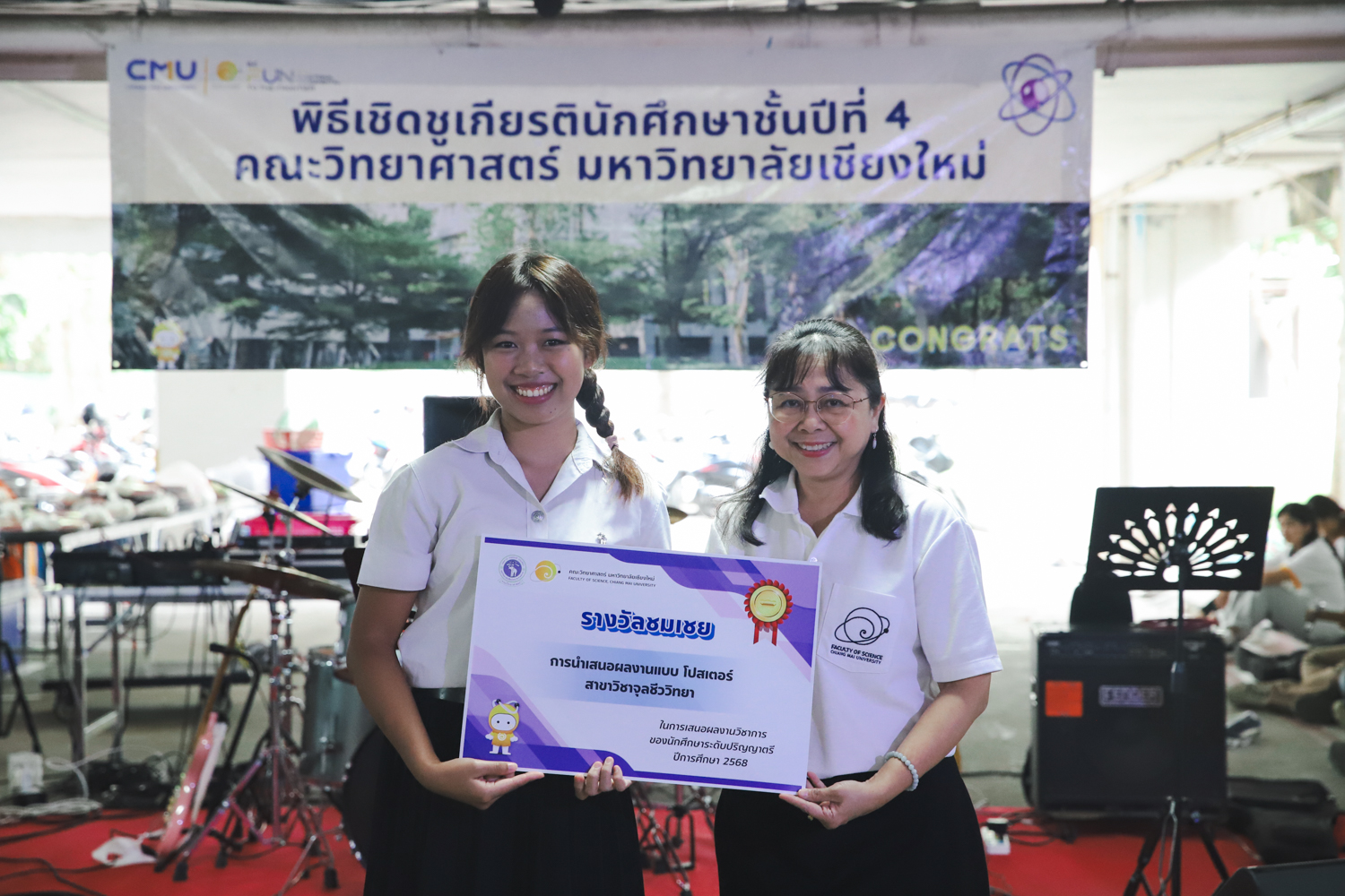 เมื่อวันที่ 11 มีนาคม 2569 ณ อาคาร 40 ปีฯ คณะวิทยาศาสตร์จัดพิธีปัจฉิมนิเทศและงานเลี้ยงแสดงความยินดีกับนักศึกษาชั้นปีที่ 4 ประจำปีการศึกษา 2568 โดยได้รับเกียรติจาก ศาสตราจารย์ ดร.ปิยะพงศ์ เนียมทรัพย์ คณบดีคณะวิทยาศาสตร์ กล่าวแสดงความยินดีและให้โอวาทแก่นักศึกษา โดยเน้นย้ำถึงการนำความรู้ทางวิทยาศาสตร์ไปสร้างคุณประโยชน์ทั้งต่อตนเองและสังคม โดยไฮไลท์สำคัญภายในงานนอกจากจะเป็นการเฉลิมฉลองความสำเร็จก้าวแรกของพี่ปี 4 แล้ว ยังมีการมอบรางวัลเพื่อเชิดชูความเก่งและความทุ่มเทของเหล่านักศึกษาในด้านต่าง ๆ เช่น เกียรติบัตรคณะกรรมการสโมสรนักศึกษา เพื่อชื่นชมผู้เสียสละทำงานเพื่อส่วนรวมตลอดปีการศึกษา รางวัล The Best Atom รางวัลสุดพิเศษที่มอบให้แก่ไอดอลต้นแบบของคณะฯ ในสาขาต่างๆ รางวัลการนำเสนอผลงานทางวิชาการ ที่การันตีคุณภาพความรู้และความเชี่ยวชาญก่อนออกสู่โลกกว้างของนักศึกษา บรรยากาศการจัดงานเต็มไปด้วยรอยยิ้มและความประทับใจ ตอกย้ำความสัมพันธ์ที่เหนียวแน่นของครอบครัววิทยา มช.