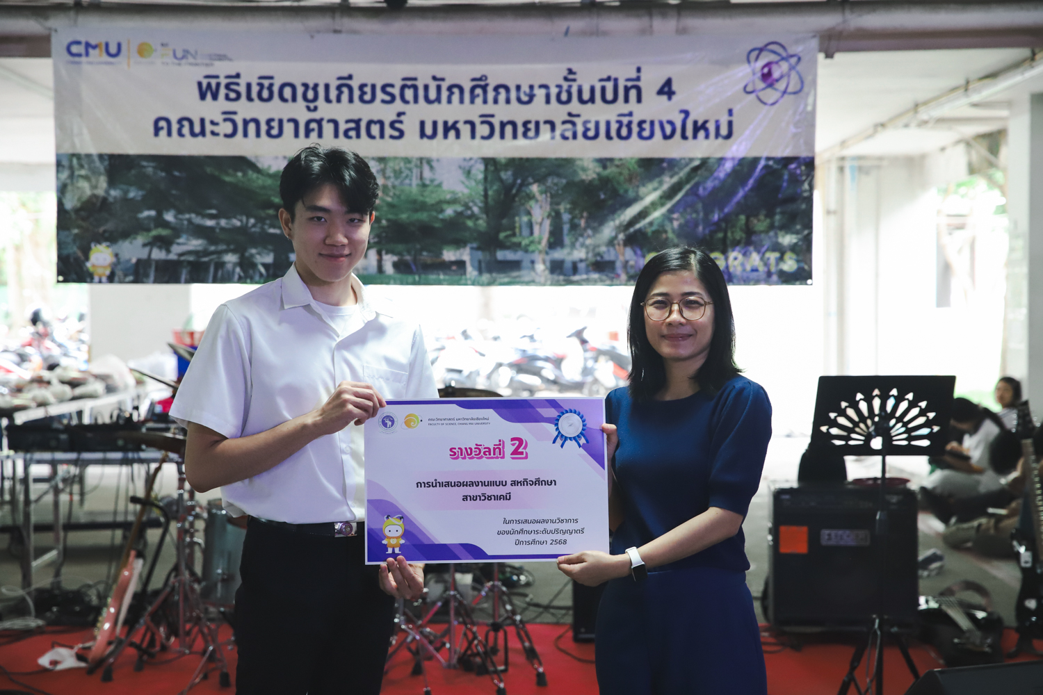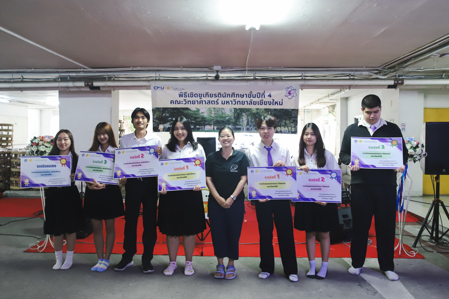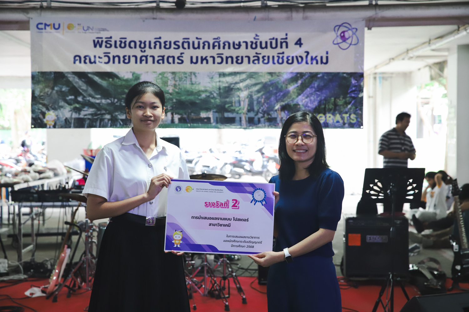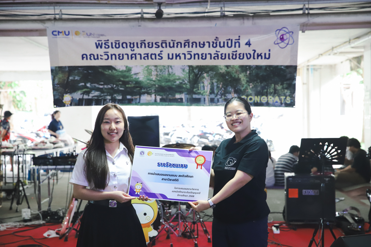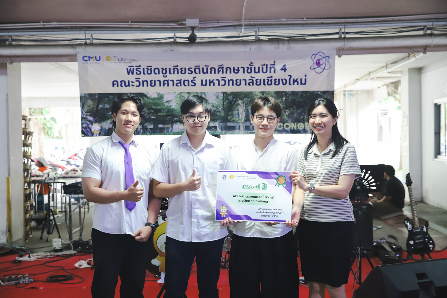 เมื่อวันที่ 11 มีนาคม 2569 ณ อาคาร 40 ปีฯ คณะวิทยาศาสตร์จัดพิธีปัจฉิมนิเทศและงานเลี้ยงแสดงความยินดีกับนักศึกษาชั้นปีที่ 4 ประจำปีการศึกษา 2568 โดยได้รับเกียรติจาก ศาสตราจารย์ ดร.ปิยะพงศ์ เนียมทรัพย์ คณบดีคณะวิทยาศาสตร์ กล่าวแสดงความยินดีและให้โอวาทแก่นักศึกษา โดยเน้นย้ำถึงการนำความรู้ทางวิทยาศาสตร์ไปสร้างคุณประโยชน์ทั้งต่อตนเองและสังคม โดยไฮไลท์สำคัญภายในงานนอกจากจะเป็นการเฉลิมฉลองความสำเร็จก้าวแรกของพี่ปี 4 แล้ว ยังมีการมอบรางวัลเพื่อเชิดชูความเก่งและความทุ่มเทของเหล่านักศึกษาในด้านต่าง ๆ เช่น เกียรติบัตรคณะกรรมการสโมสรนักศึกษา เพื่อชื่นชมผู้เสียสละทำงานเพื่อส่วนรวมตลอดปีการศึกษา รางวัล The Best Atom รางวัลสุดพิเศษที่มอบให้แก่ไอดอลต้นแบบของคณะฯ ในสาขาต่างๆ รางวัลการนำเสนอผลงานทางวิชาการ ที่การันตีคุณภาพความรู้และความเชี่ยวชาญก่อนออกสู่โลกกว้างของนักศึกษา บรรยากาศการจัดงานเต็มไปด้วยรอยยิ้มและความประทับใจ ตอกย้ำความสัมพันธ์ที่เหนียวแน่นของครอบครัววิทยา มช.