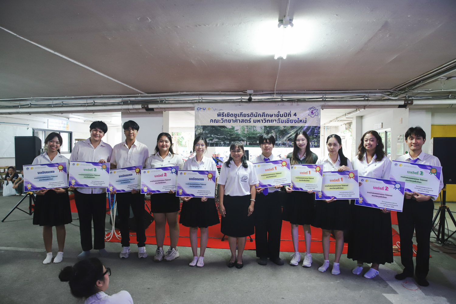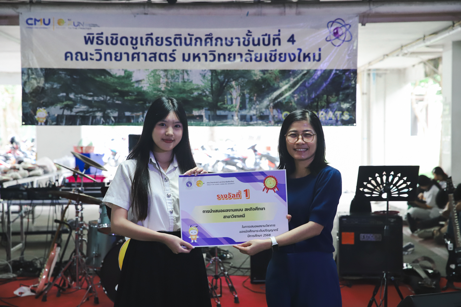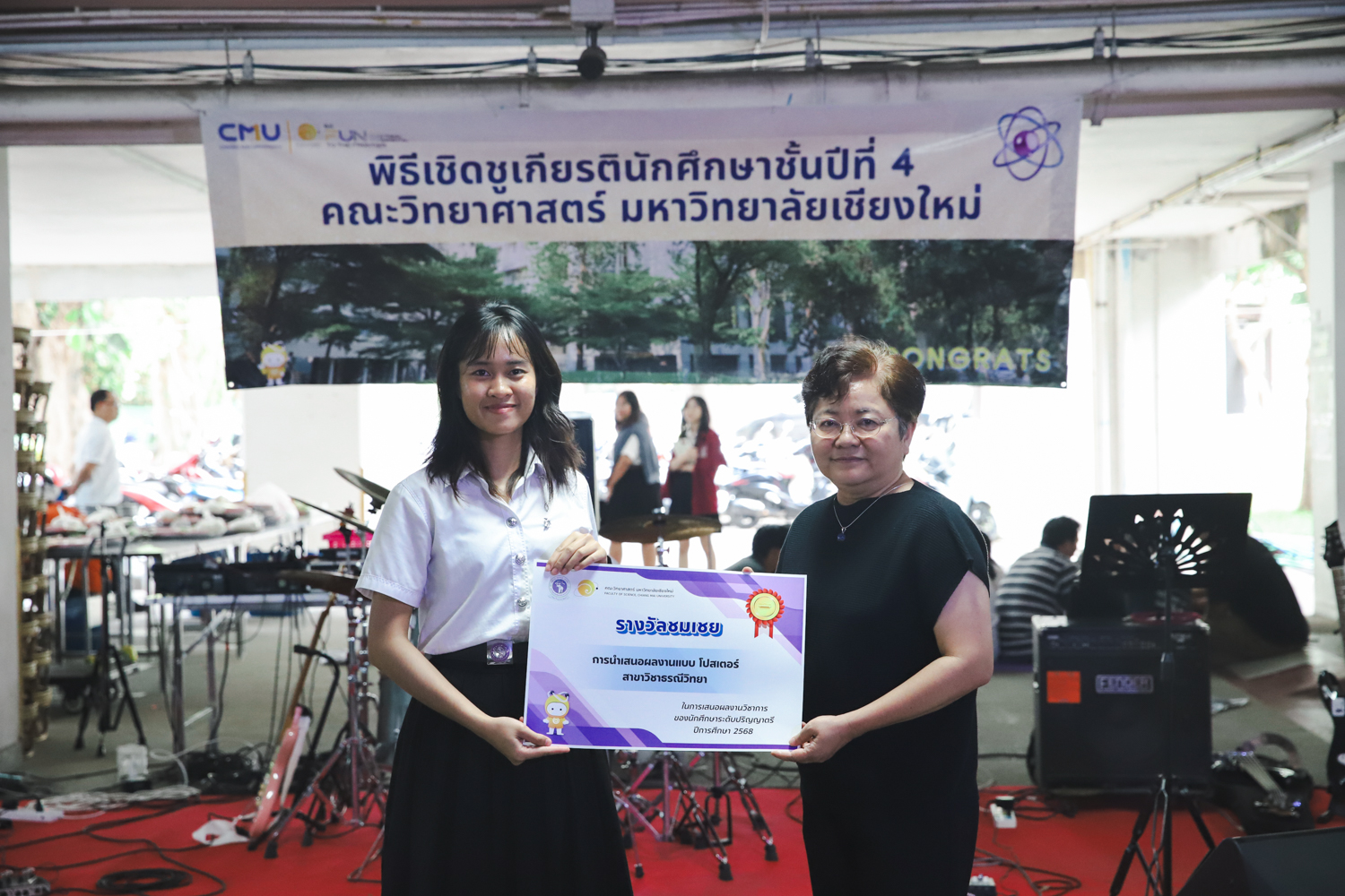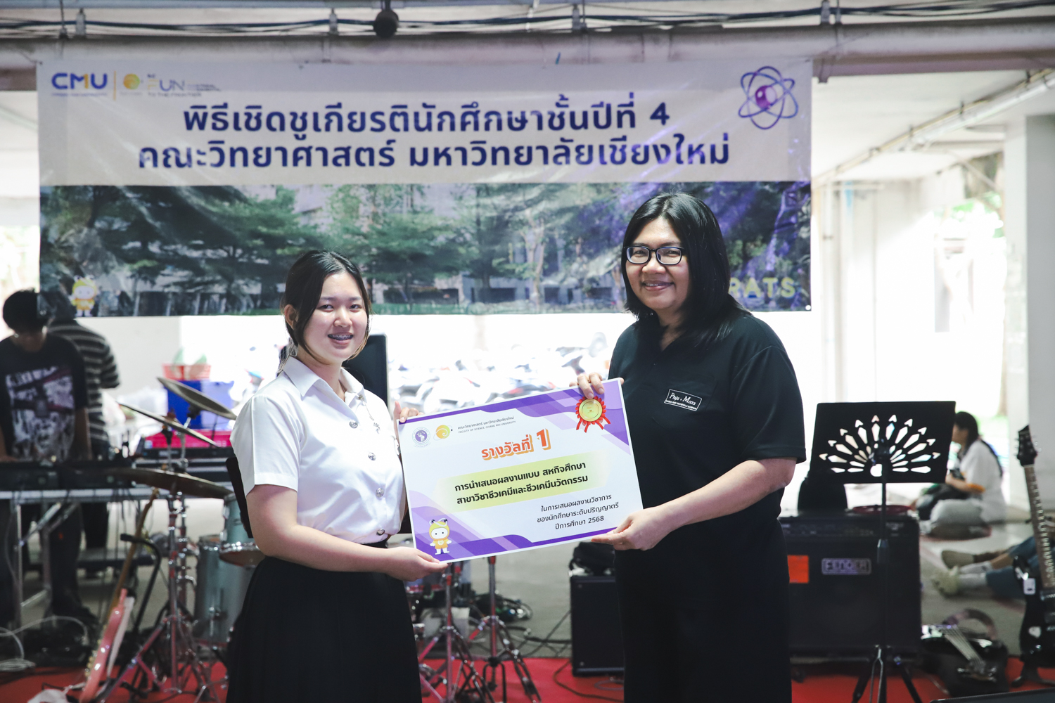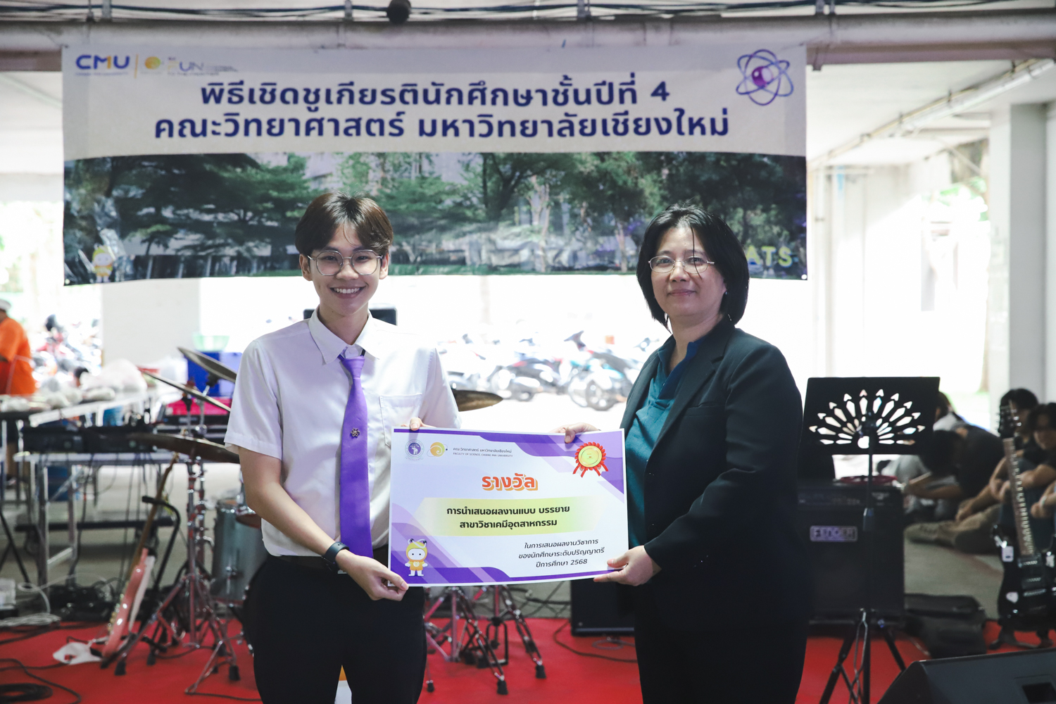 เมื่อวันที่ 11 มีนาคม 2569 ณ อาคาร 40 ปีฯ คณะวิทยาศาสตร์จัดพิธีปัจฉิมนิเทศและงานเลี้ยงแสดงความยินดีกับนักศึกษาชั้นปีที่ 4 ประจำปีการศึกษา 2568 โดยได้รับเกียรติจาก ศาสตราจารย์ ดร.ปิยะพงศ์ เนียมทรัพย์ คณบดีคณะวิทยาศาสตร์ กล่าวแสดงความยินดีและให้โอวาทแก่นักศึกษา โดยเน้นย้ำถึงการนำความรู้ทางวิทยาศาสตร์ไปสร้างคุณประโยชน์ทั้งต่อตนเองและสังคม โดยไฮไลท์สำคัญภายในงานนอกจากจะเป็นการเฉลิมฉลองความสำเร็จก้าวแรกของพี่ปี 4 แล้ว ยังมีการมอบรางวัลเพื่อเชิดชูความเก่งและความทุ่มเทของเหล่านักศึกษาในด้านต่าง ๆ เช่น เกียรติบัตรคณะกรรมการสโมสรนักศึกษา เพื่อชื่นชมผู้เสียสละทำงานเพื่อส่วนรวมตลอดปีการศึกษา รางวัล The Best Atom รางวัลสุดพิเศษที่มอบให้แก่ไอดอลต้นแบบของคณะฯ ในสาขาต่างๆ รางวัลการนำเสนอผลงานทางวิชาการ ที่การันตีคุณภาพความรู้และความเชี่ยวชาญก่อนออกสู่โลกกว้างของนักศึกษา บรรยากาศการจัดงานเต็มไปด้วยรอยยิ้มและความประทับใจ ตอกย้ำความสัมพันธ์ที่เหนียวแน่นของครอบครัววิทยา มช.