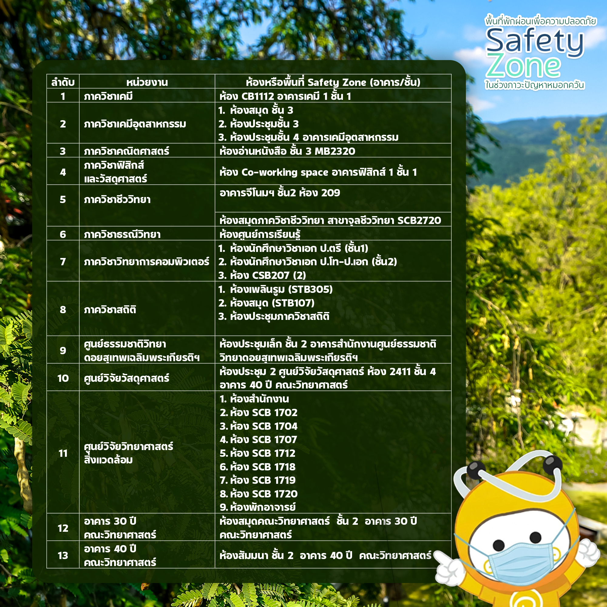 คณะวิทยาศาสตร์ มหาวิทยาลัยเชียงใหม่ ตระหนักถึงความสำคัญของสุขภาพและพลานามัยของบุคลากรและนักศึกษา ภายใต้สถานการณ์วิกฤตฝุ่นละอองขนาดเล็ก (PM2.5) ที่พุ่งสูงขึ้นในพื้นที่จังหวัดเชียงใหม่ ซึ่งส่งผลกระทบโดยตรงต่อระบบทางเดินหายใจและสุขภาพในระยะยาว เพื่อเป็นการเฝ้าระวังและบรรเทาผลกระทบดังกล่าว คณะวิทยาศาสตร์จึงได้ประกาศ “พื้นที่ปลอดภัย (Safety Zone)” ภายในอาคารของหน่วยงานและภาควิชาต่างๆ ทั่วทั้งคณะ ประจำปี พ.ศ. 2569 สำหรับให้บุคลากรและนักศึกษาได้เข้าใช้บริการ พักผ่อน หรือปฏิบัติงาน