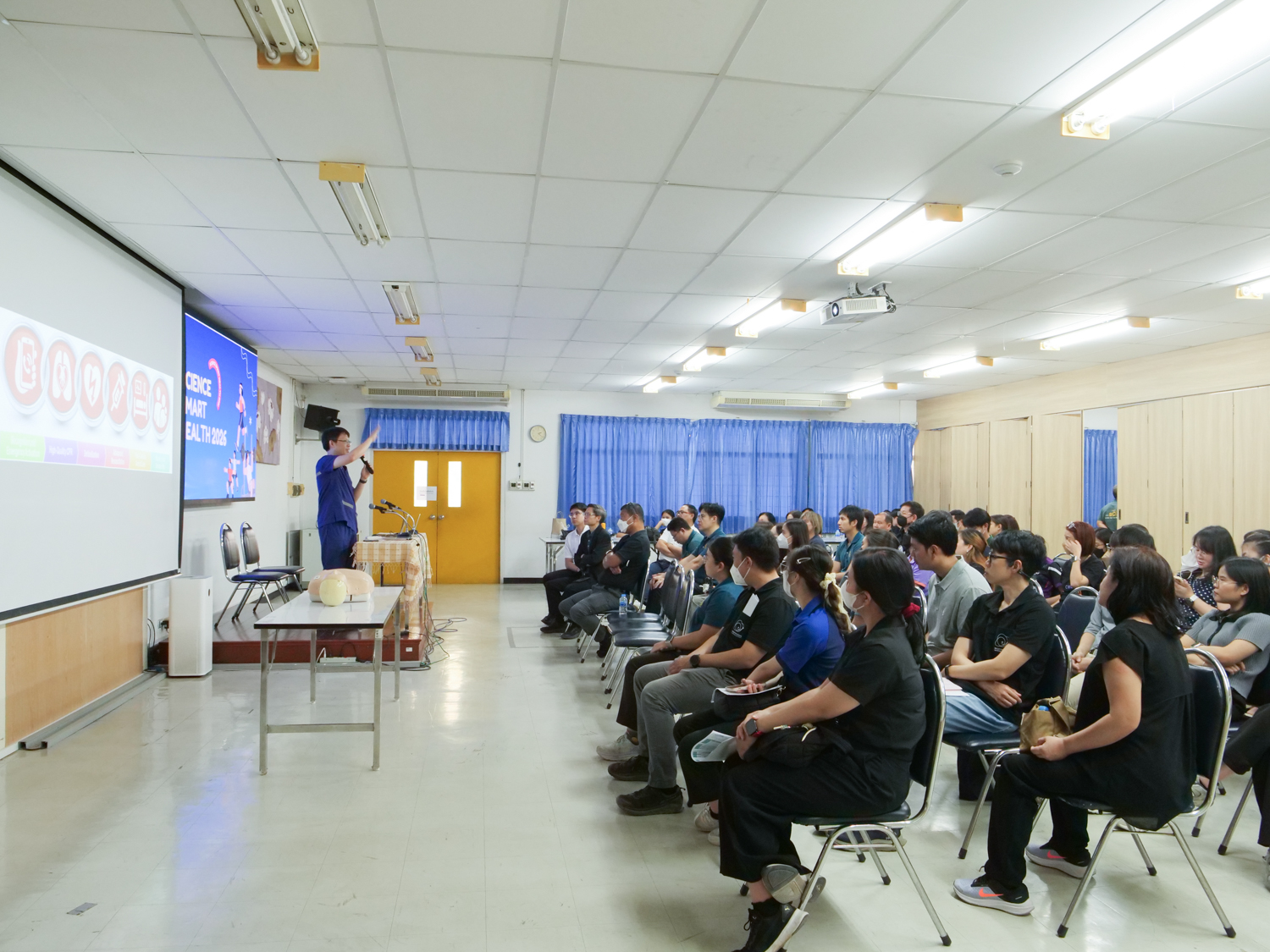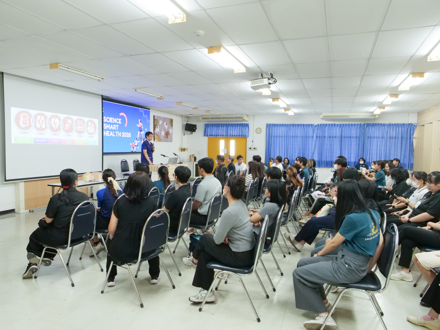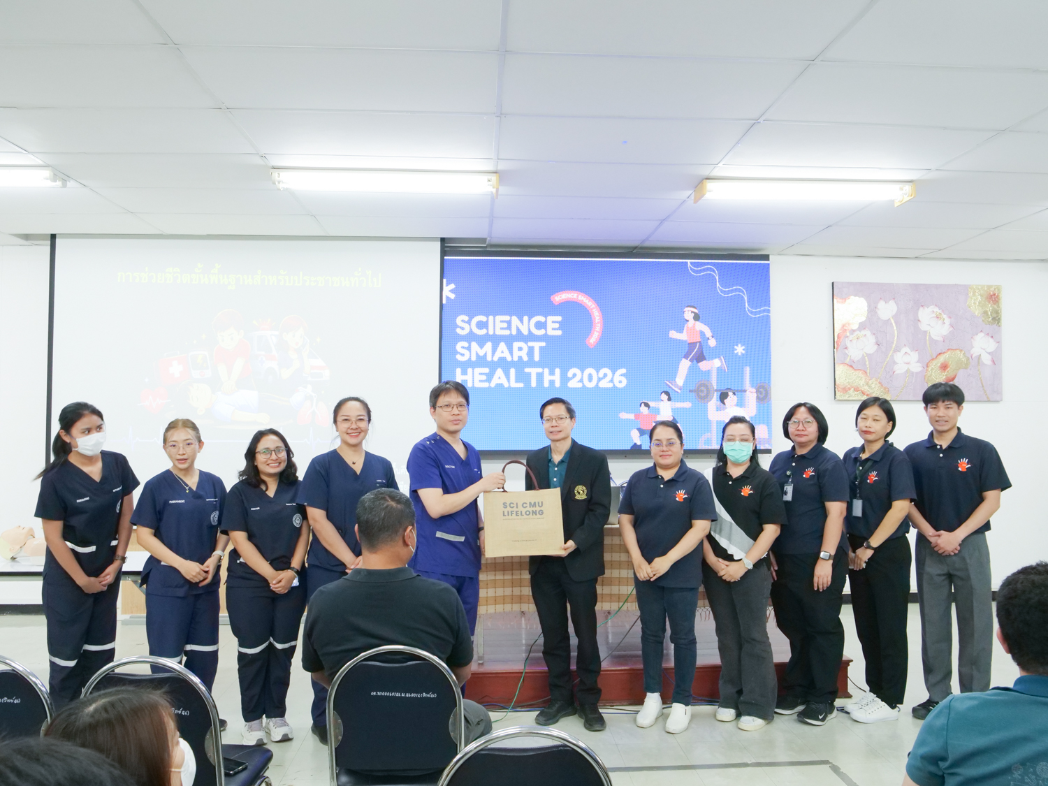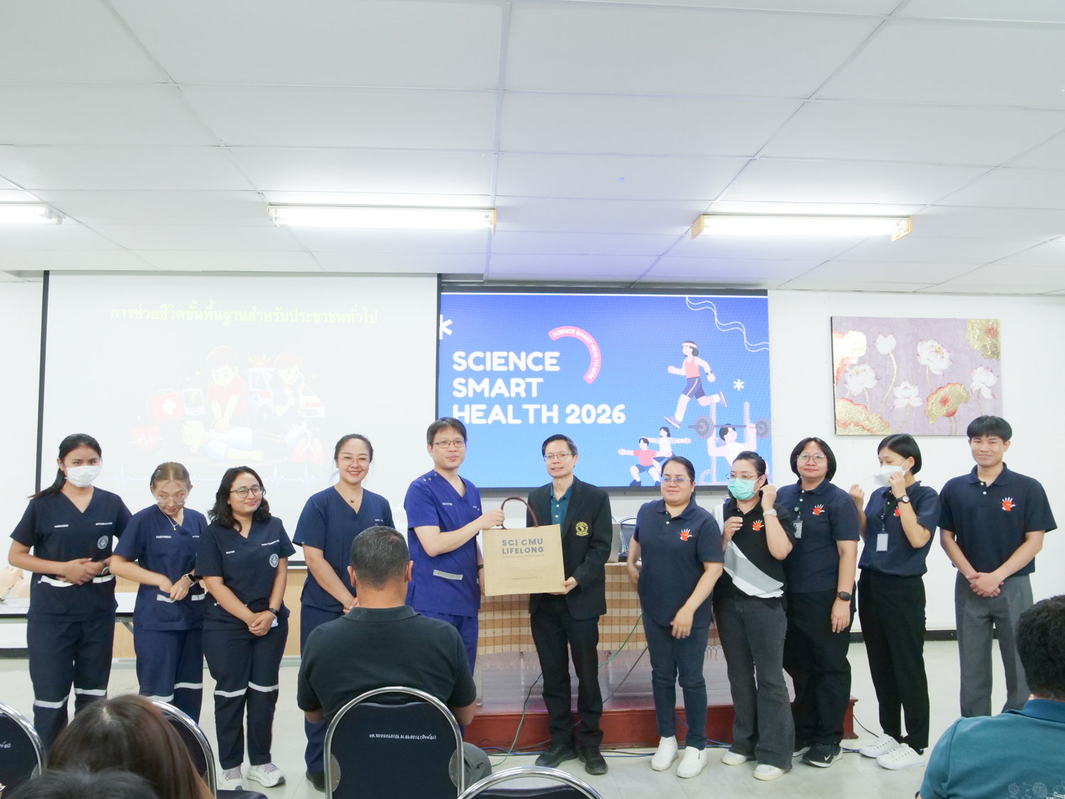ไฮไลท์สำคัญของโครงการคือการฝึกอบรมเชิงปฏิบัติการด้านการช่วยชีวิตขั้นพื้นฐาน เพื่อให้บุคลากรมีความรู้และทักษะที่นำไปใช้ได้จริงในสถานการณ์ฉุกเฉิน โดยได้รับเกียรติจากวิทยากรผู้เชี่ยวชาญ บรรยายในหัวข้อ การช่วยชีวิตขั้นพื้นฐานและการช่วยฟื้นคืนชีพเบื้องต้น (BLS/CPR) โดย ผศ.นพ.ปริญญา เทียนวิบูลย์ จากภาควิชาเวชศาสตร์ฉุกเฉิน คณะแพทยศาสตร์ มช. ตลอดจนการฝึกปฏิบัติการใช้เครื่องกระตุกหัวใจไฟฟ้าอัตโนมัติ (AED) การช่วยเหลือกรณีสิ่งแปลกปลอมอุดกั้นทางเดินหายใจ และการแข่งขันช่วยฟื้นคืนชีพ นอกจากนี้ ในงานยังมีการนำเสนอโครงการ "Science Smart Health 2026" ซึ่งเป็นแนวทางต่อเนื่องในการดูแลสุขภาพบุคลากรคณะวิทยาศาสตร์ ให้มีความพร้อมทั้งกายและใจในการปฏิบัติงานต่อไป