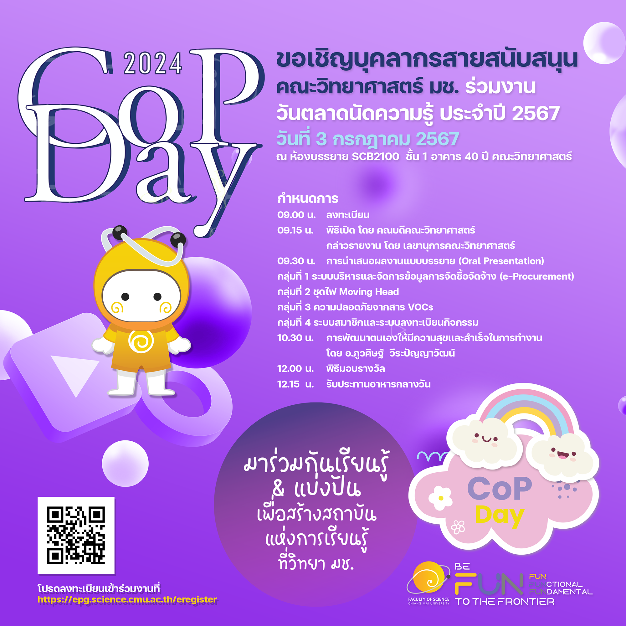 ขอเชิญบุคลากรสายสนับสนุน คณะวิทยาศาสตร์ มช. ร่วมโครงการ พัฒนากลุ่ม CoP คณะวิทยาศาสตร์ เพื่อนำไปสู่สถาบันการเรียนรู้ ประจำปี 2567