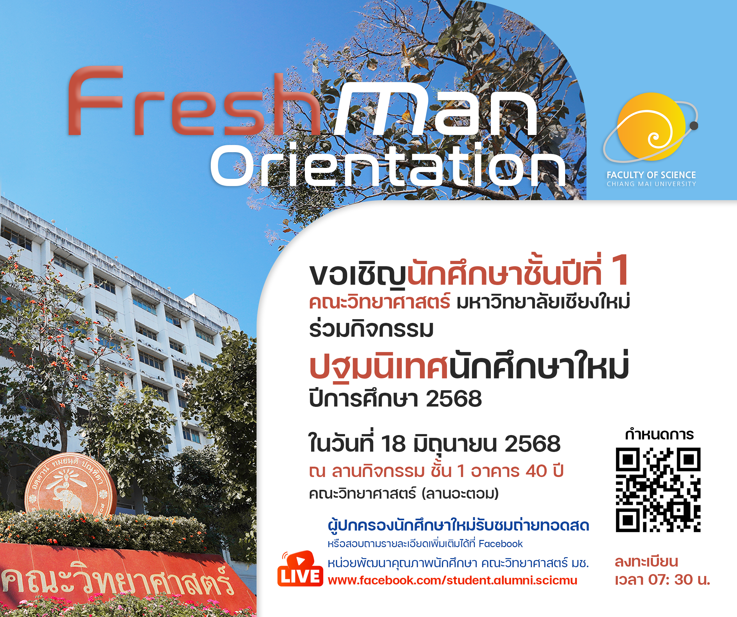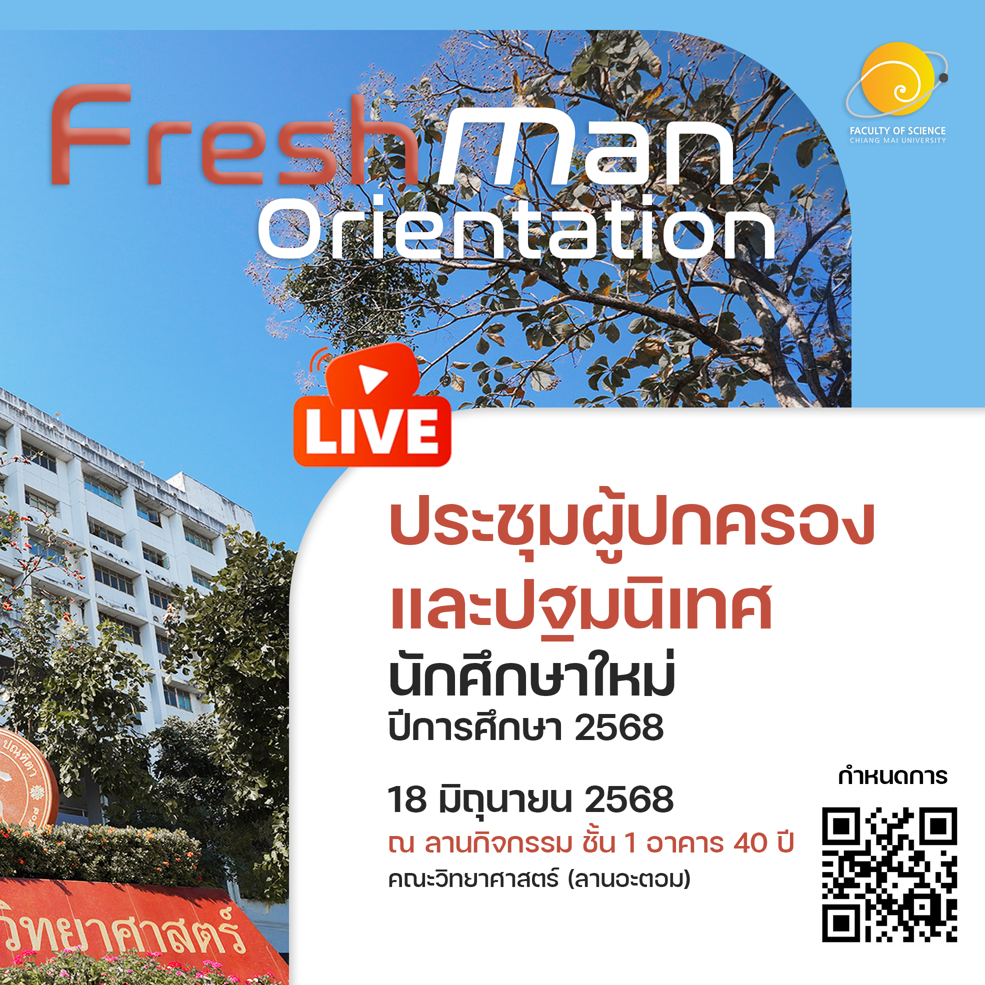 ขอเชิญนักศึกษาใหม่ คณะวิทยาศาสตร์ มหาวิทยาลัยเชียงใหม่ และผู้ปกกครอง เข้าร่วมกิจกรรมปฐมนิเทศนักศึกษาใหม่คณะวิทยาศาสตร์ ปีการศึกษา 2568