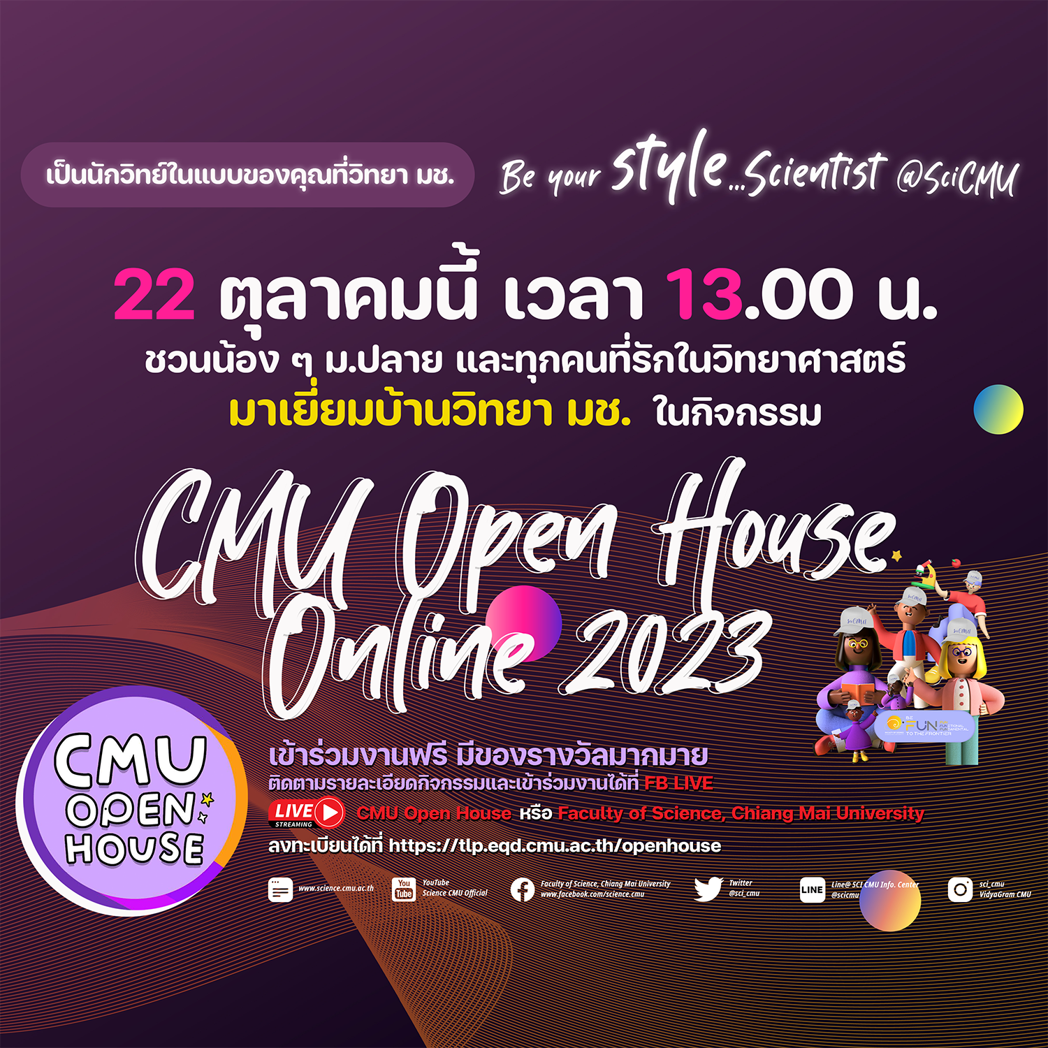 22 ตุลาคมนี้ เวลา 13.00 น. ชวนน้อง ๆ ม.ปลาย และทุกคนที่รักในวิทยาศาสตร์ มาเยี่ยมบ้านวิทยา มช. ในกิจกรรม CMU Open House Online 2023