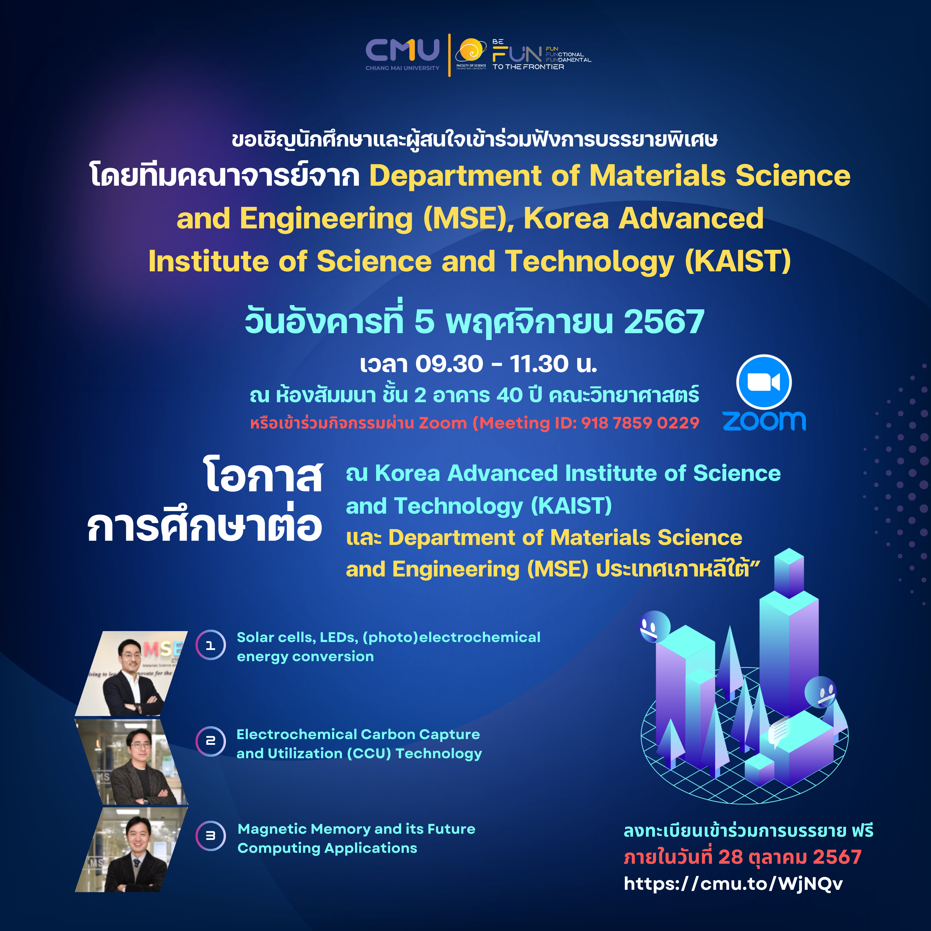 ขอเชิญนักศึกษาและผู้สนใจเข้าร่วมฟังการบรรยายพิเศษ โดยทีมคณาจารย์จาก Department of Materials Science and Engineering (MSE), Korea Advanced Institute of Science and Technology (KAIST)