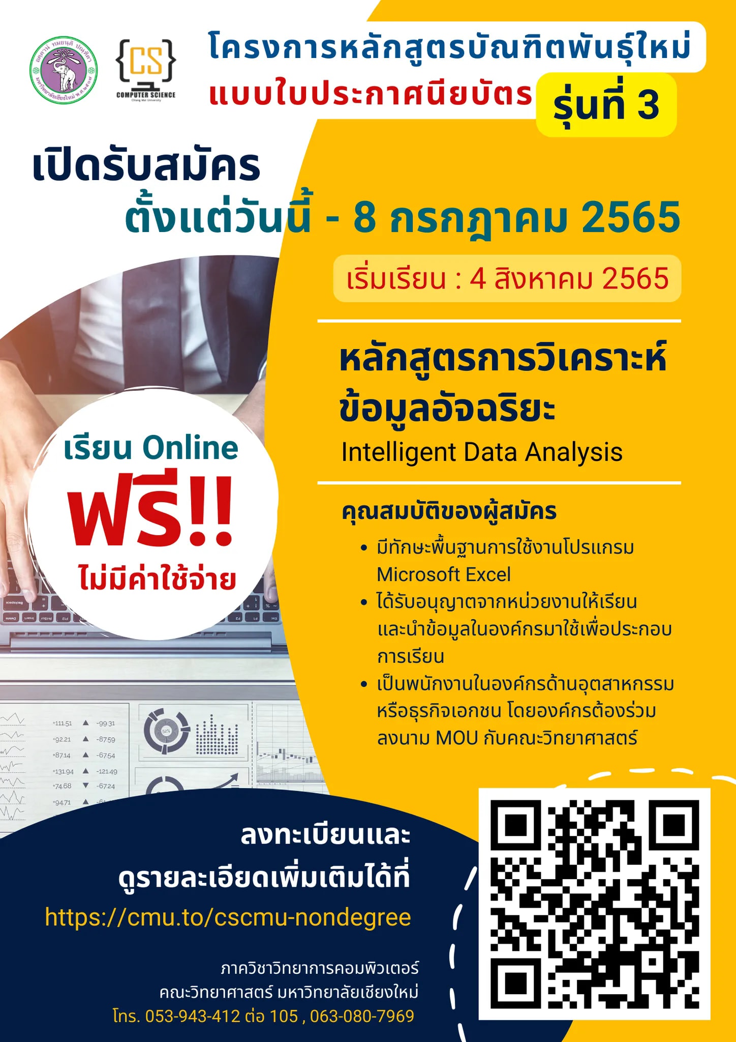 ภาควิชาวิทยาการคอมพิวเตอร์ รับสมัครผู้สนใจเข้าร่วมอบรมหลักสูตร Intelligent data analysis หลักสูตรการวิเคราะห์ข้อมูลอัจฉริยะ สมัครด่วนก่อนหมดเขต