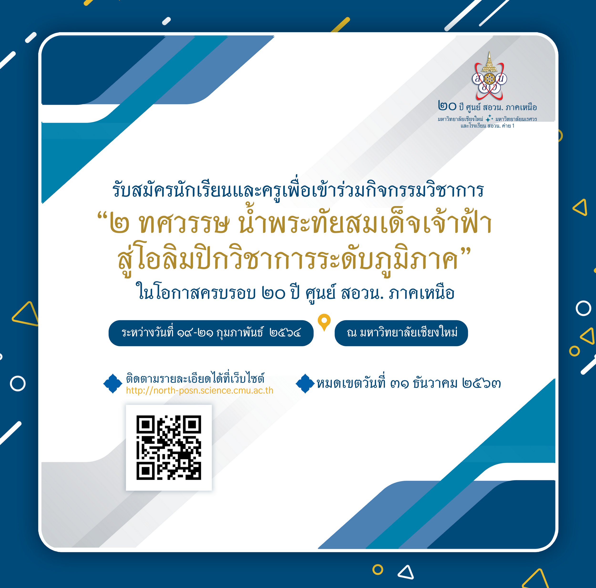 รับสมัครนักเรียนและครูเพื่อเข้าร่วมกิจกรรมวิชาการ ๒ ทศวรรษ น้ำพระทัยสมเด็จเจ้าฟ้า สู่โอลิมปิกวิชาการระดับภูมิภาค ในโอกาสครบรอบ ๒๐ ปี ศูนย์ สอวน. ภาคเหนือ