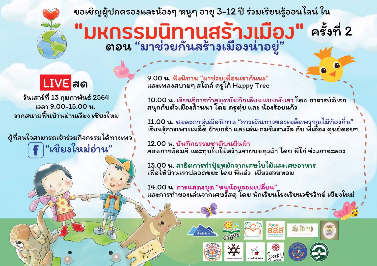 ขอเชิญผู้ปกครองและน้องๆ หนูๆ อายุ 3-12 ปี ร่วมเรียนรู้ออนไลน์ใน “มหกรรมนิทานสร้างเมือง” ครั้งที่ 2 ตอน “มาช่วยกันสร้างเมืองน่าอยู่”