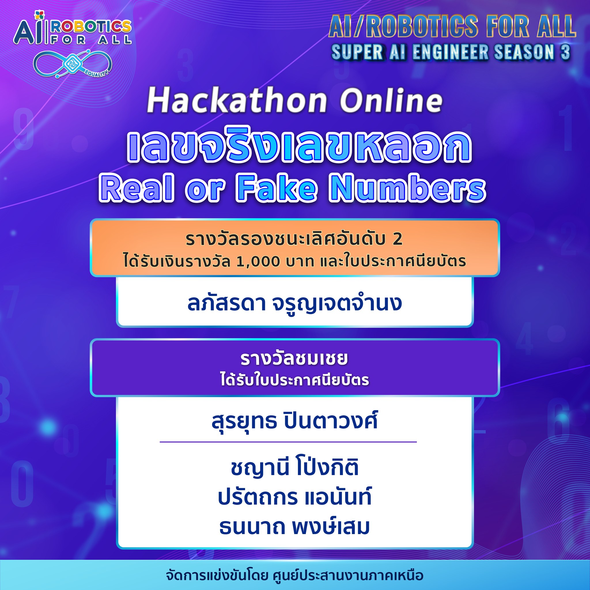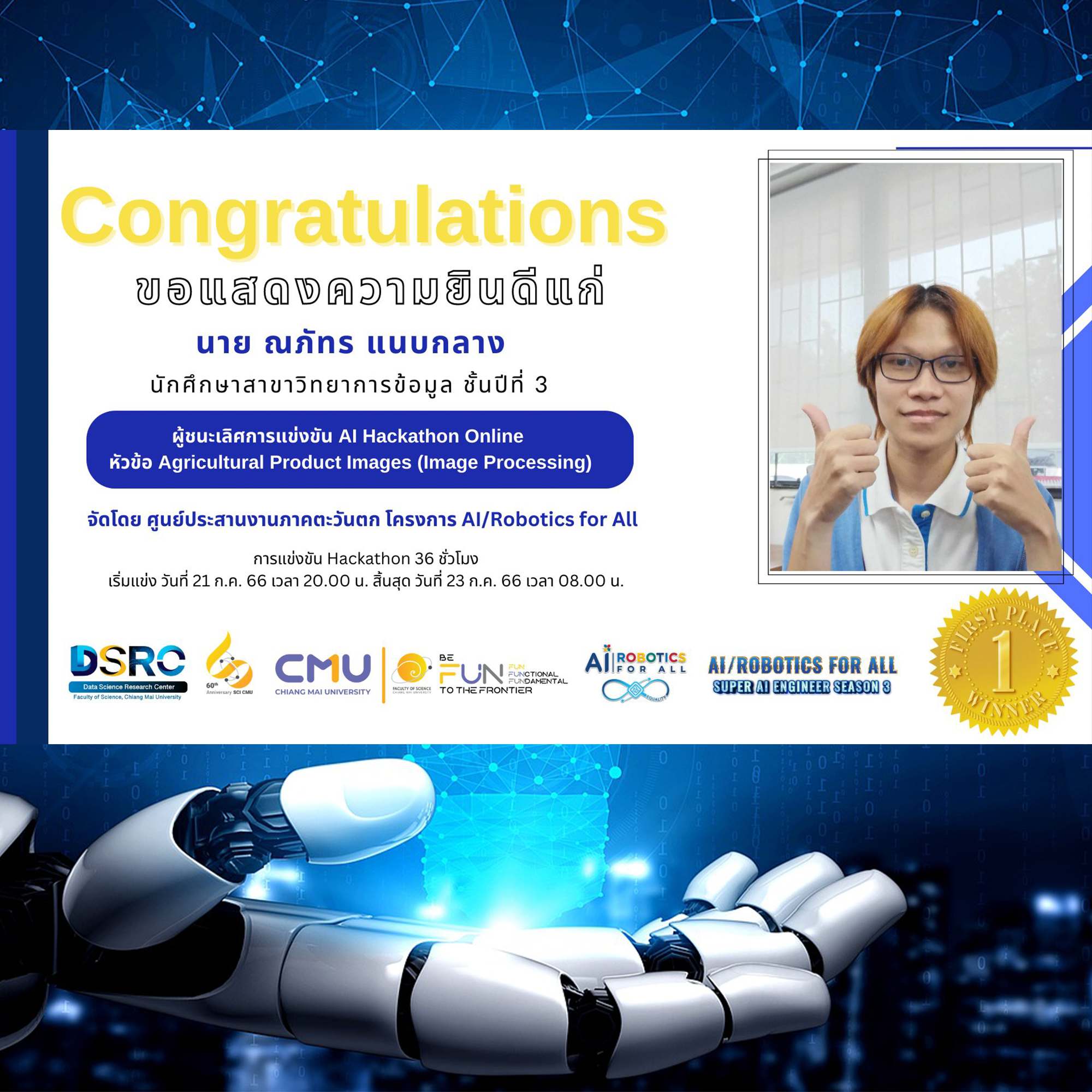 ขอแสดงความยินดีกับทีมนักศึกษาสาขาวิชาวิทยาการข้อมูล ชั้นปีที่ 3 คณะวิทยาศาสตร์ มช. ที่ได้รับรางวัลชมเชย การแข่งขัน AI-Hackathon Online