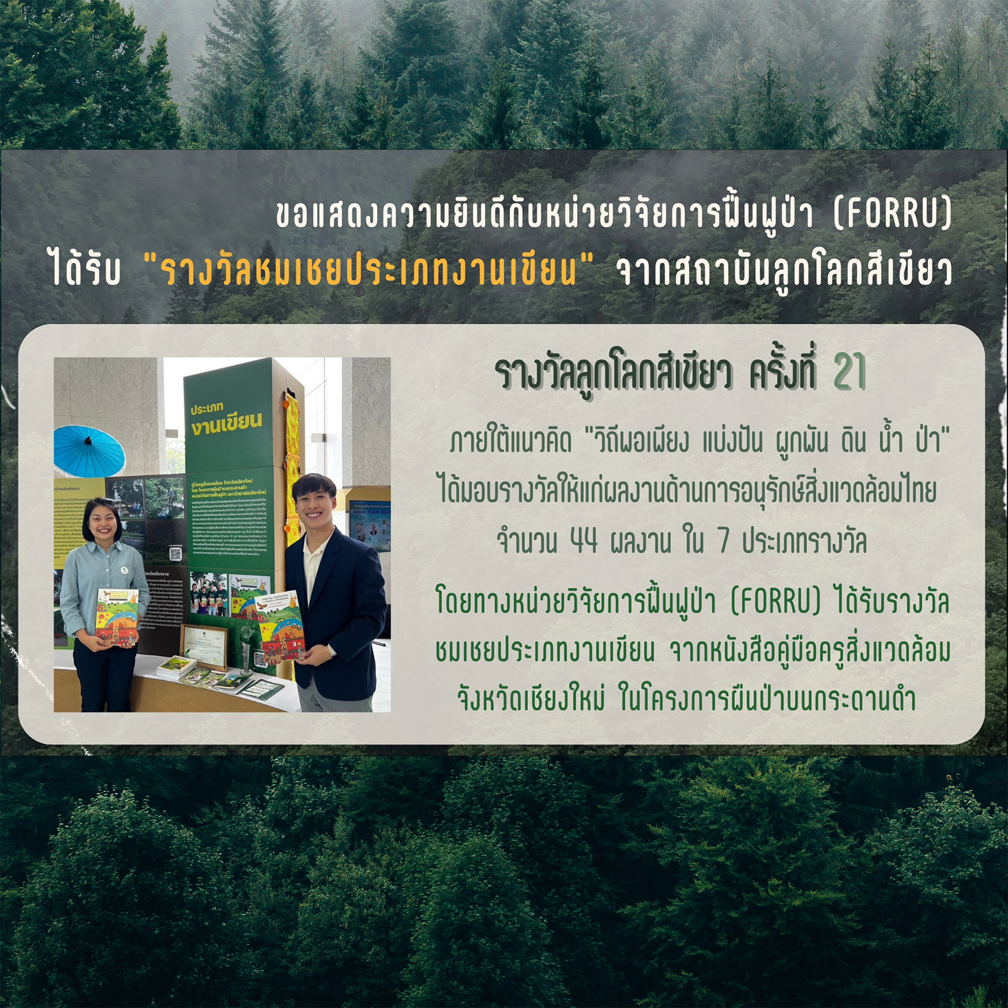 หน่วยวิจัยฟื้นฟูป่า (FORRU) คว้ารางวัลชมเชยประเภทงานเขียน รางวัลลูกโลกสีเขียว ครั้งที่ 21