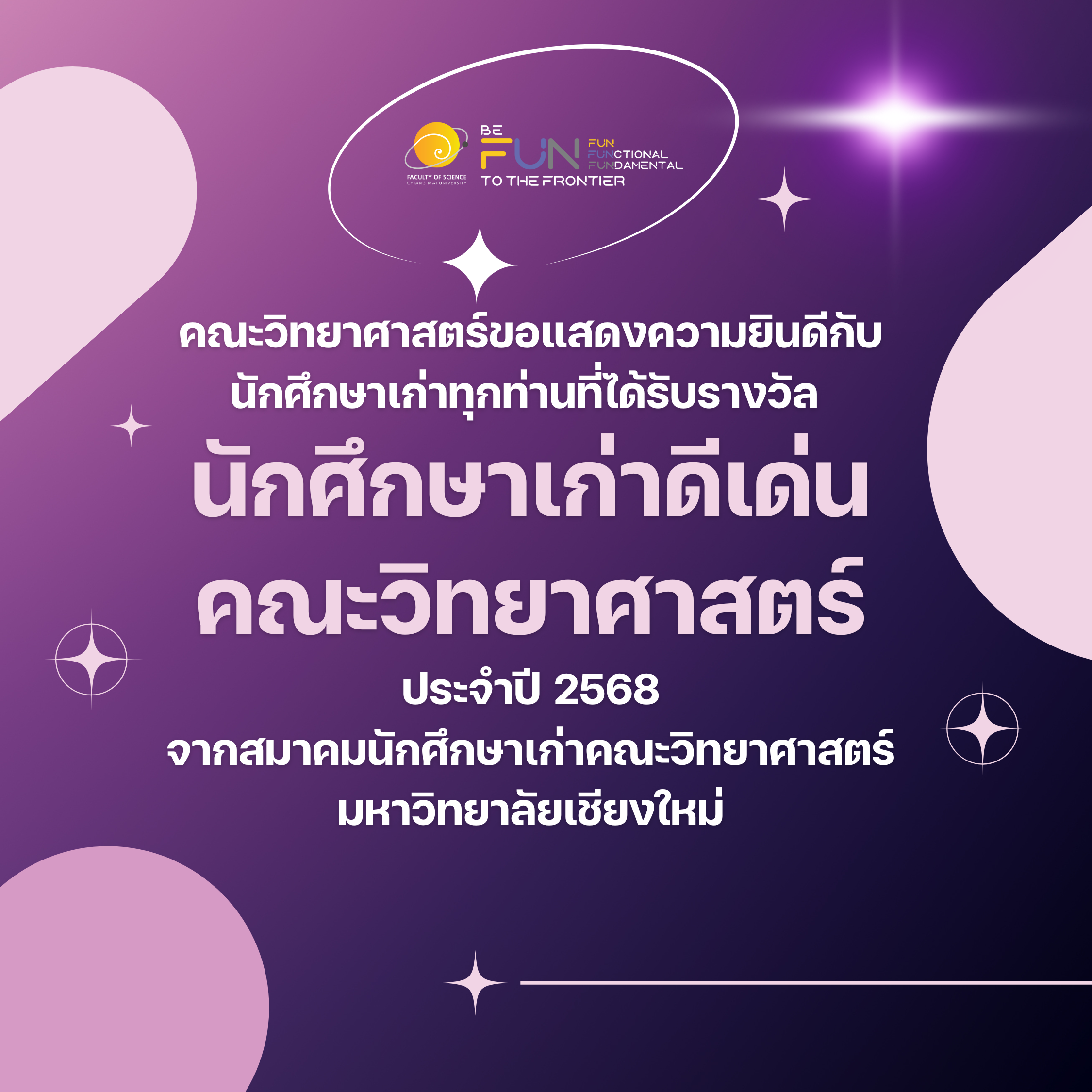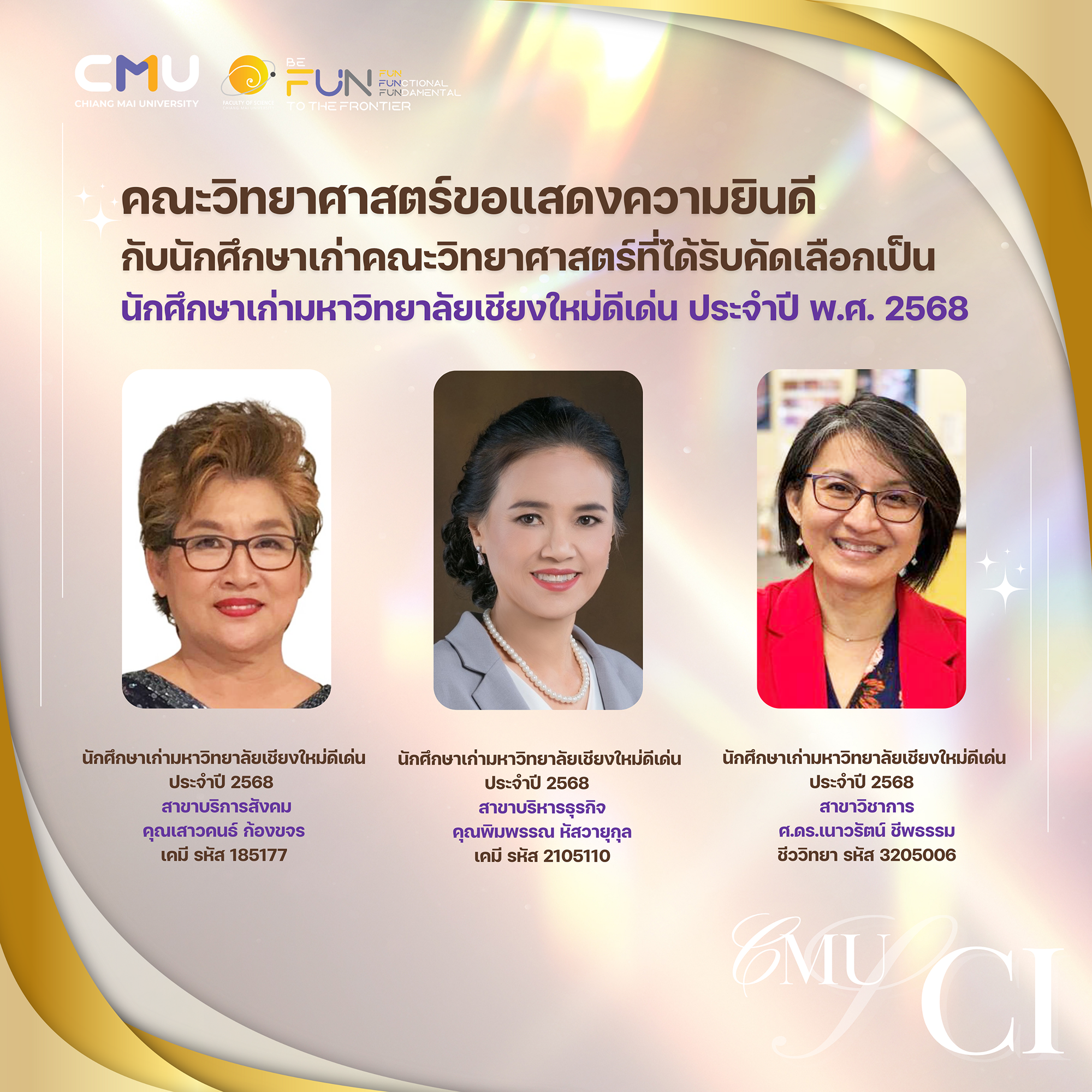 คณะวิทยาศาสตร์ขอแสดงความยินดีกับนักศึกษาเก่าคณะวิทยาศาสตร์ ที่ได้รับคัดเลือกเป็นนักศึกษาเก่ามหาวิทยาลัยเชียงใหม่ดีเด่น ประจำปี พ.ศ. 2568