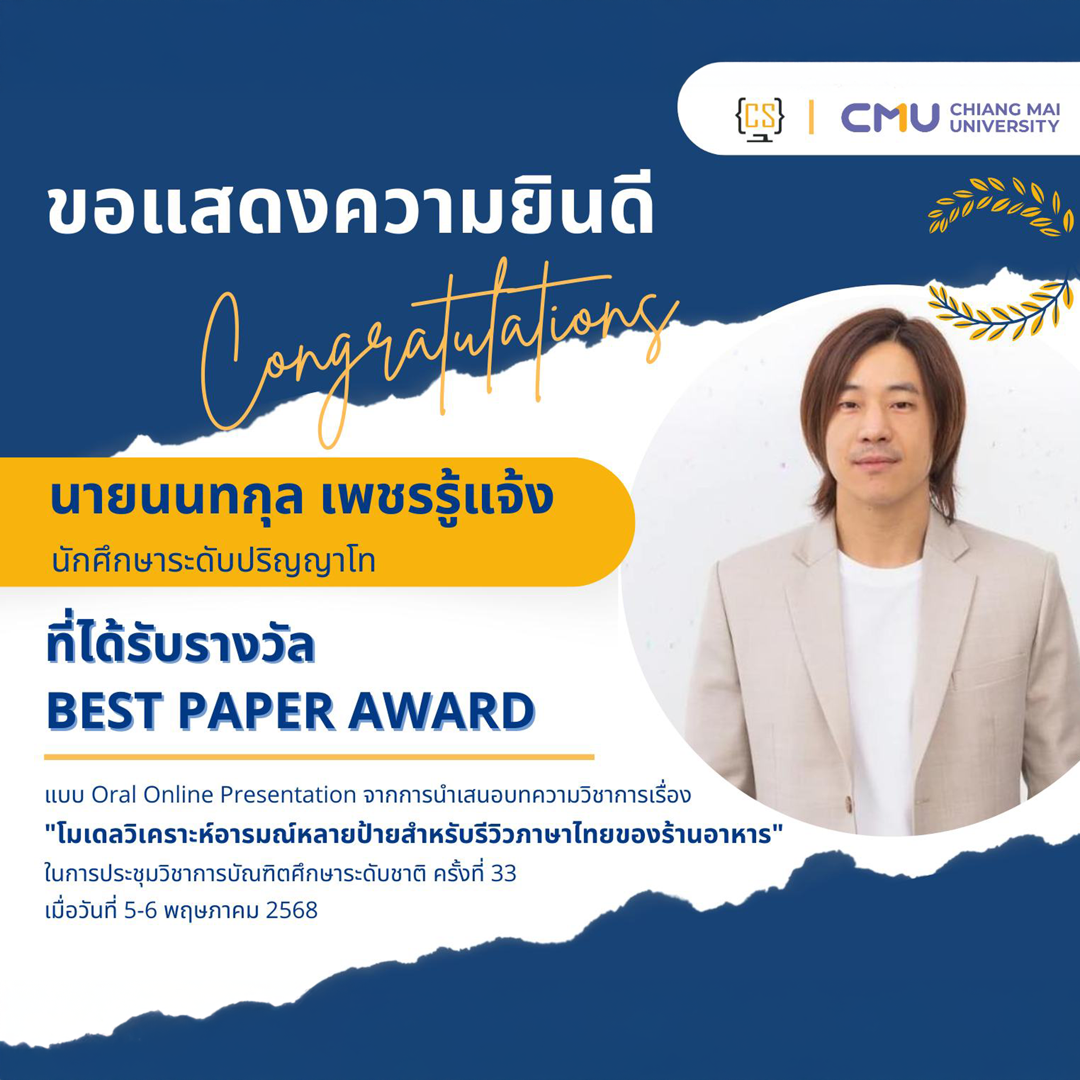 นักศึกษา ป.โท วิทยาการคอมพิวเตอร์ ได้รับรางวัล Best Paper Award ในการประชุมวิชาการบัณฑิตศึกษาระดับชาติ ครั้งที่ 33