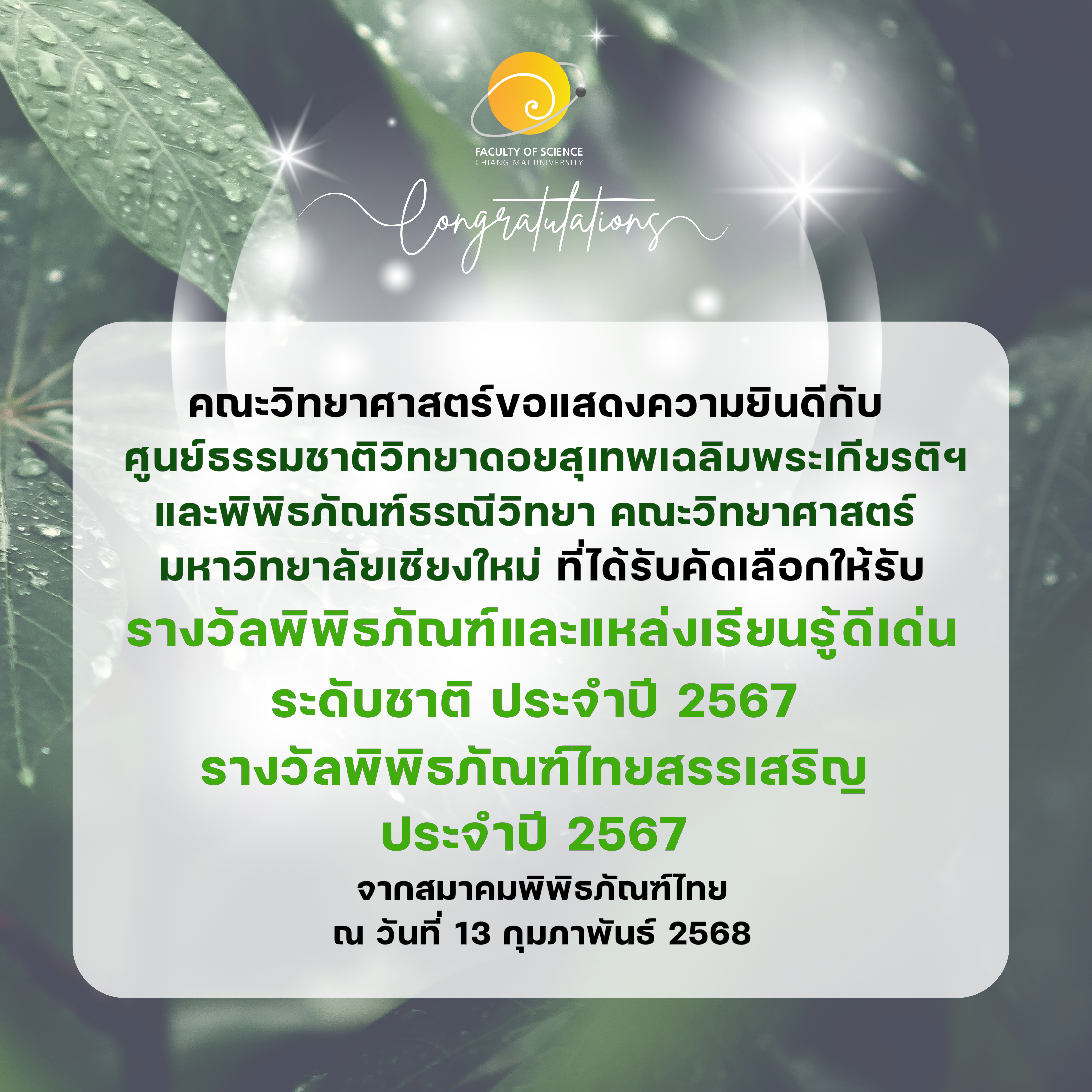ศูนย์ธรรมชาติวิทยาดอยสุเทพเฉลิมพระเกียรติฯ และพิพิธภัณฑ์ธรณีวิทยาได้รับคัดเลือกให้รับรางวัลพิพิธภัณฑ์และแหล่งเรียนรู้ดีเด่นระดับชาติ รางวัลพิพิธภัณฑ์ไทยสรรเสริญ
