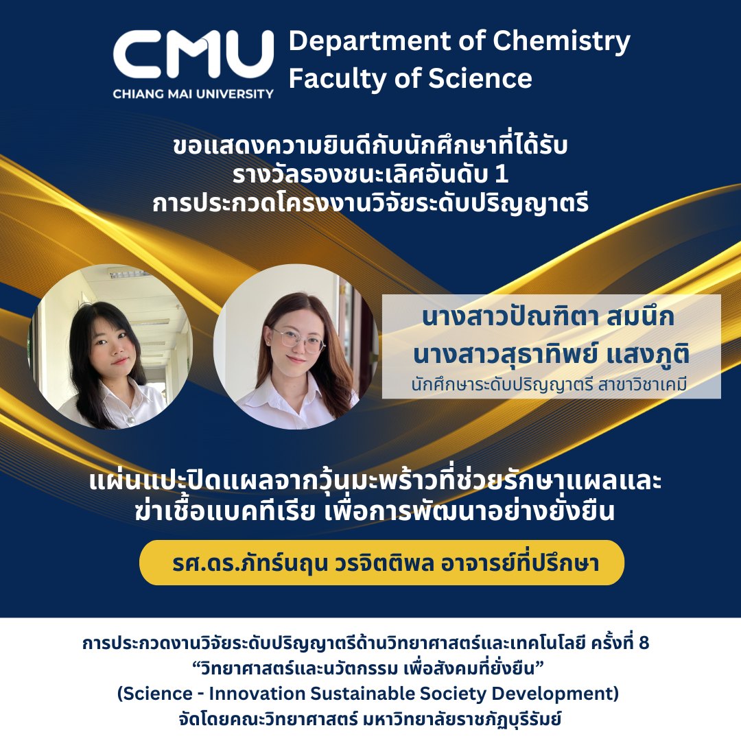 ทีมนักศึกษาเคมี คว้ารางวัลรองชนะเลิศอันดับ 1 การประกวดงานวิจัยระดับปริญญาตรี ด้านวิทยาศาสตร์และเทคโนโลยี ครั้งที่ 8 วิทยาศาสตร์และนวัตกรรม เพื่อสังคมที่ยั่งยืน