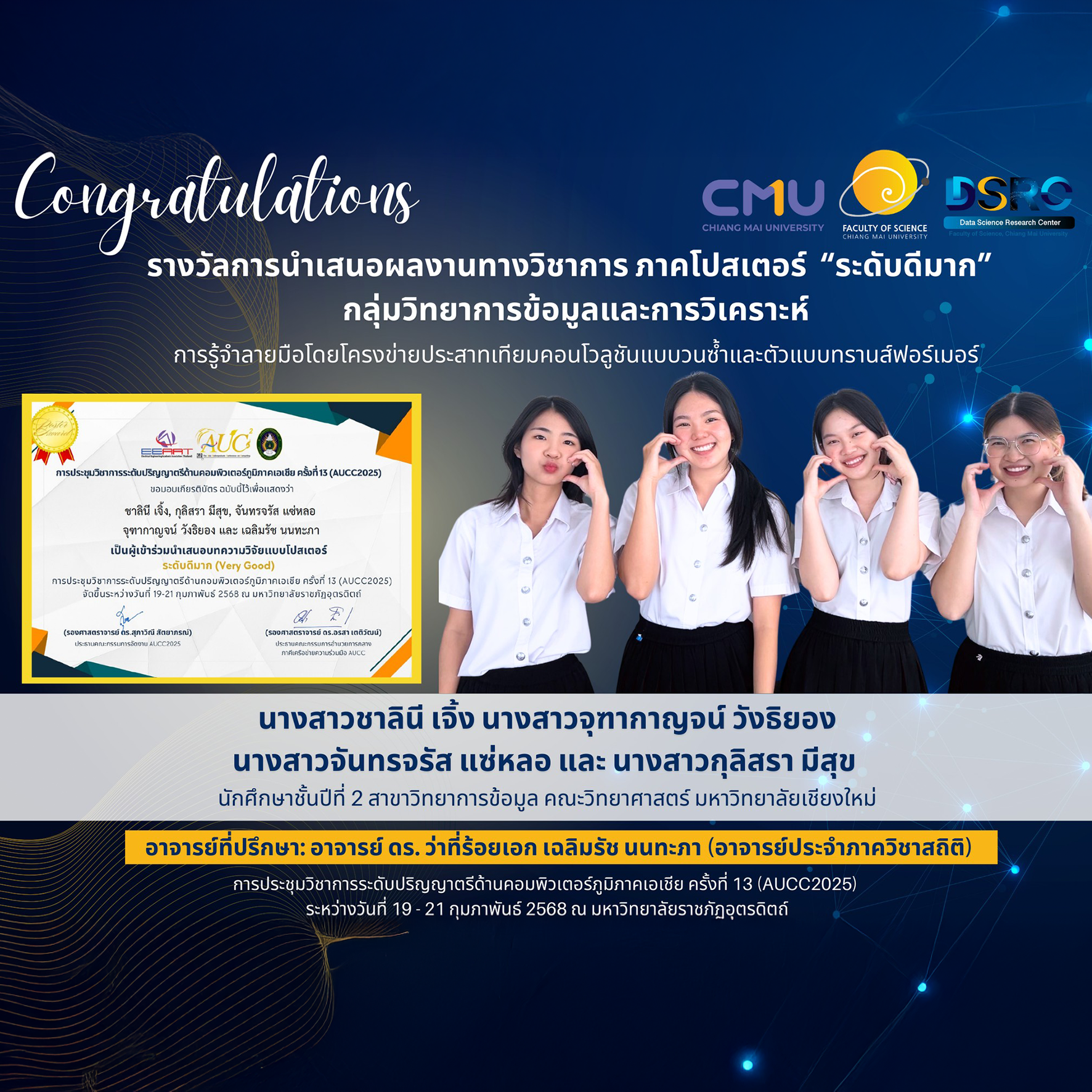 นักศึกษาสาขาวิทยาการข้อมูล คว้ารางวัลการนำเสนอผลงานทางวิชาการ ภาคโปสเตอร์ ระดับดีมาก กลุ่มวิทยาการข้อมูลและการวิเคราะห์