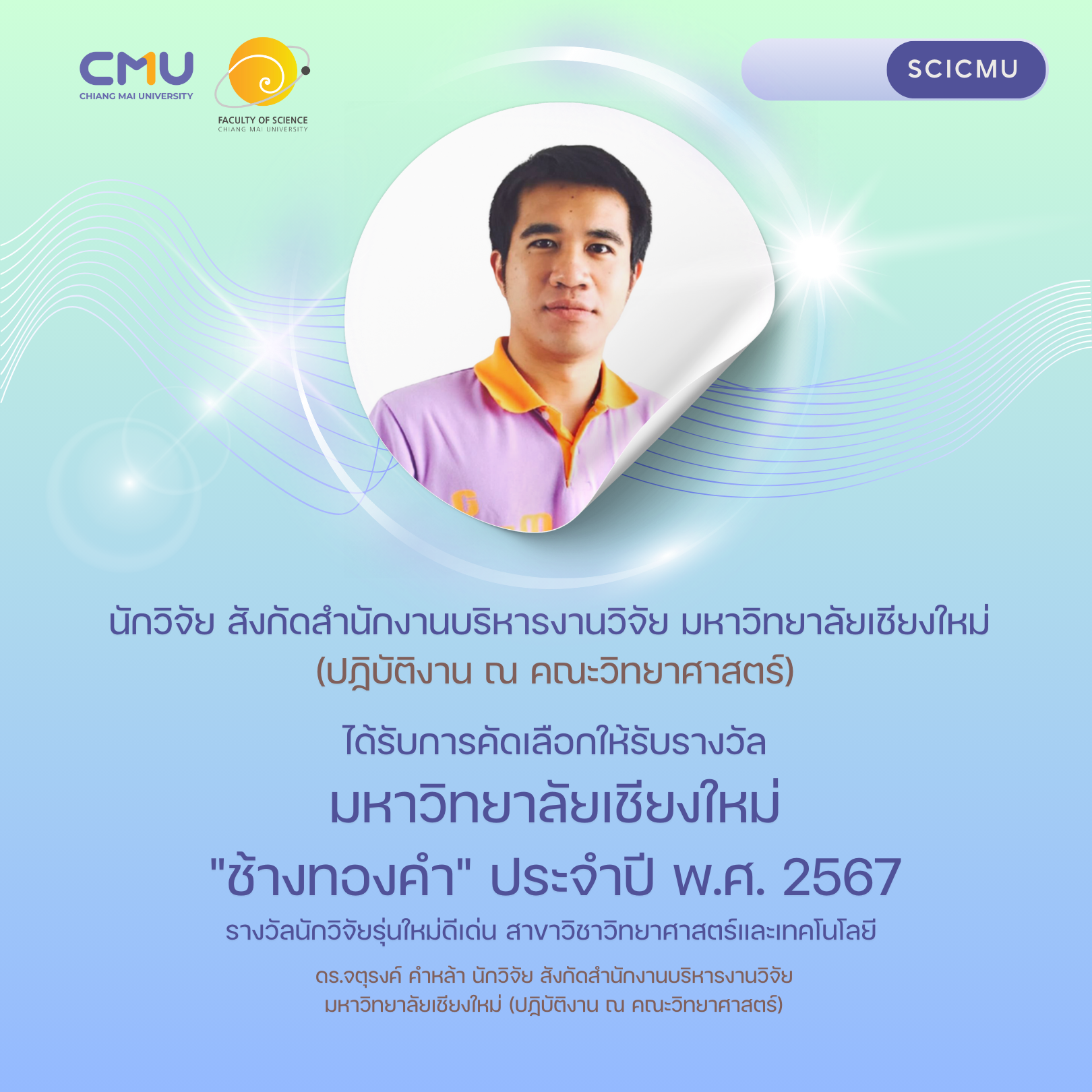 นักวิจัย สังกัดสำนักงานบริหารงานวิจัย มช. (ปฏิบัติงาน ณ คณะวิทยาศาสตร์) ได้รับการคัดเลือกให้รับรางวัลมหาวิทยาลัยเชียงใหม่ ช้างทองคำ ประจำปี พ.ศ. 2567