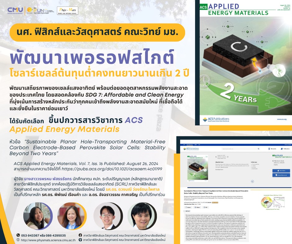 นักศึกษาภาควิชาฟิสิกส์และวัสดุศาสตร์ คณะวิทยาศาสตร์ มหาวิทยาลัยเชียงใหม่ พัฒนาเพอรอฟสไกต์โซลาร์เซลล์ต้นทุนต่ำ คงทนยาวนานเกิน 2 ปี