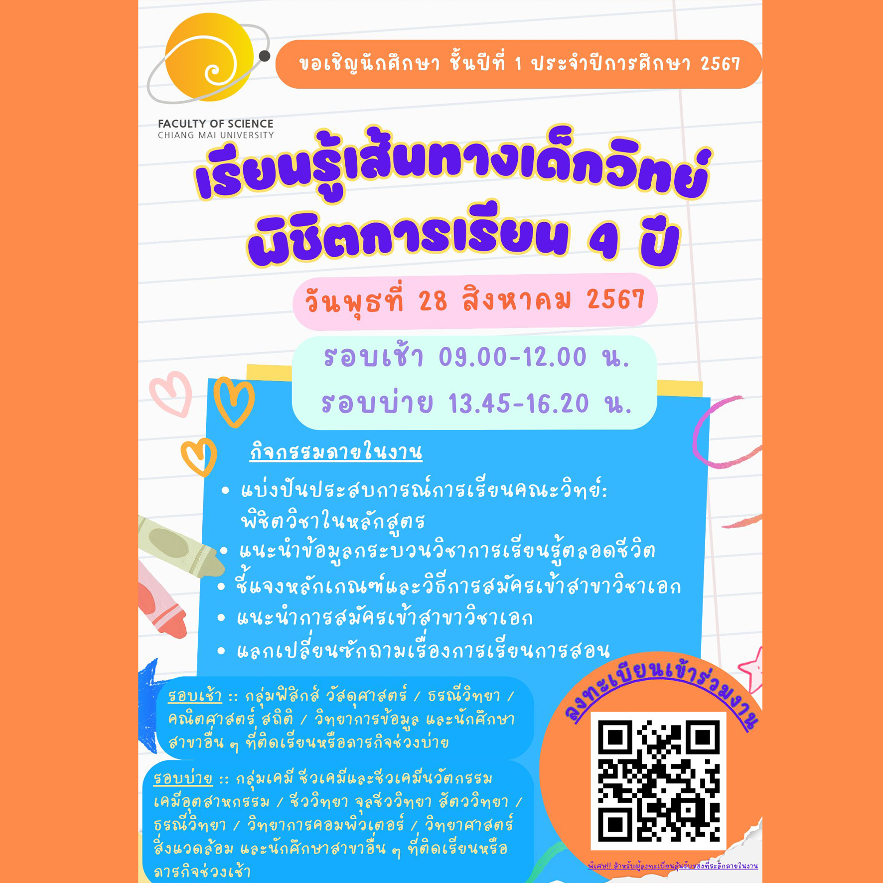 ขอเชิญนักศึกษาปริญญาตรีชั้นปีที่ 1 ปีการศึกษา 2567 เข้าร่วมกิจกรรม เรียนรู้เส้นทางเด็กวิทย์ พิชิตการเรียน 4 ปี